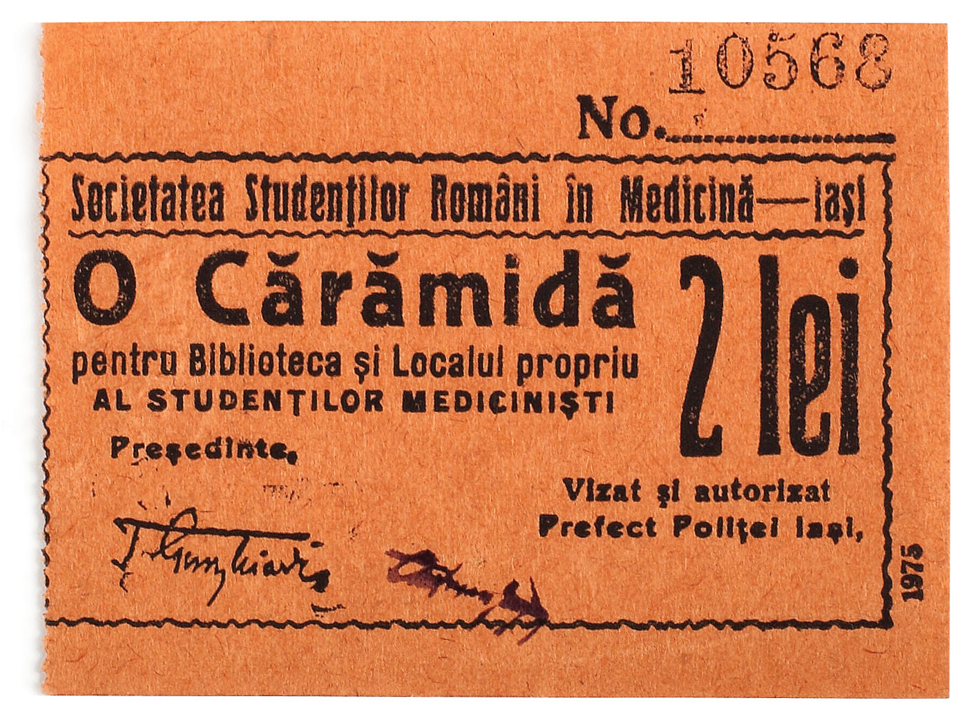 193. Bon de donație ”O cărămidă” de 2 lei pentru construirea Bibliotecii și Localului propriu al Studenților Mediciniști emis de Societatea Studenților Români în Medicină Iași