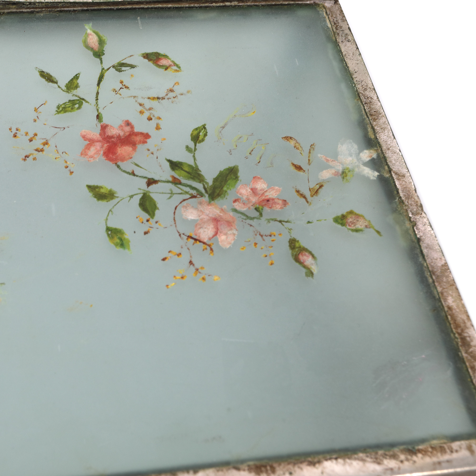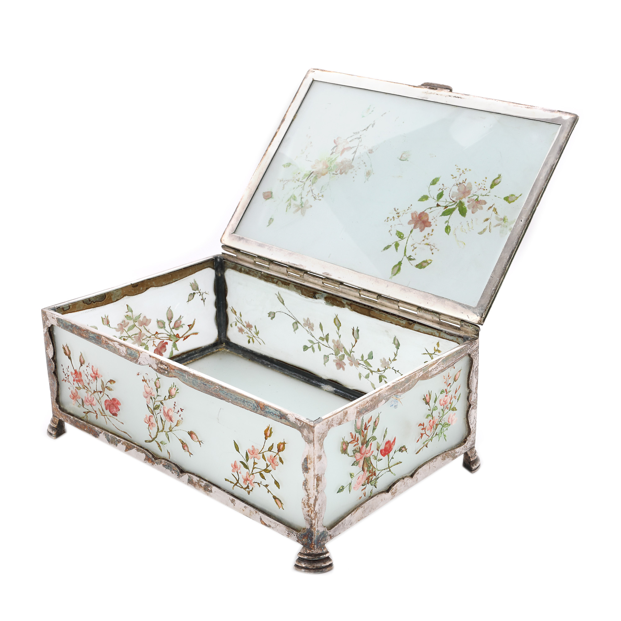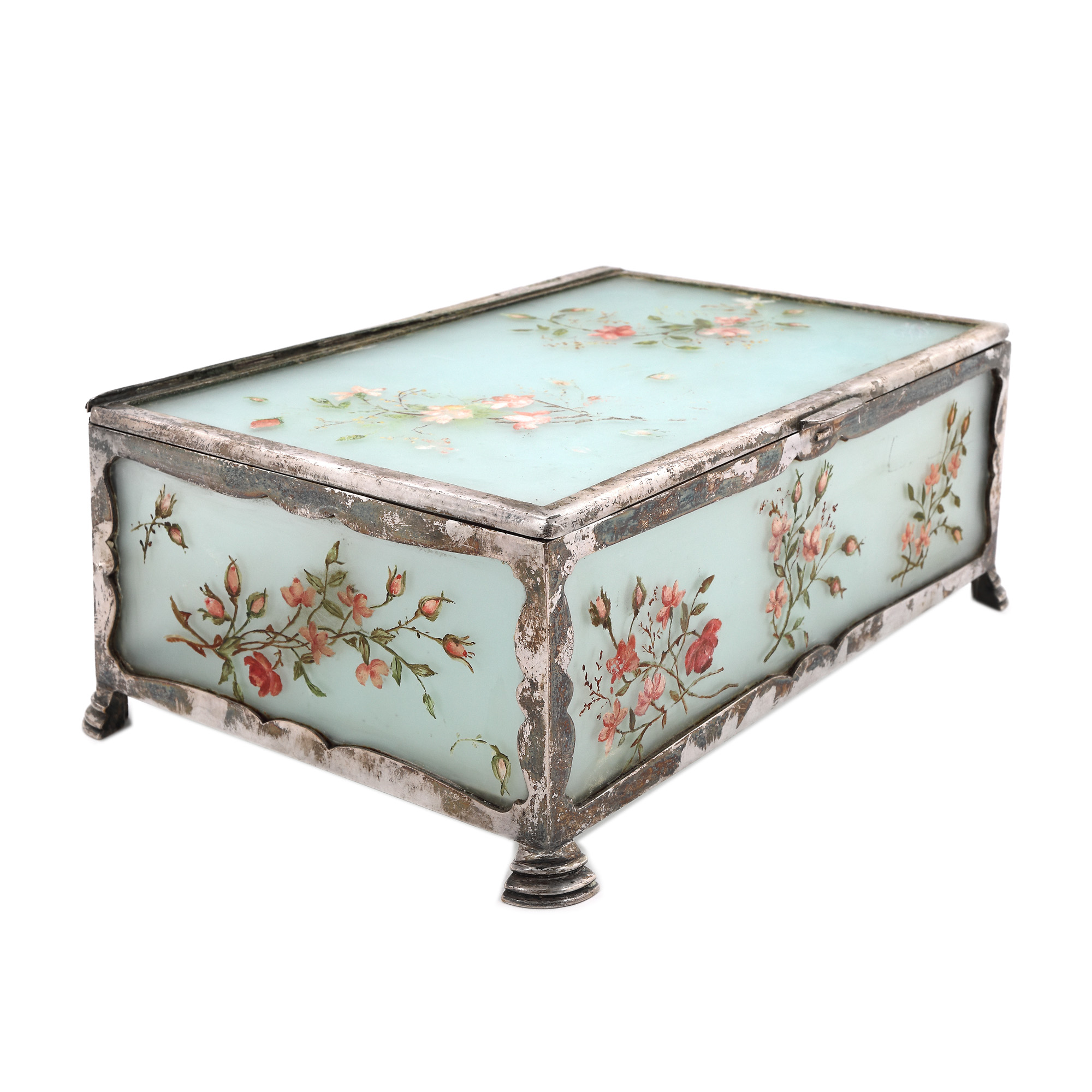 116. Cutie pentru bijuterii din sticlă, cu decor floral pictat manual, începutul sec. XX