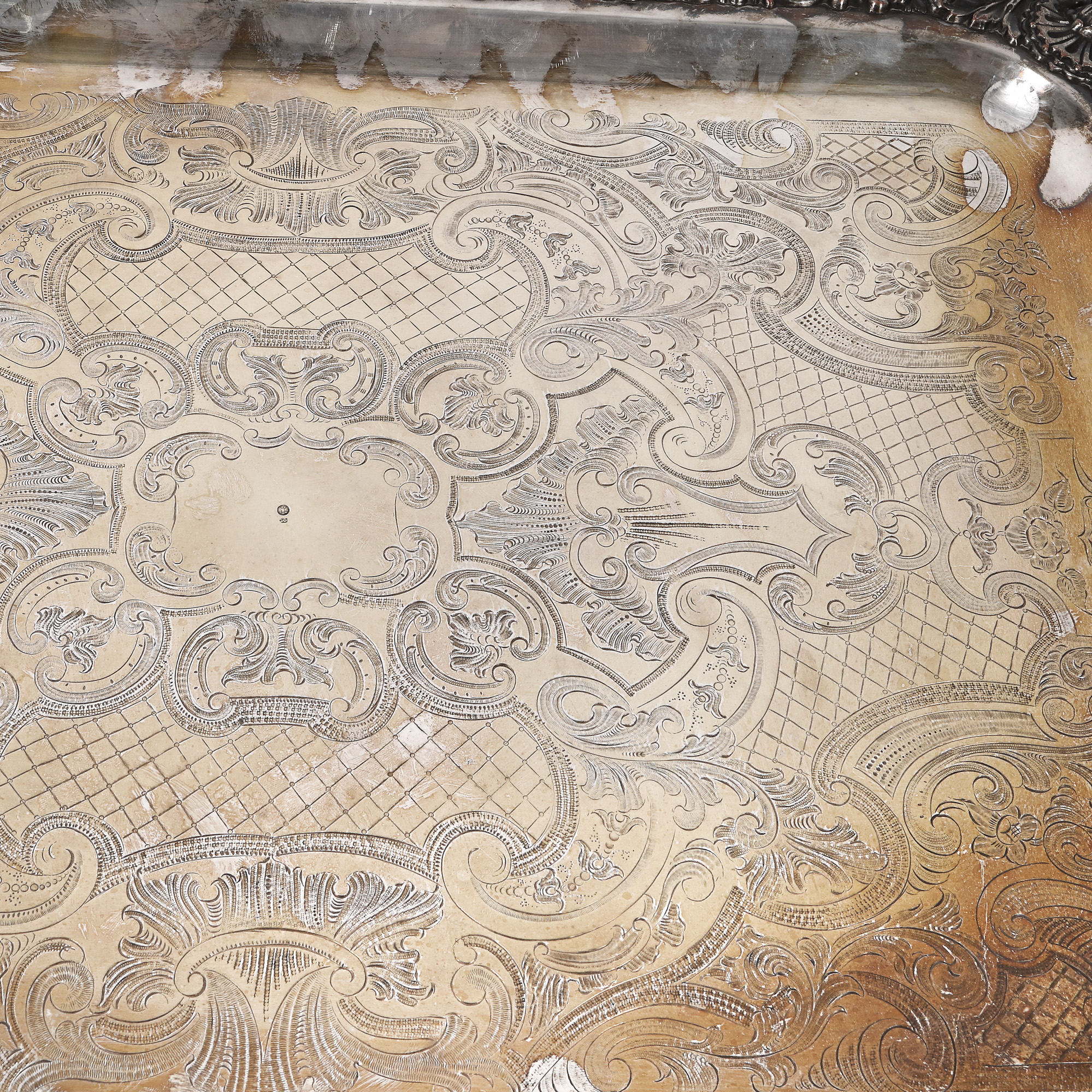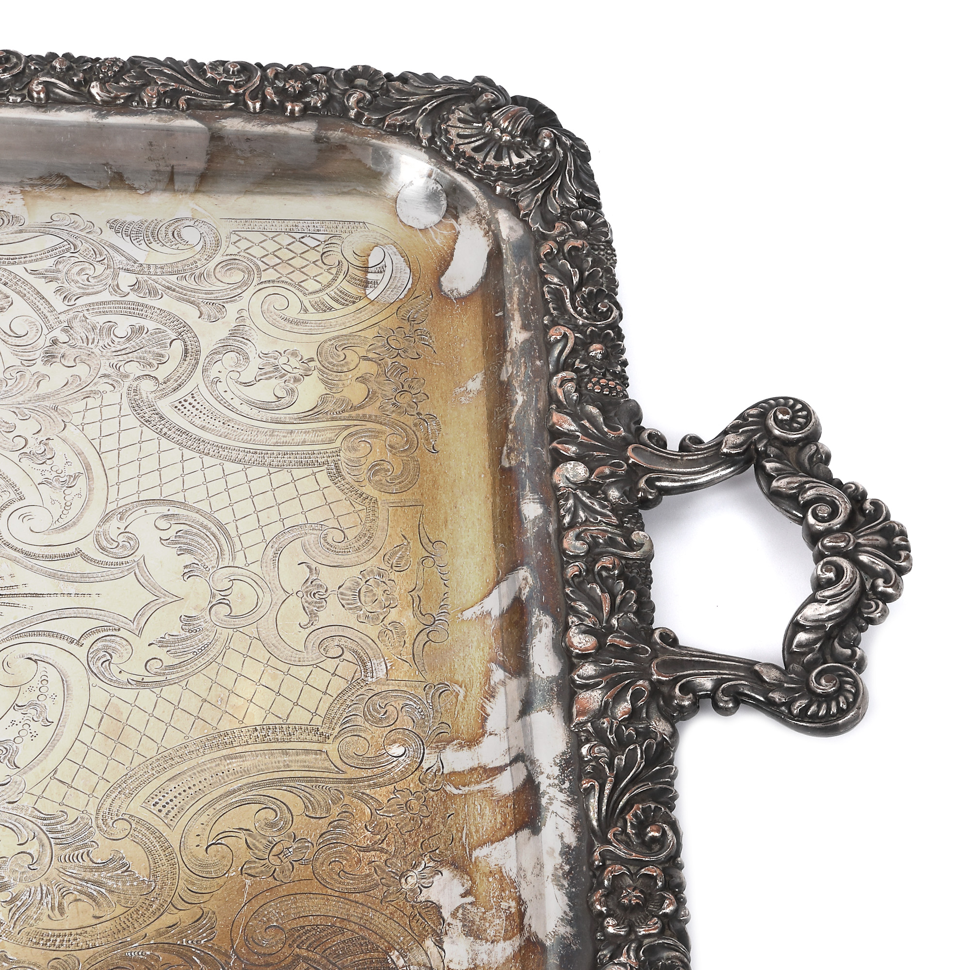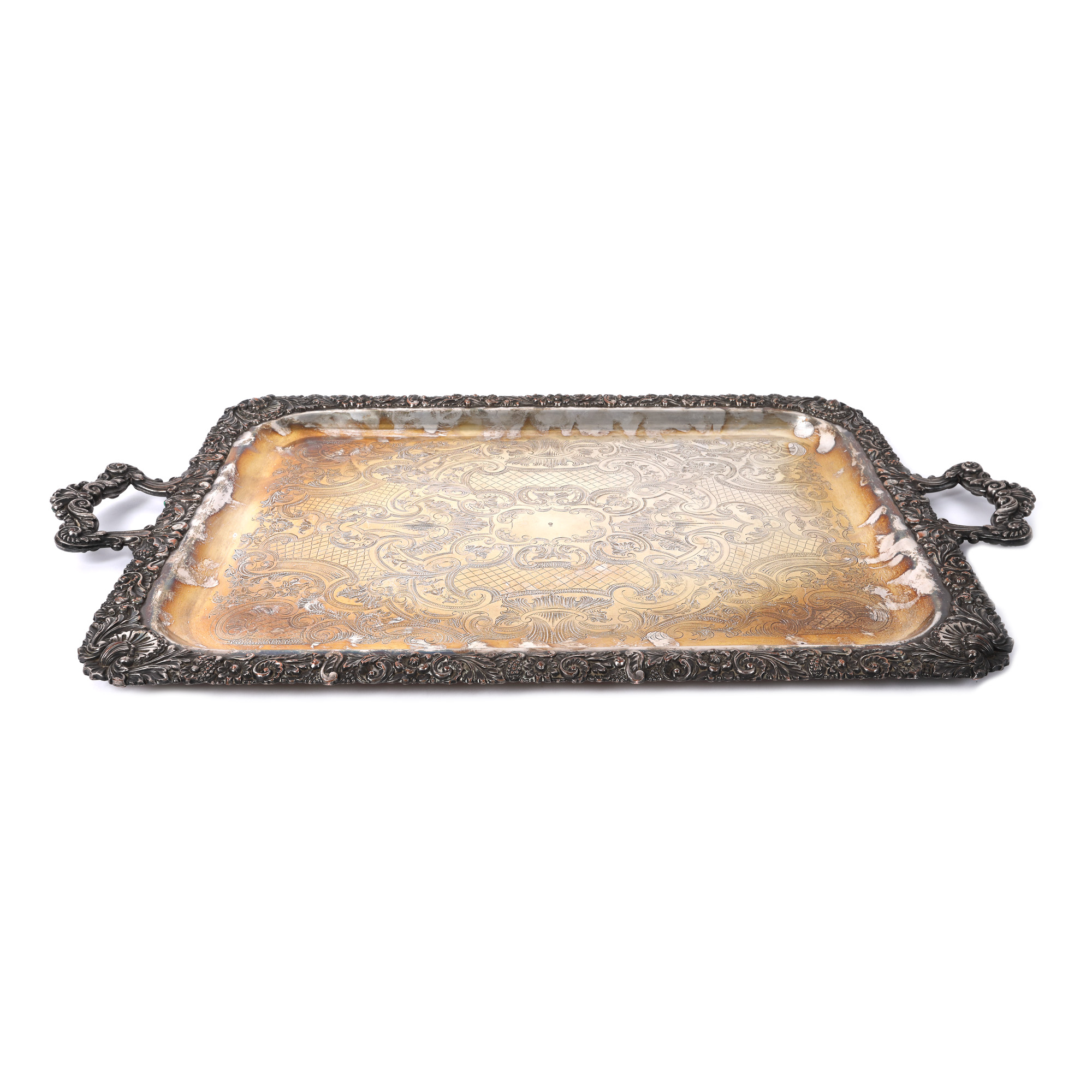 153. Monumentală tavă cu anse, cu bogat decor floral-vegetal, sfârșitul sec. XIX