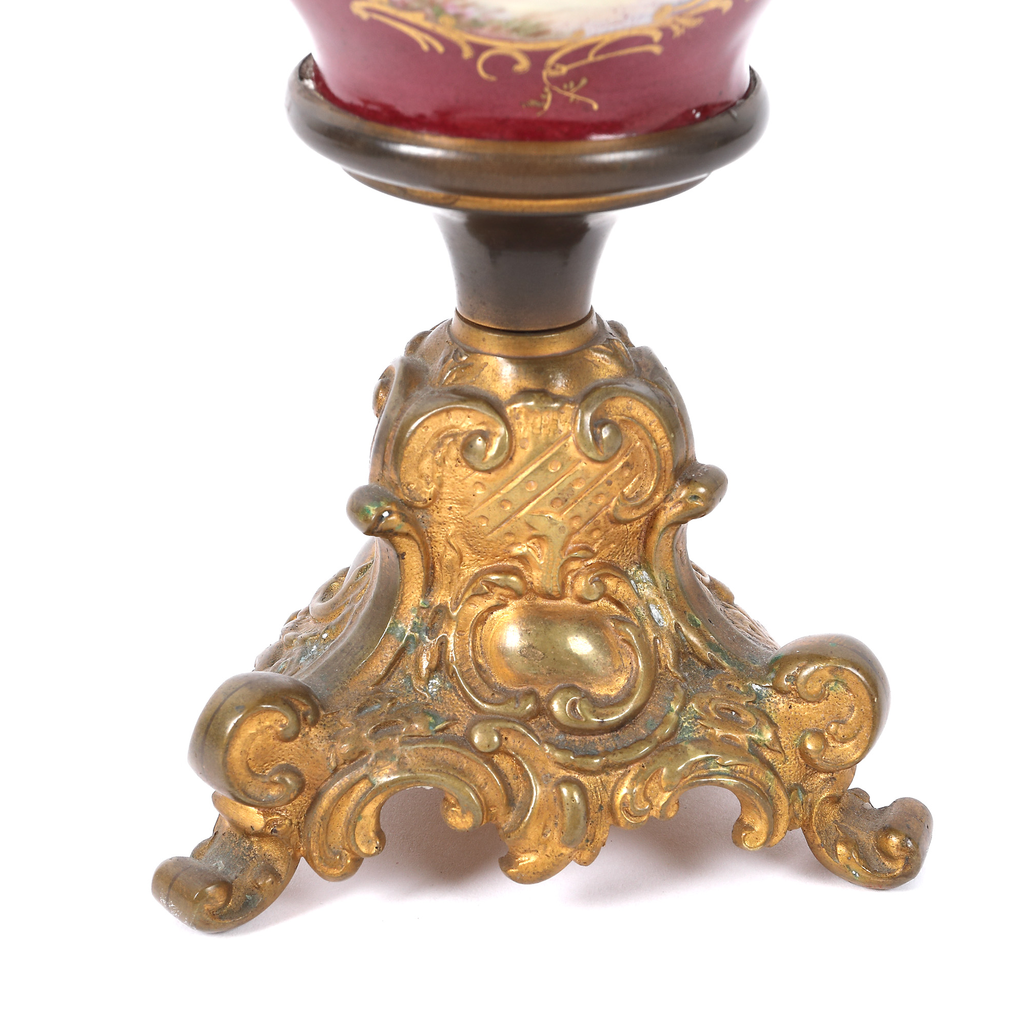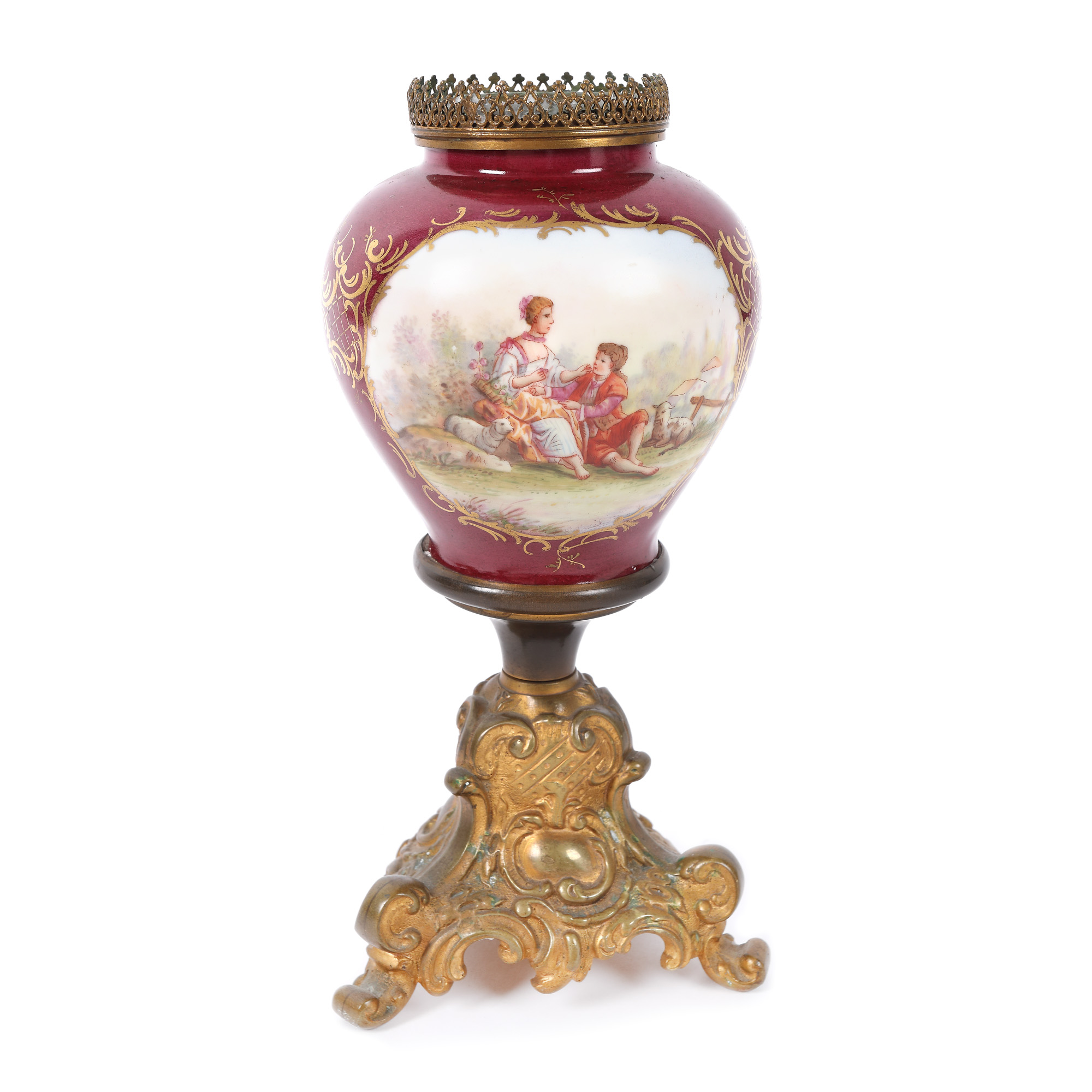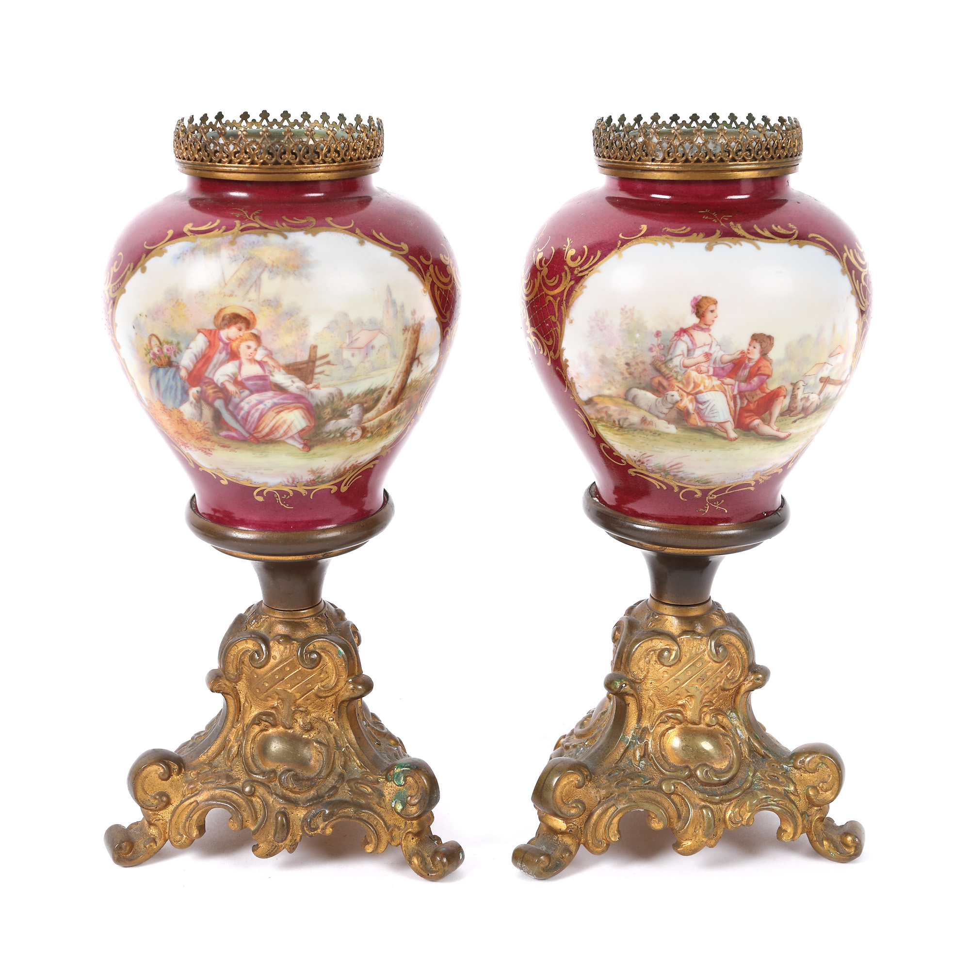 183. Pereche de sfeșnice cu o lumină, din porțelan și bronz, decorate cu scenă galantă [Sec. XX]