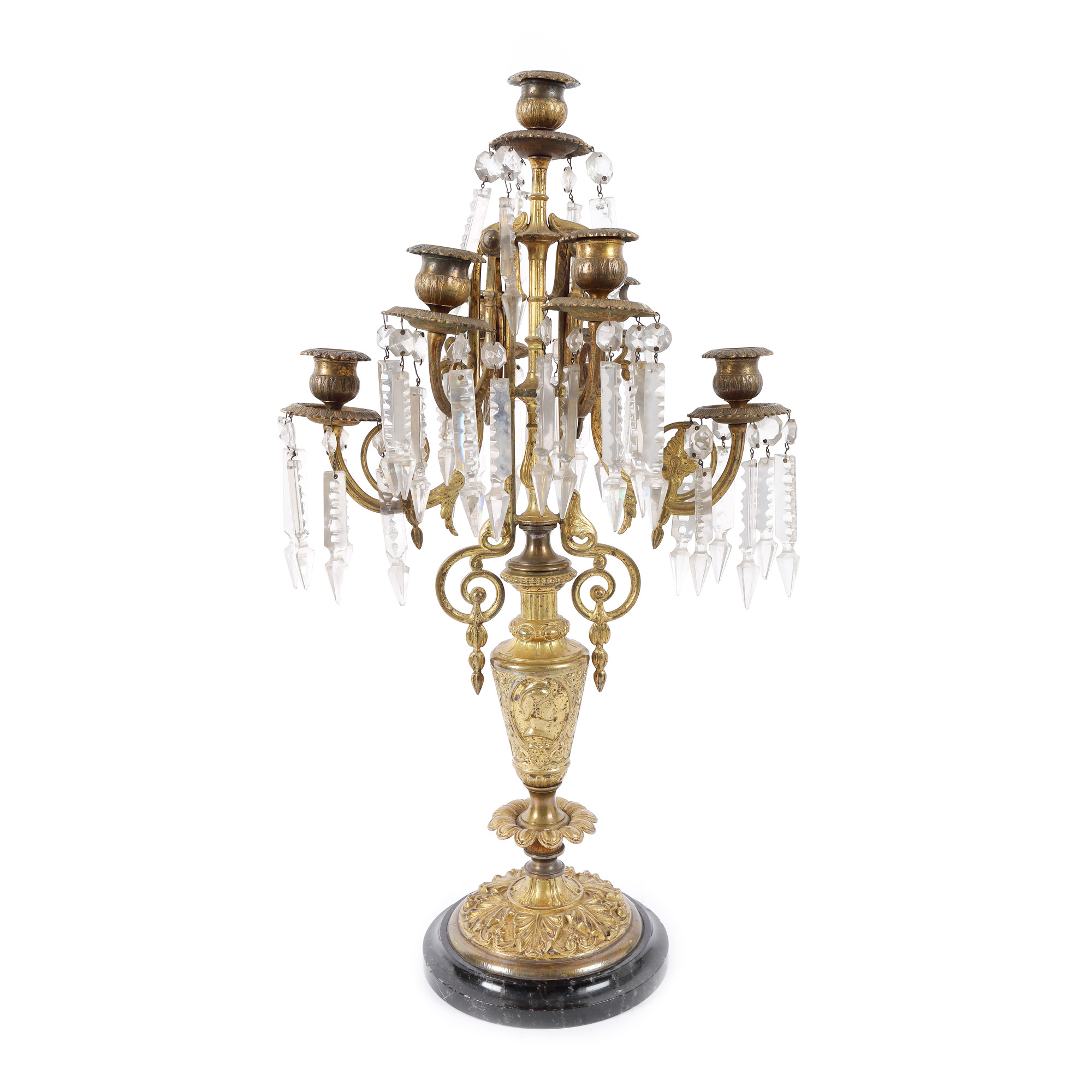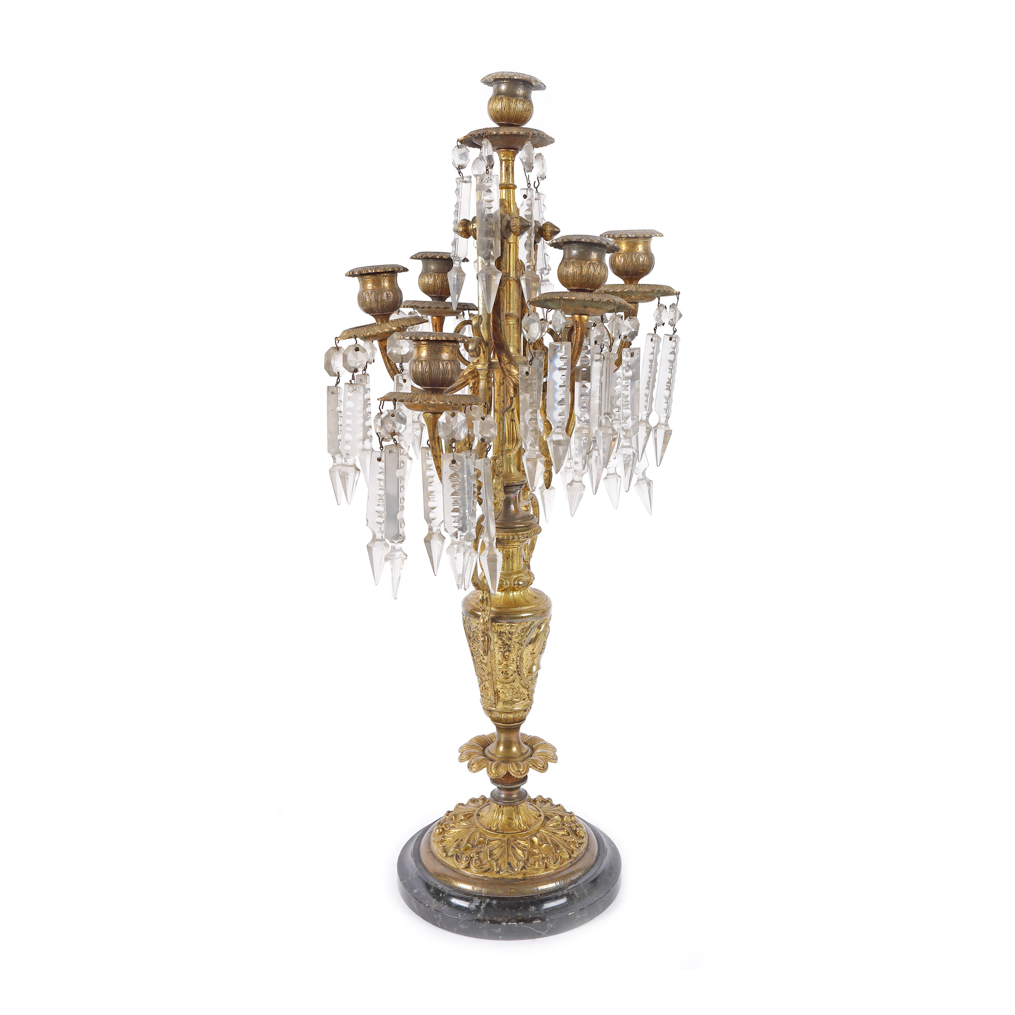 119. Pereche de sfeșnice din bronz în manieră Napoleon III, cu postament din marmură, ornat cu decorațiuni din cristal, sec. XIX