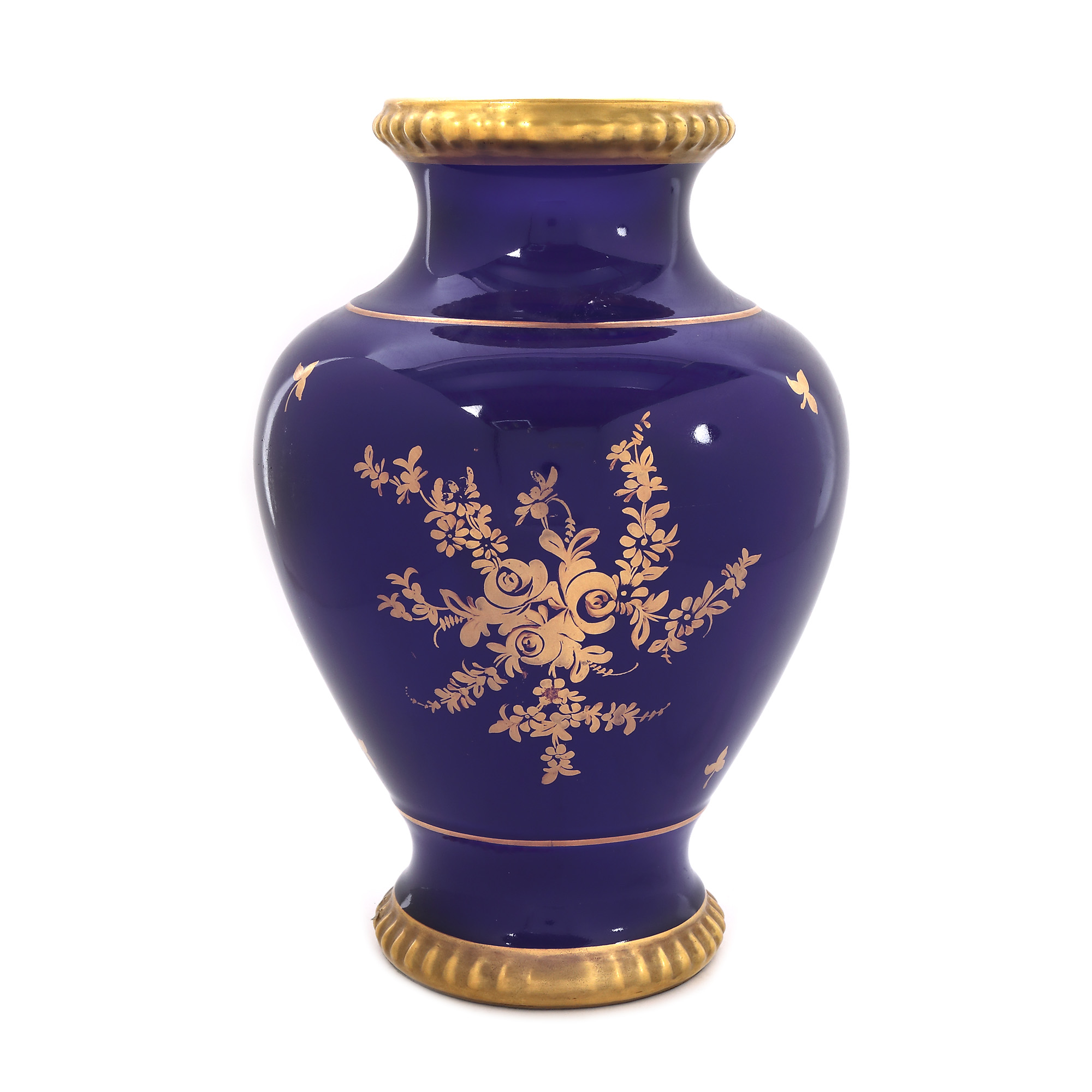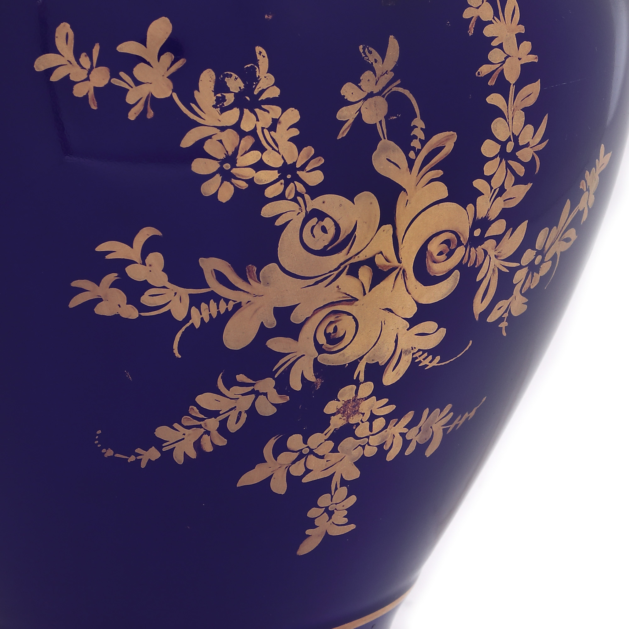 162. Pereche de vase din porțelan cobalt și bronz dore, decorat cu flori [A doua jumătate a sec. XX]
