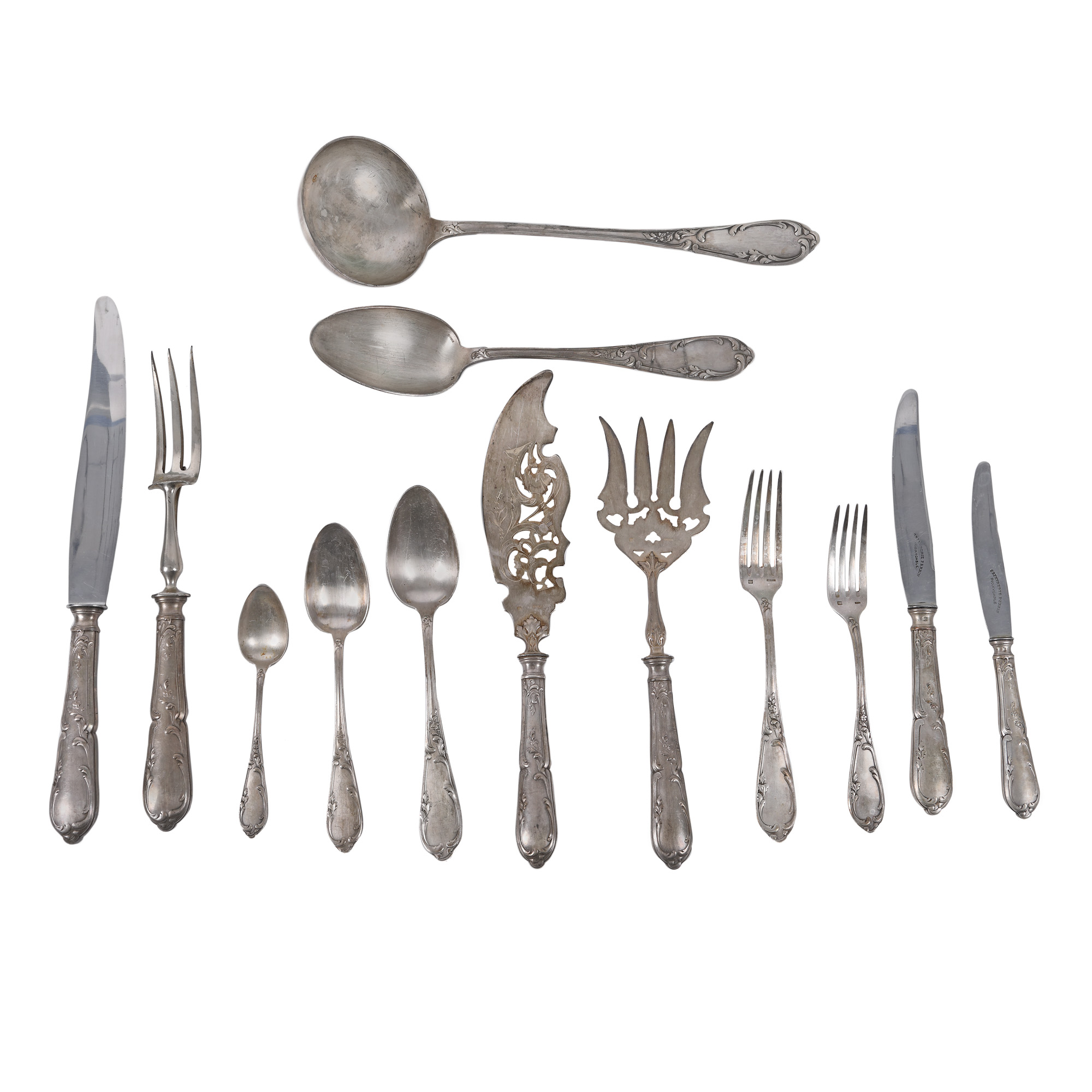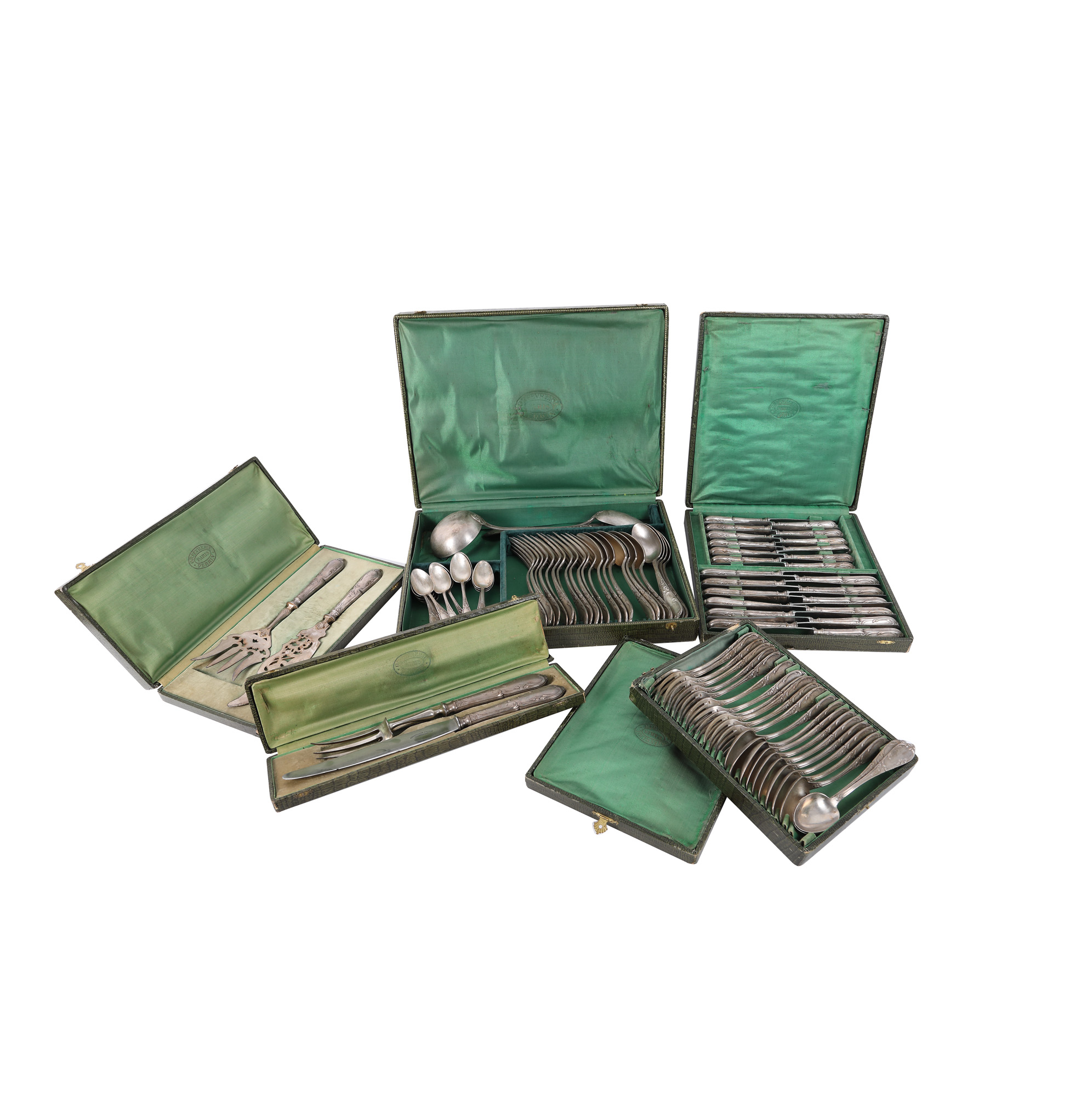 214. Serviciu de masă format din 88 de piese, realizate de orfevrăria Claude Perrin, cca. 1930-1950, însoțit de cutiile originale