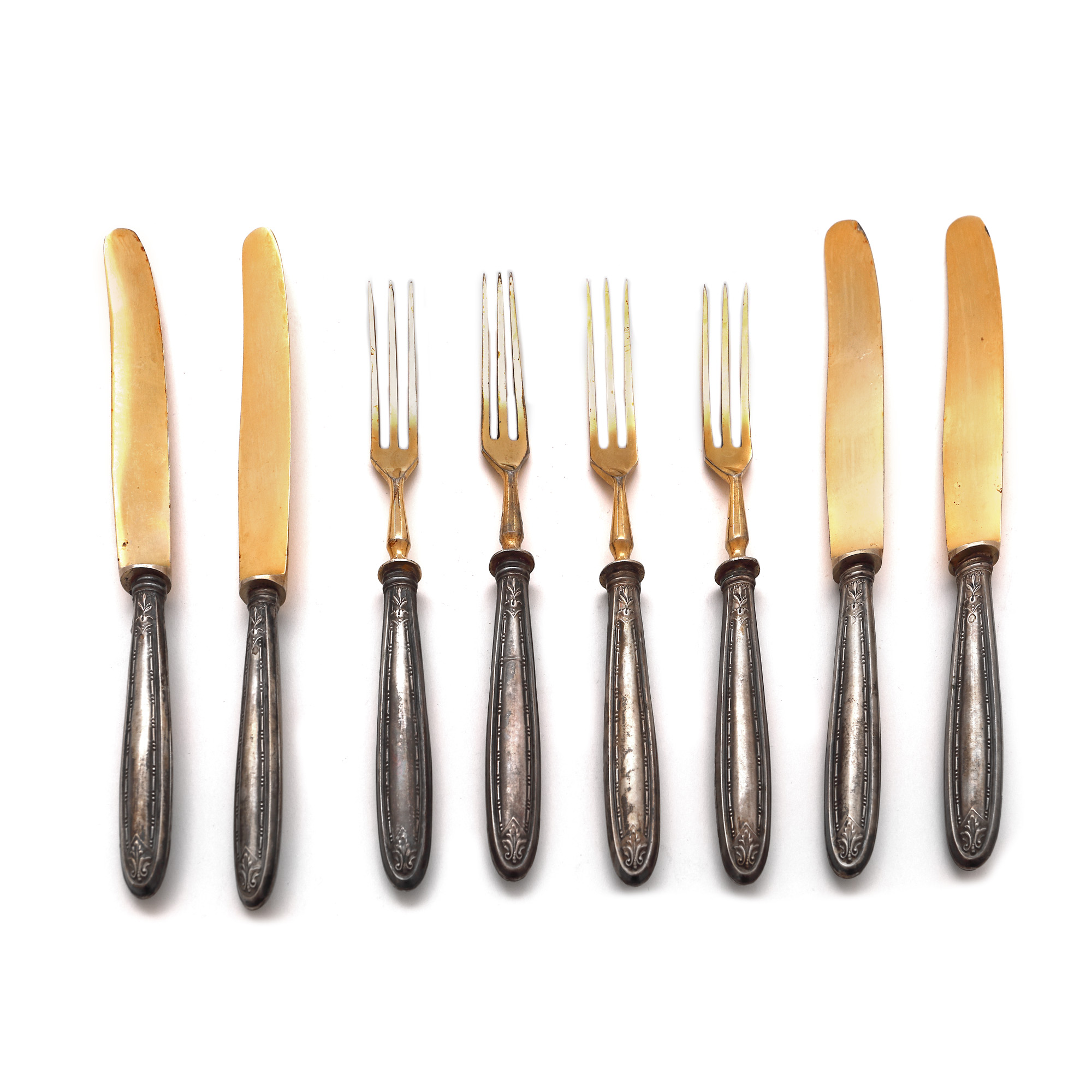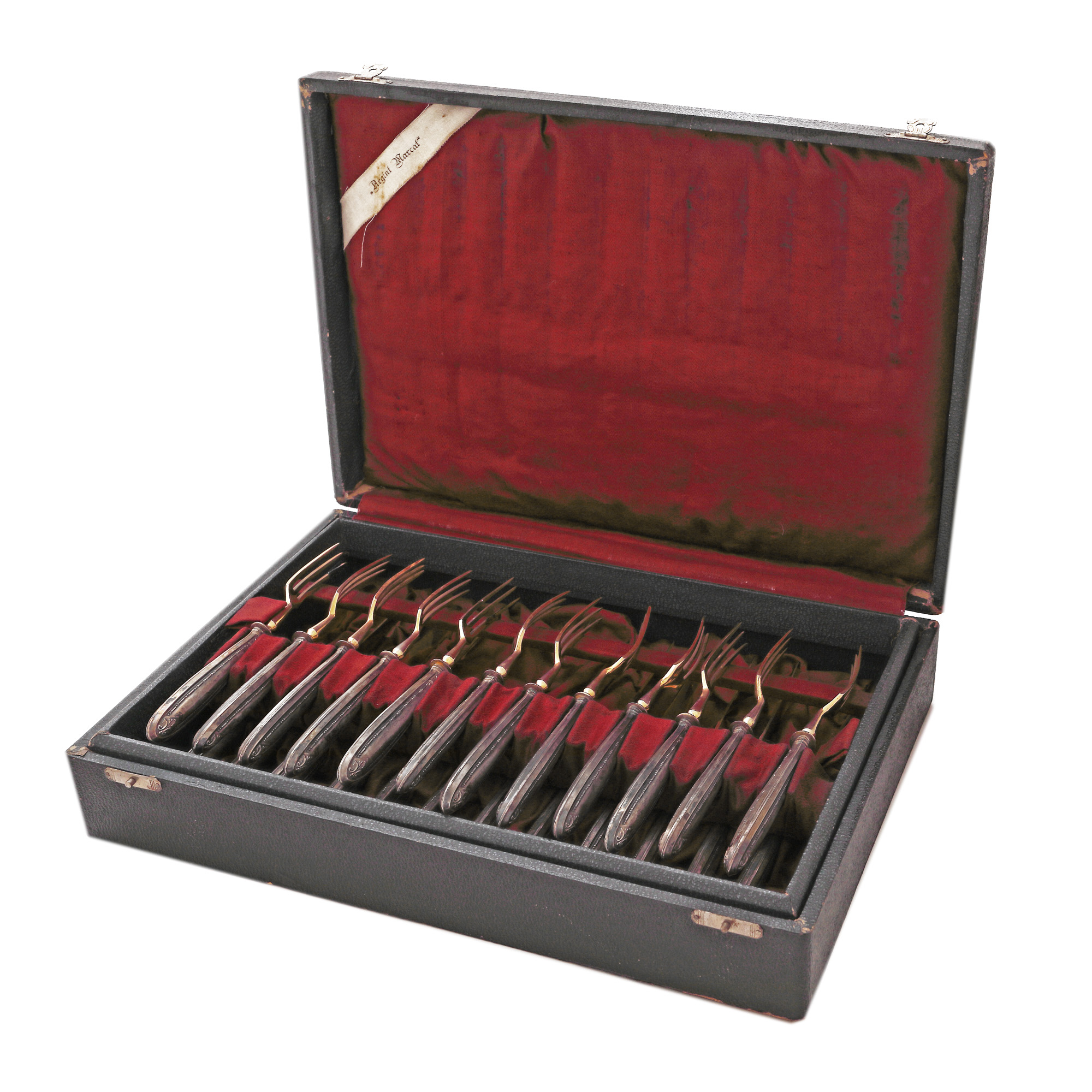 110. Serviciu de tacâmuri din argint în stil Neoclasic, format din 12 furculițe pentru fructe, cca. 1910, însoțit de cutie originală