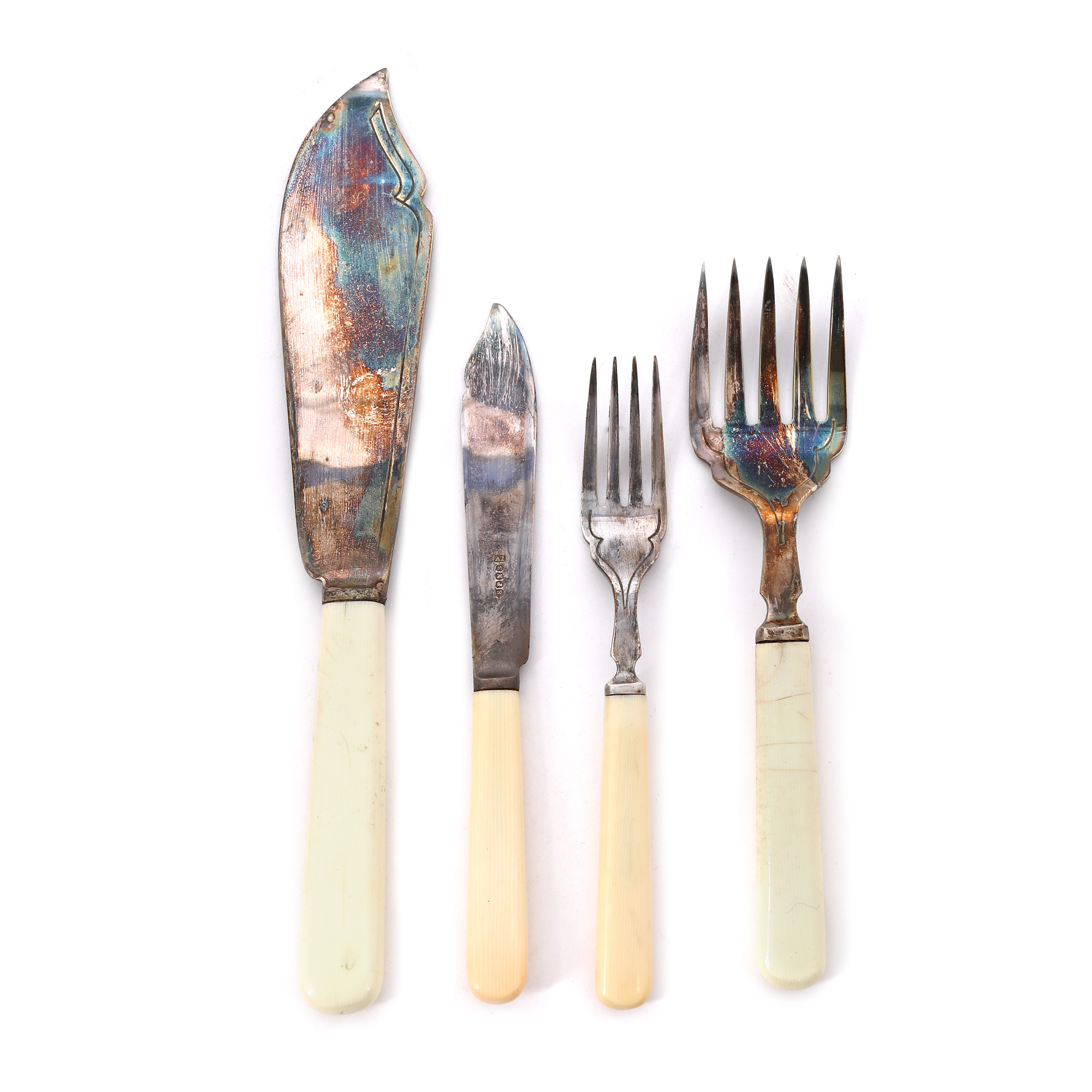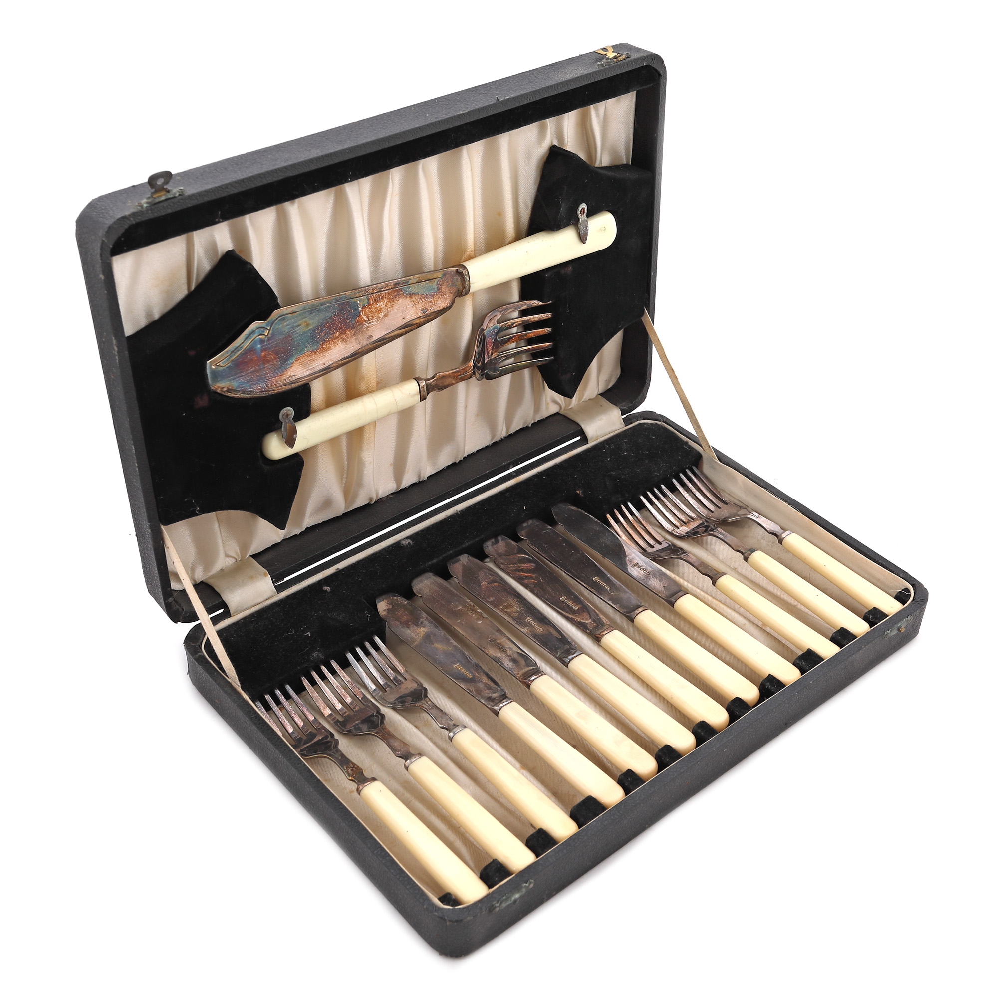 73. Serviciu de tacâmuri pentru șase persoane, pentru desert, cu decor gravat, cca. 1900, însoțit de cutie originală