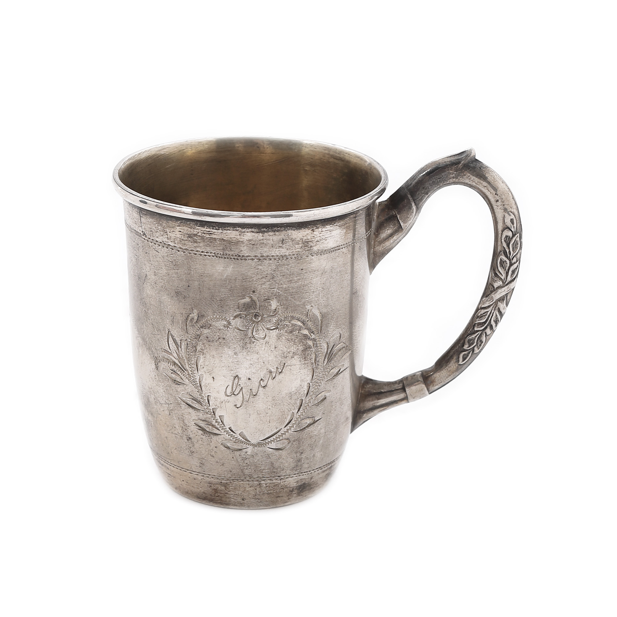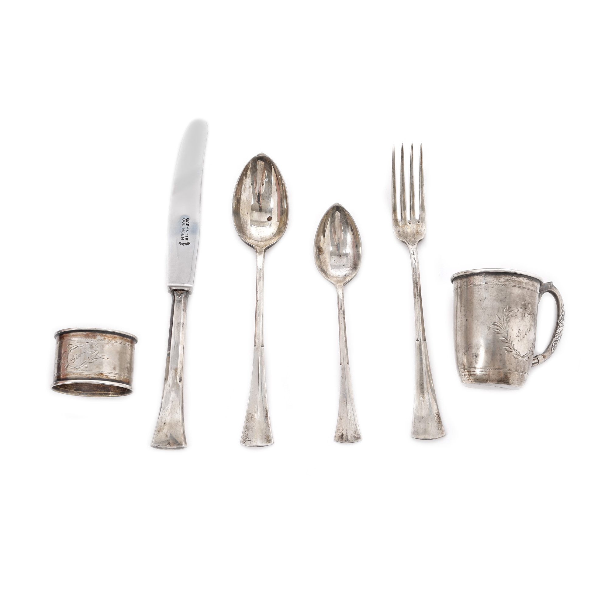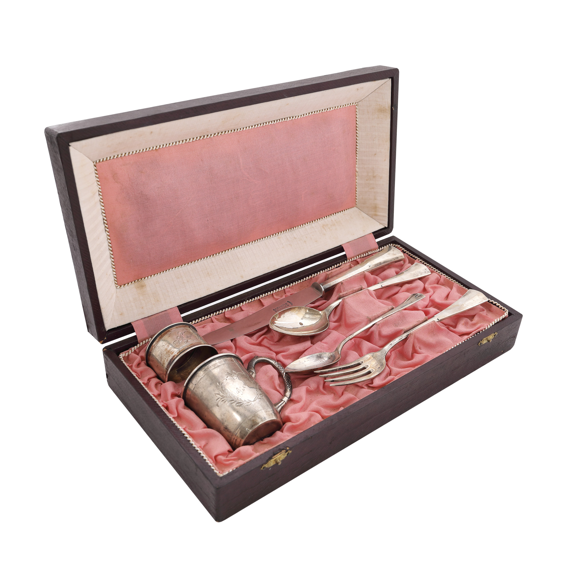 132. Set Art Deco din argint, pentru copii, decorat cu motive florale, perioada interbelică, însoțit de cutia originală