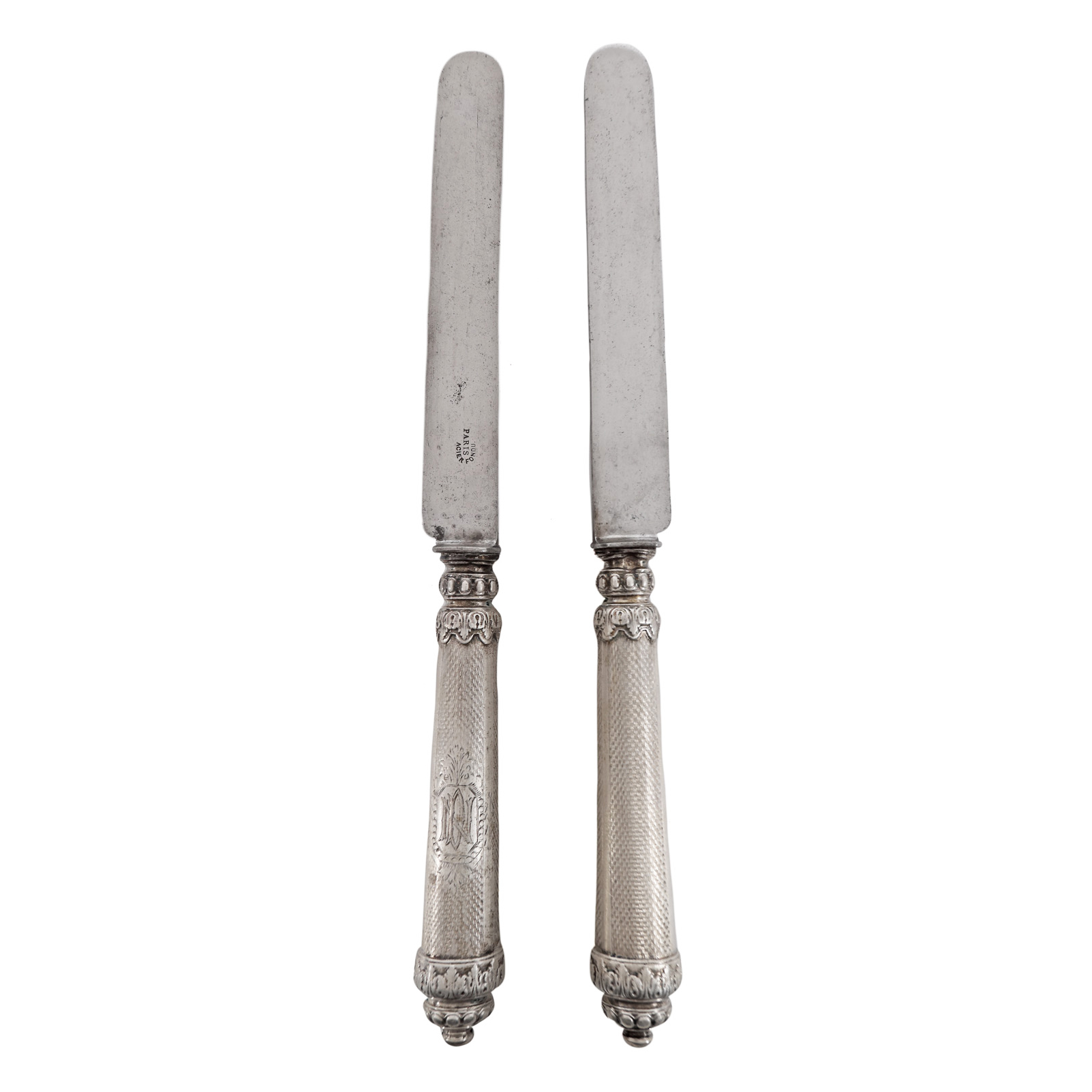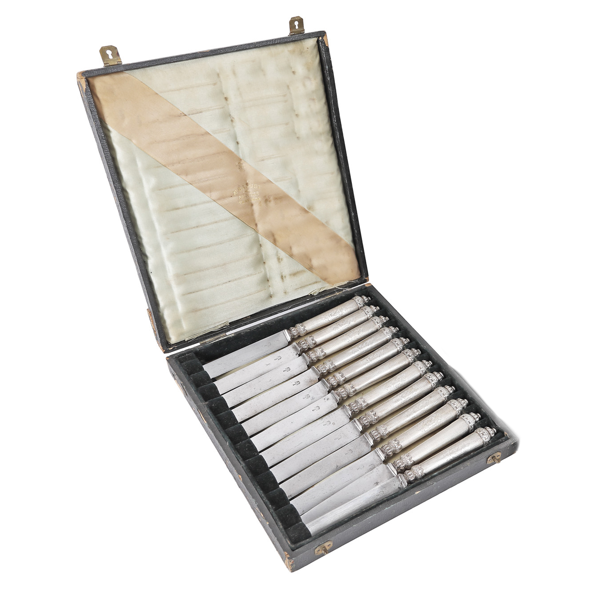 126. Set de 12 cuțite din argint, cu decor vegetal și monogramă, atelier Emile Huignard, cca. 1880-1900, însoțit de cutie originală