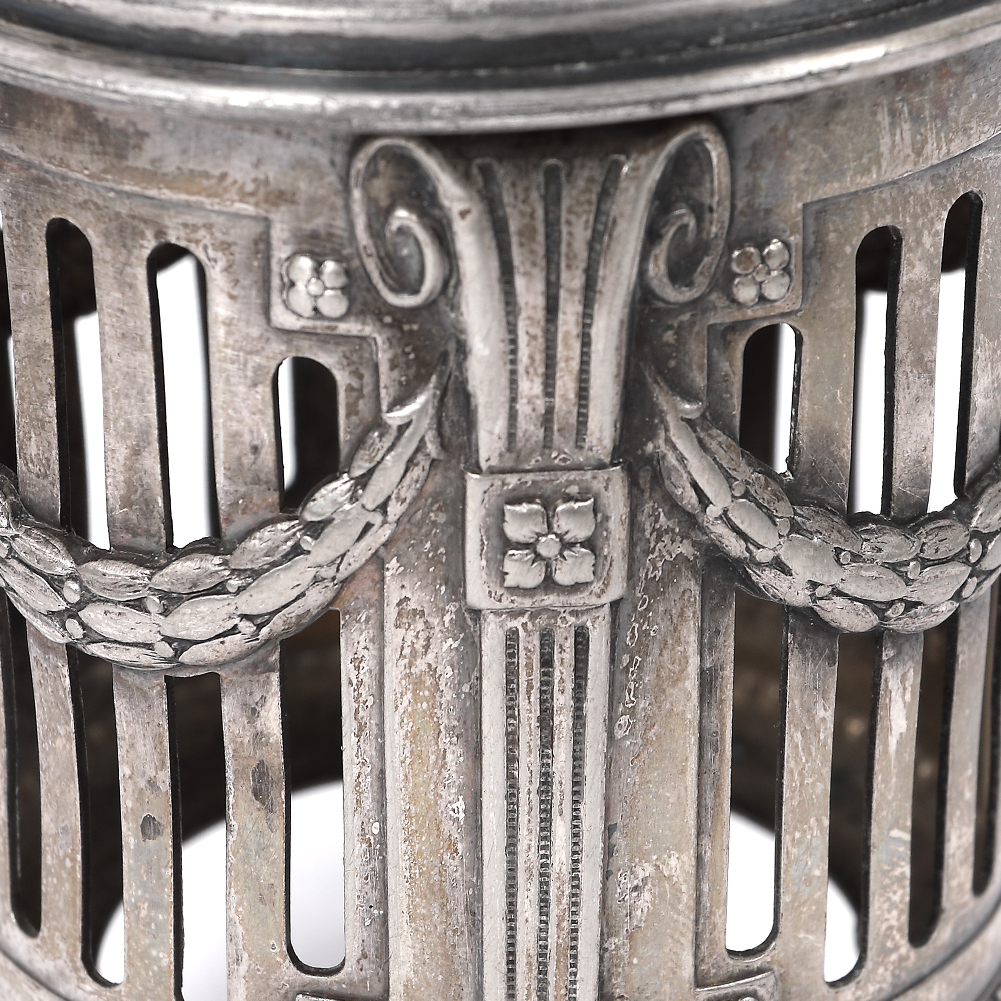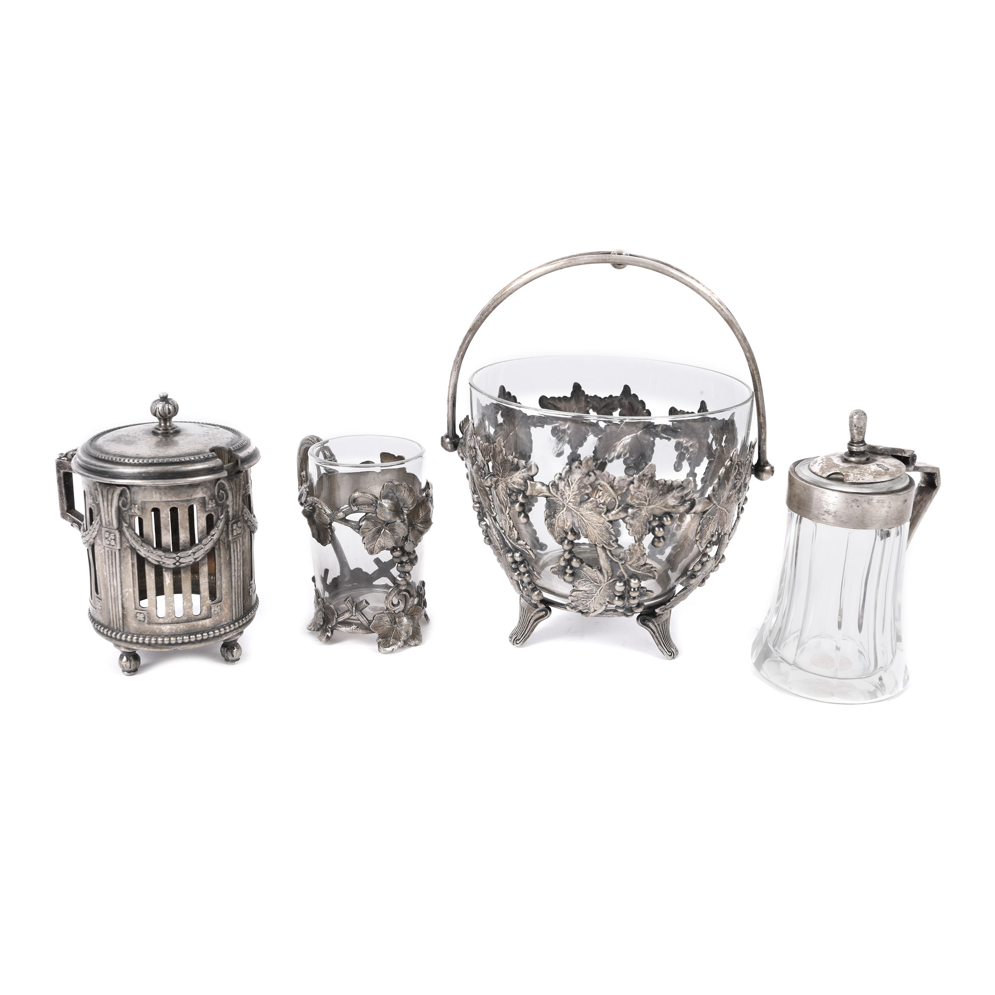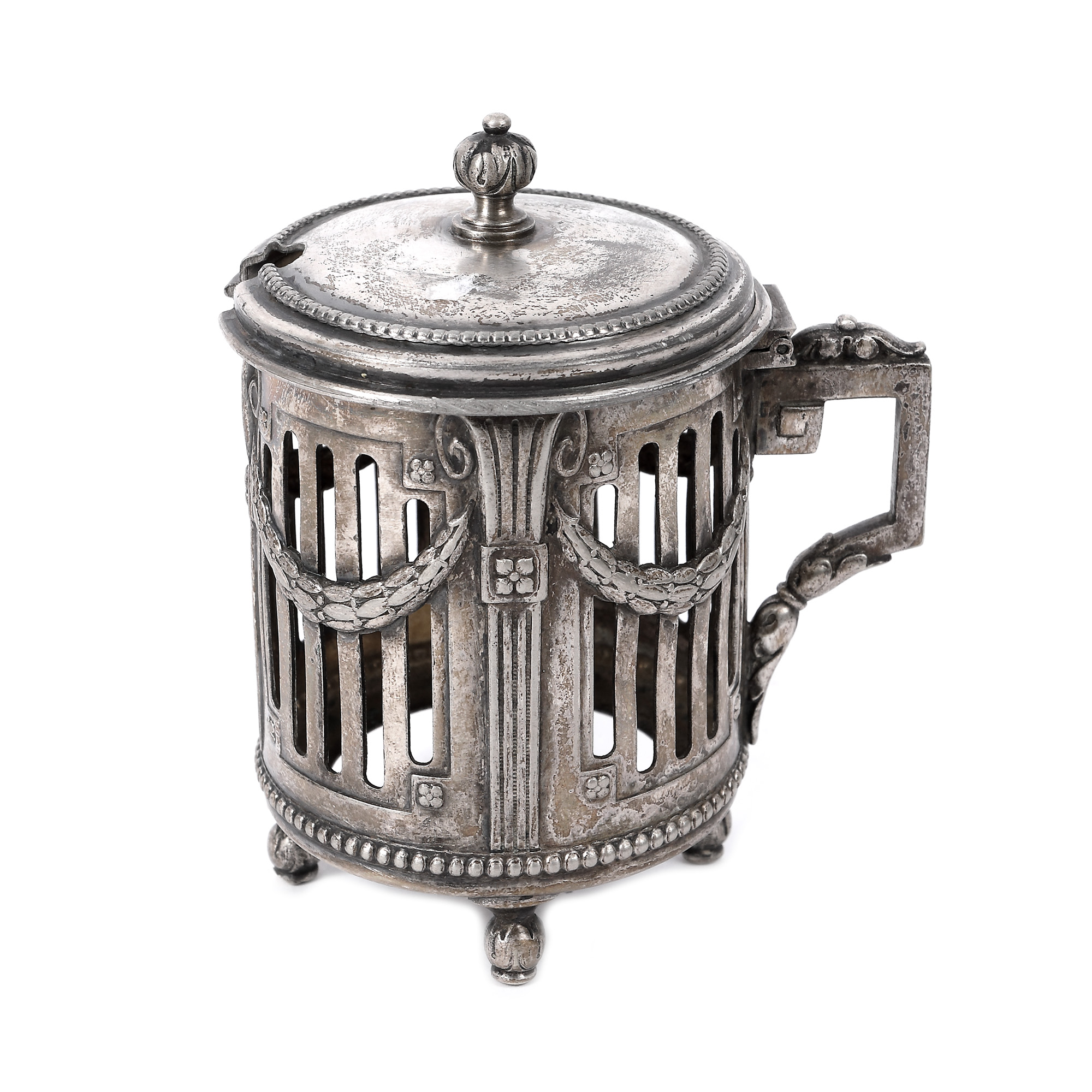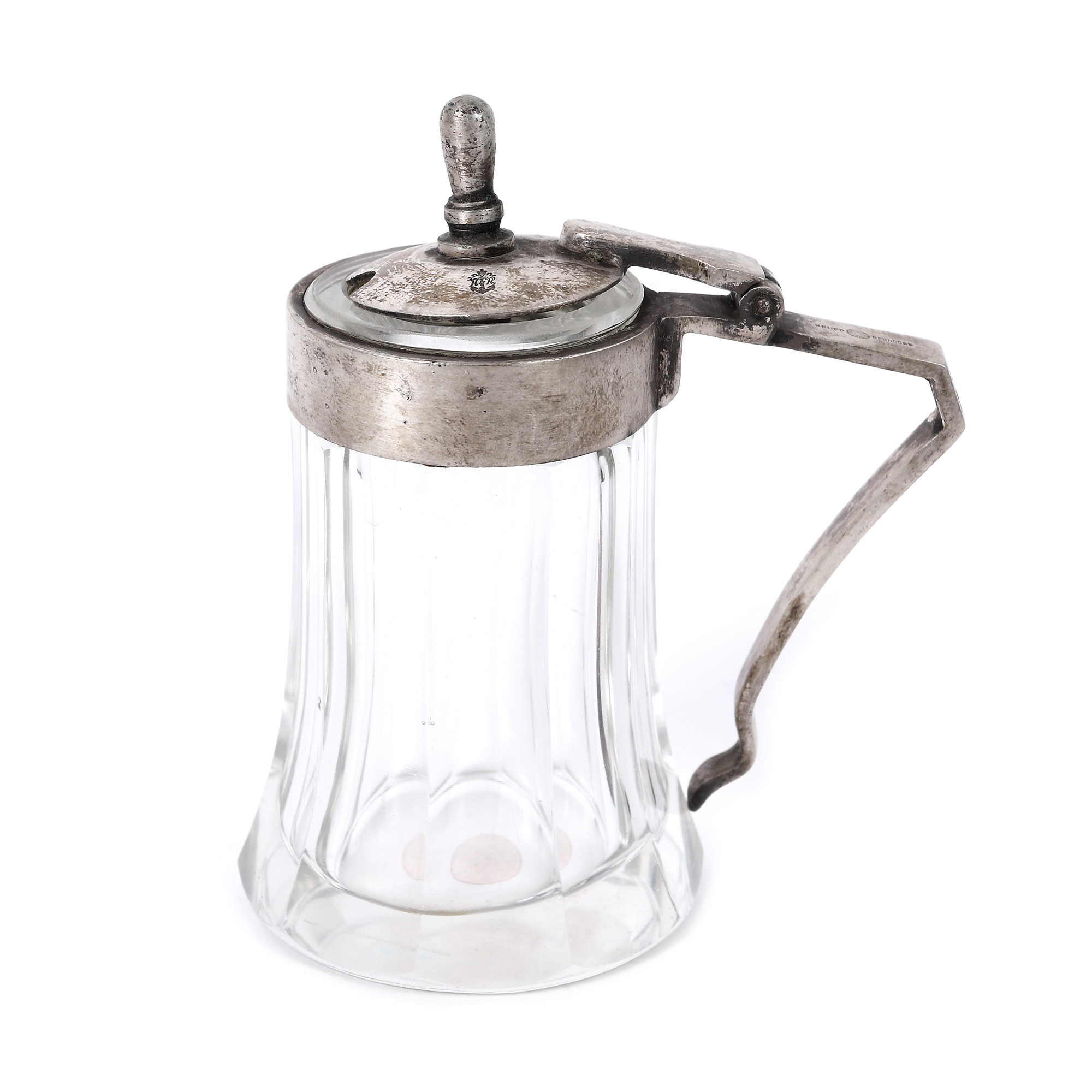 cană și recipient pentru muștar WMF, cca. 1886-1903. Recipientul pentru muștar nu vine însoțit de bol și linguriță. bombonieră, atelier englez suport pentru scobitoru Berndorf, cca. 1938-1945