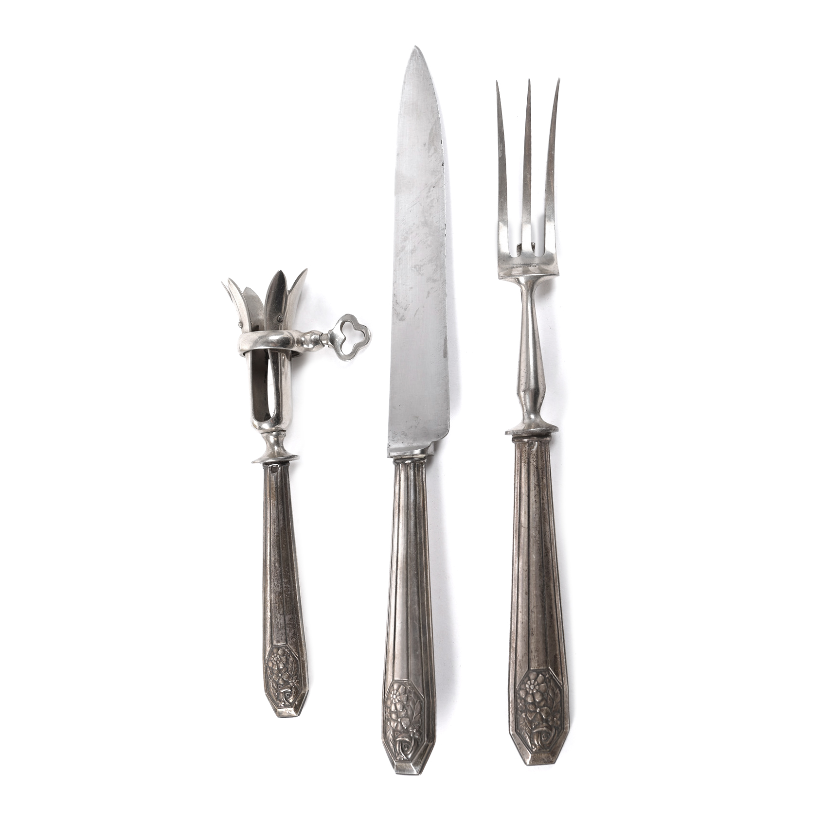 69. Set de tacâmuri din argint în stil Art Deco, pentru servit friptură, cu decor floral, cca. 1925-1930, însoțit de cutie originală