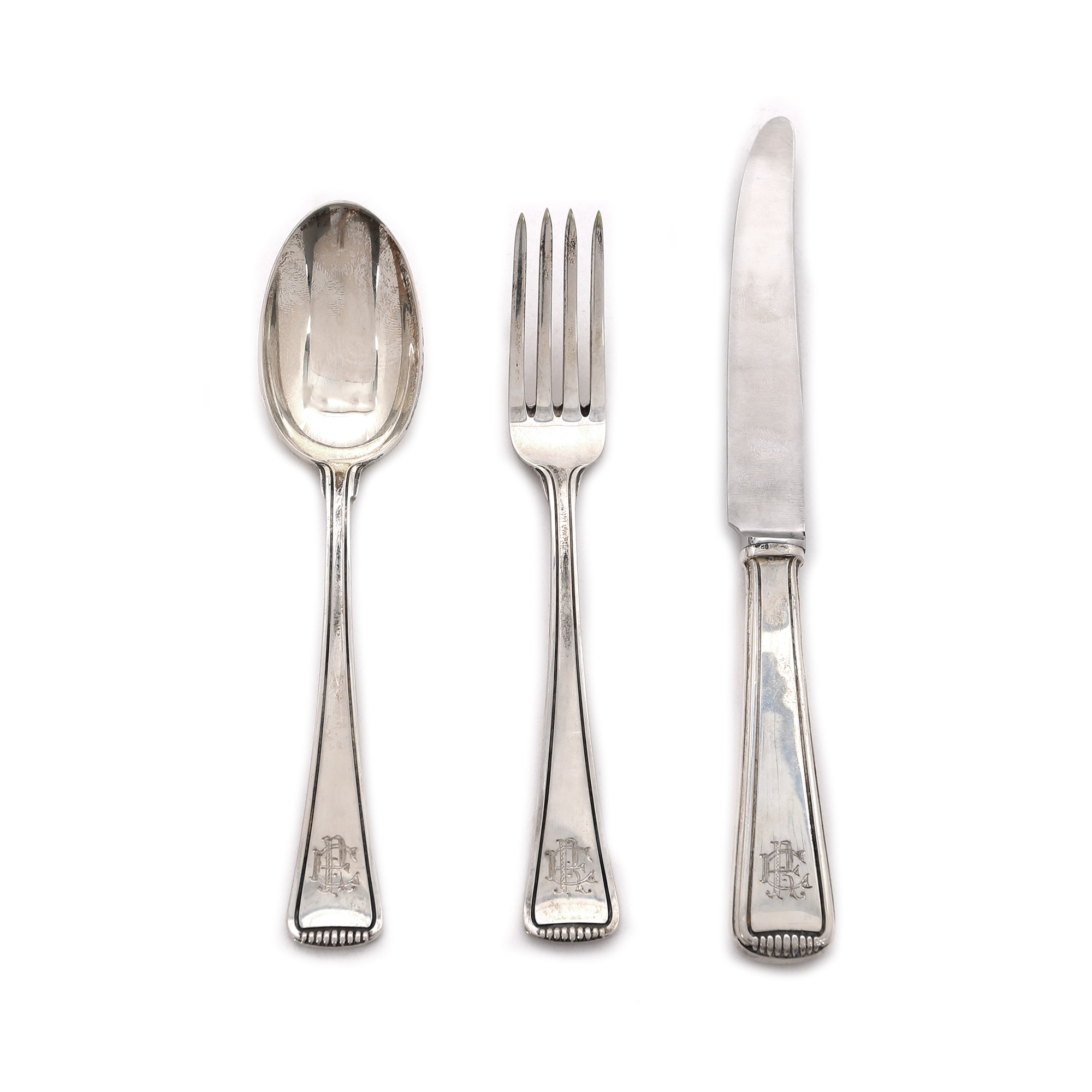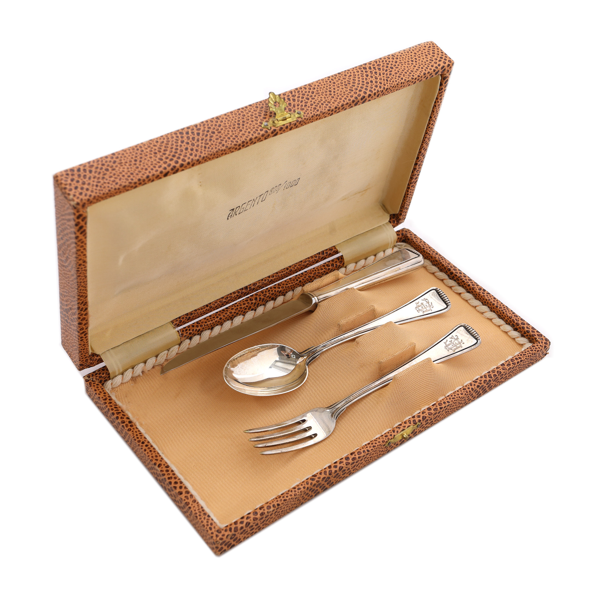 133. Set din argint pentru o persoană, pentru servit desert sau fructe, decorat cu monogramă, atelier Maria Morini Cacciari, însoțit de cutie originală [Cca. 1950-1970]
