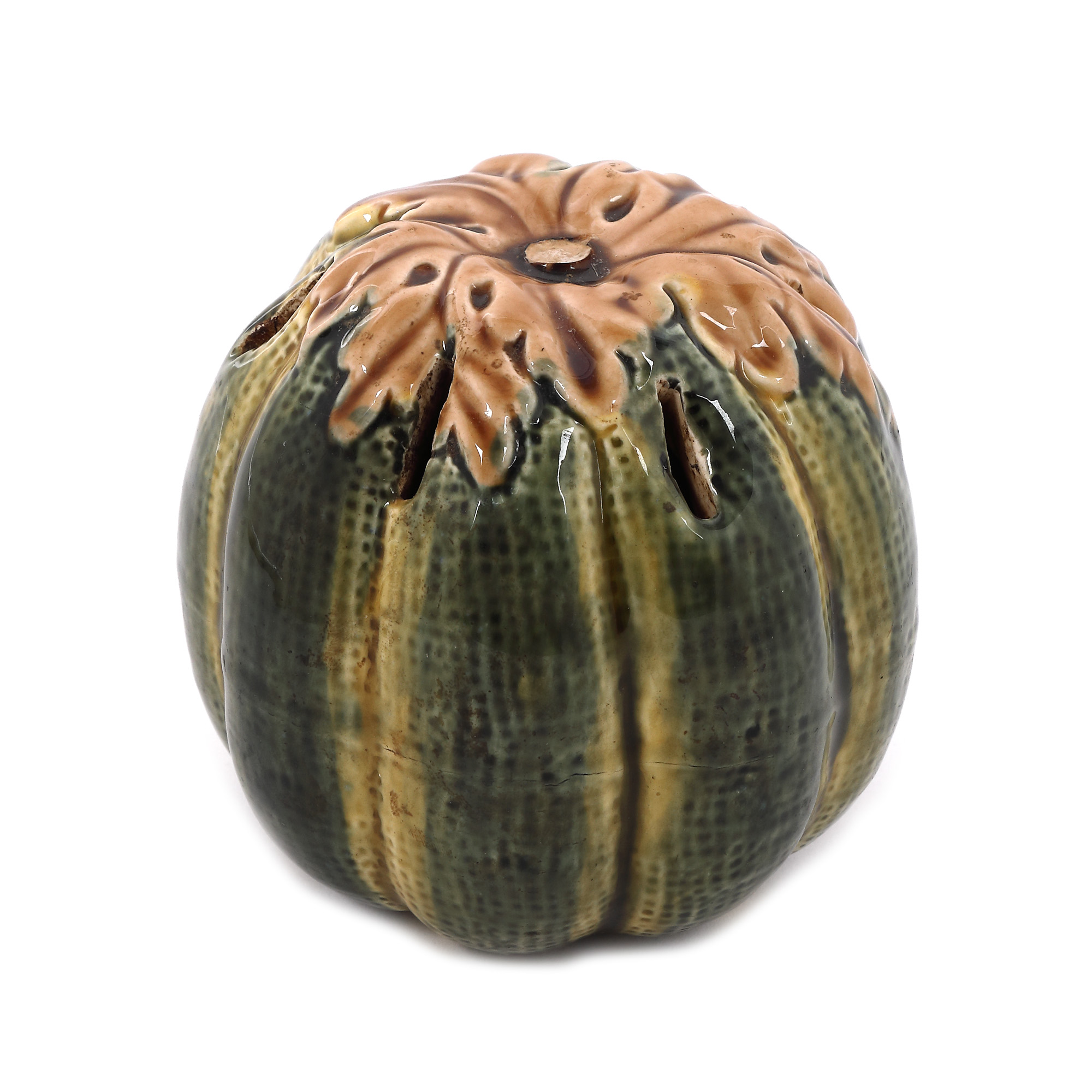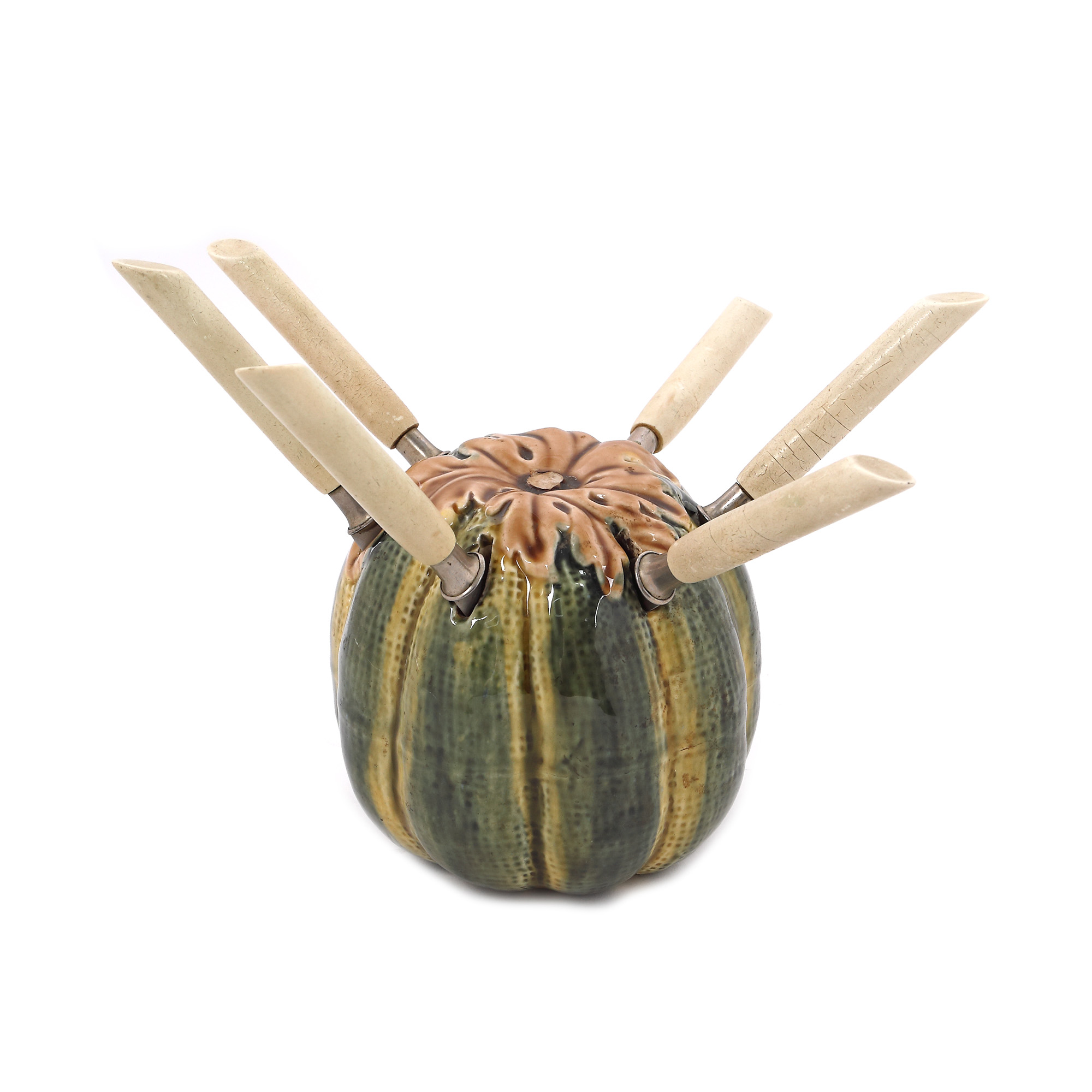 193. Set din ceramică glazurată, format din suport pentru cuțite în formă de bostan și șase cuțite [A doua jumătate a sec. XX]