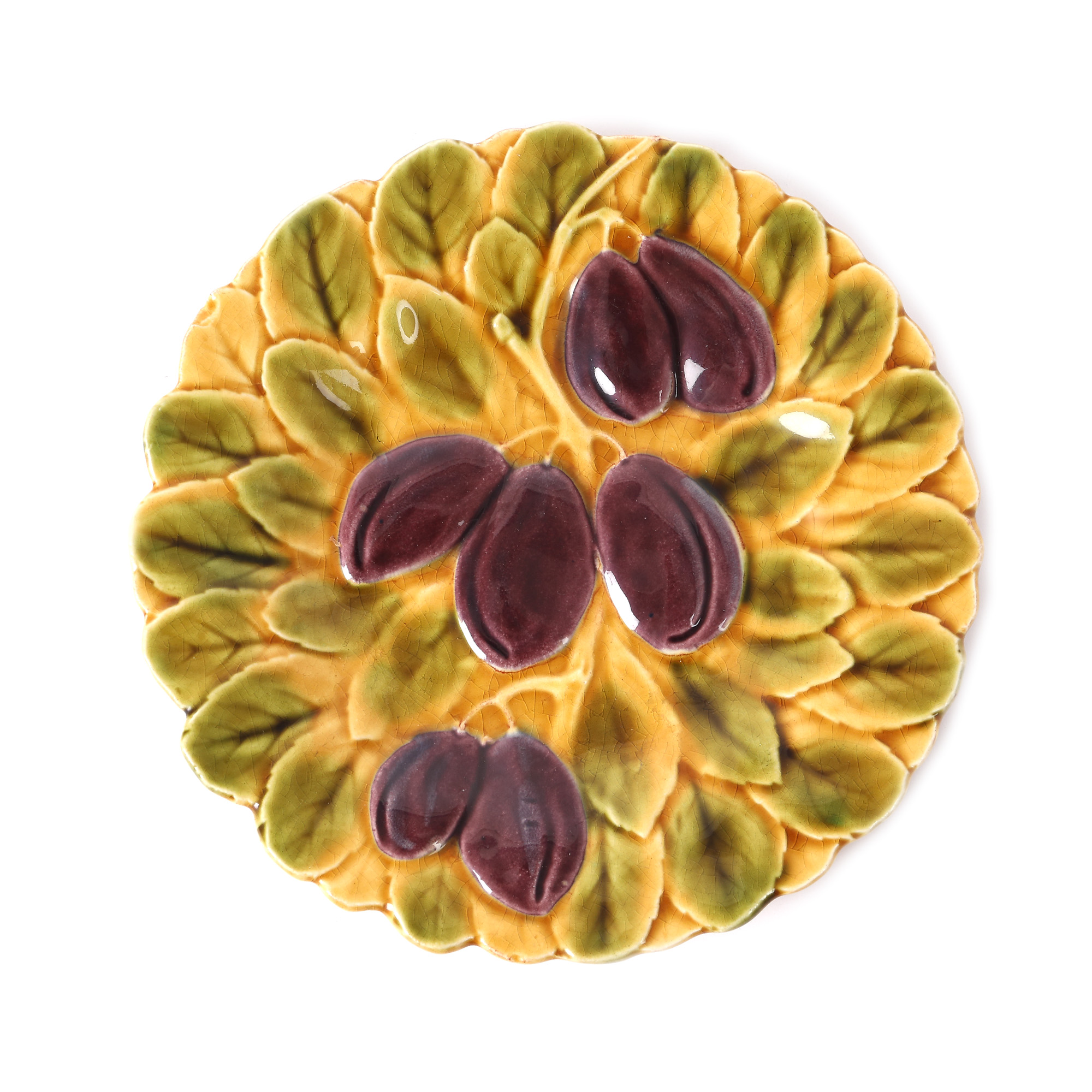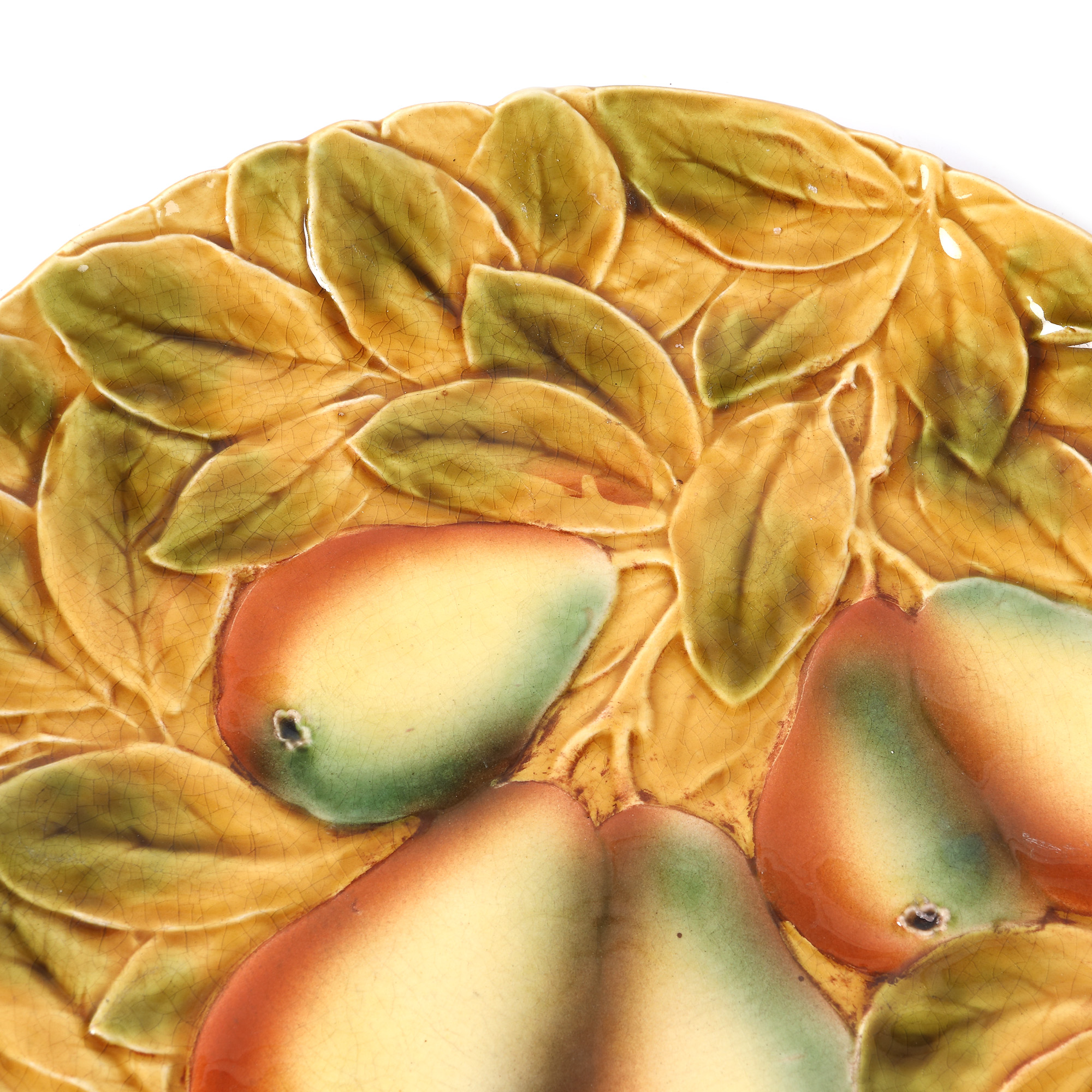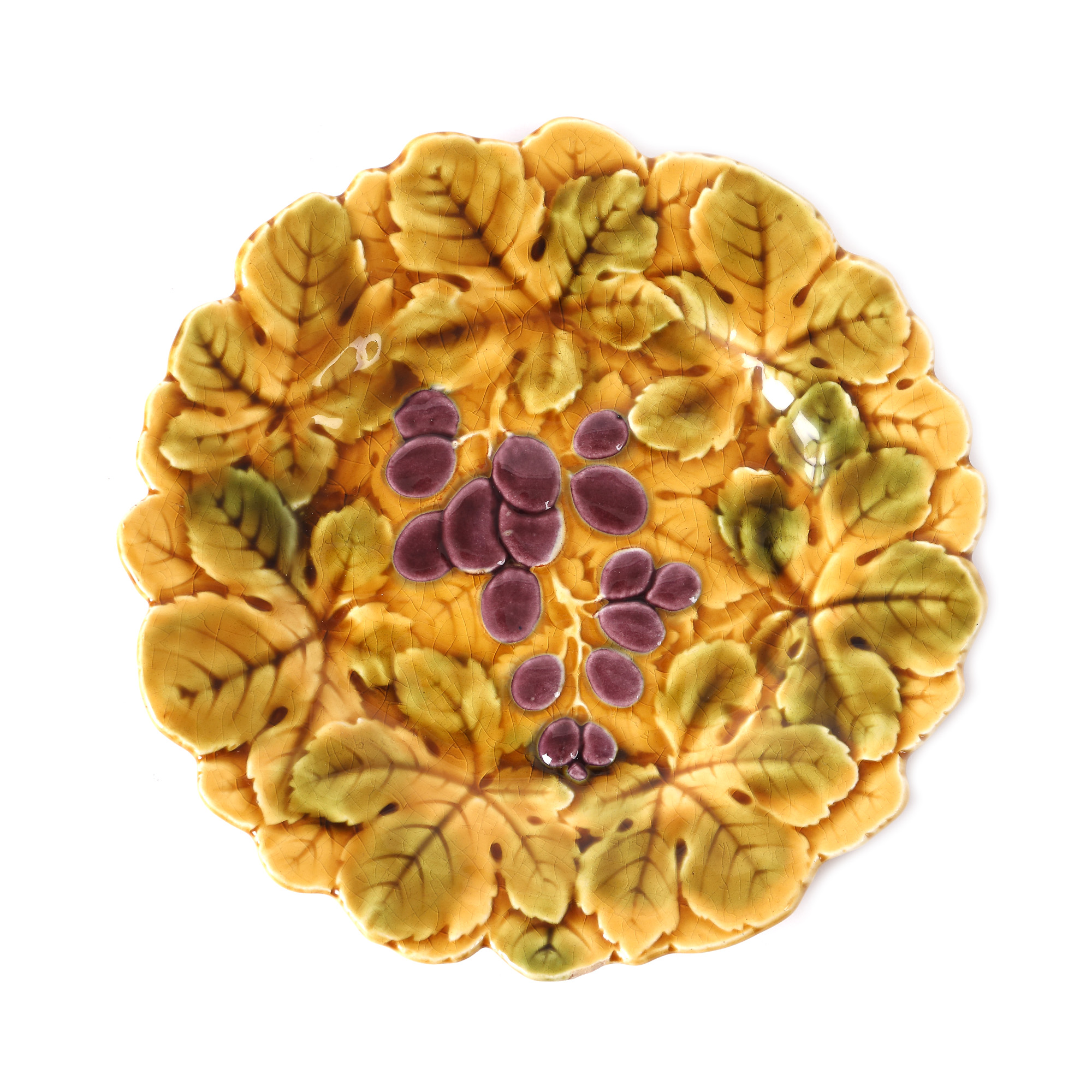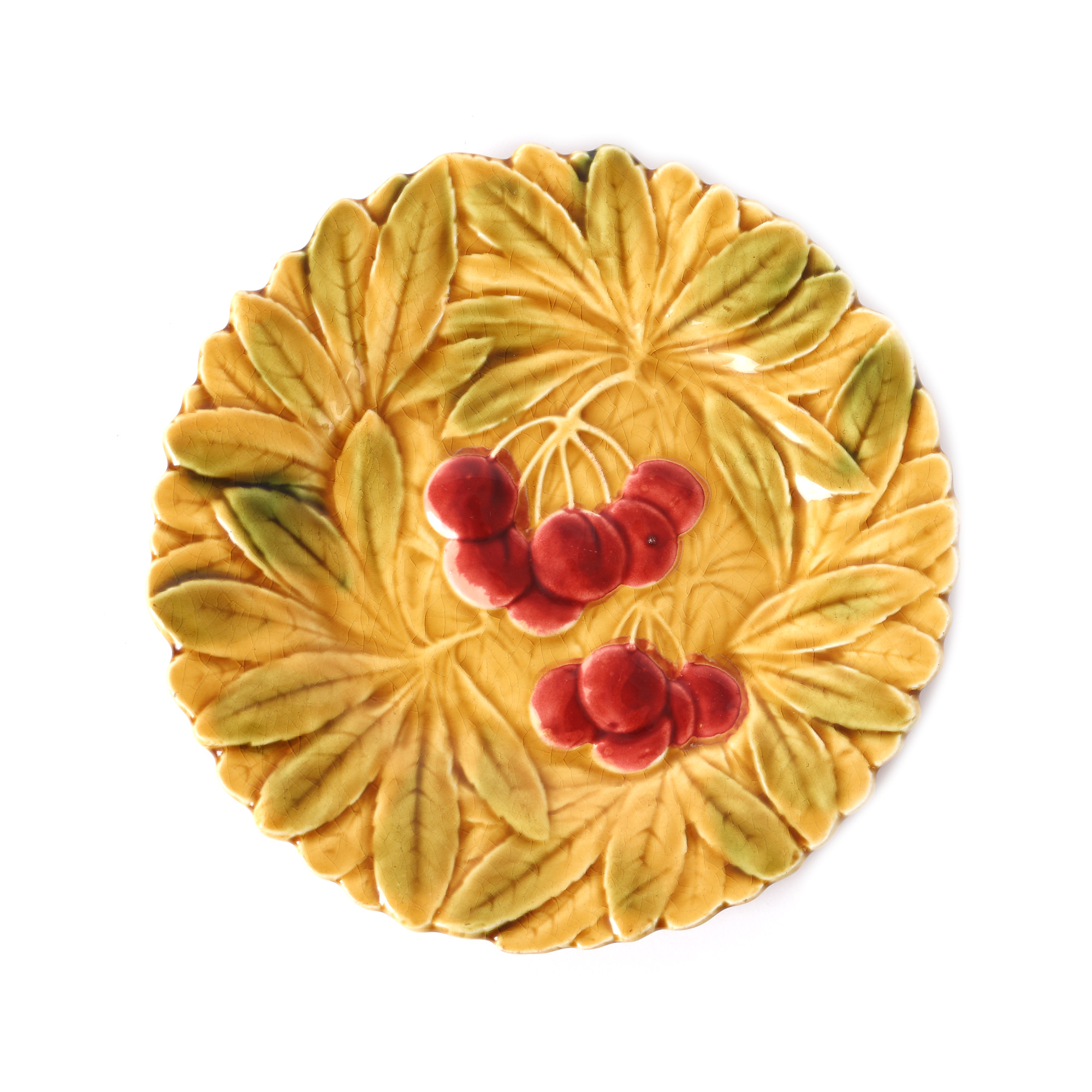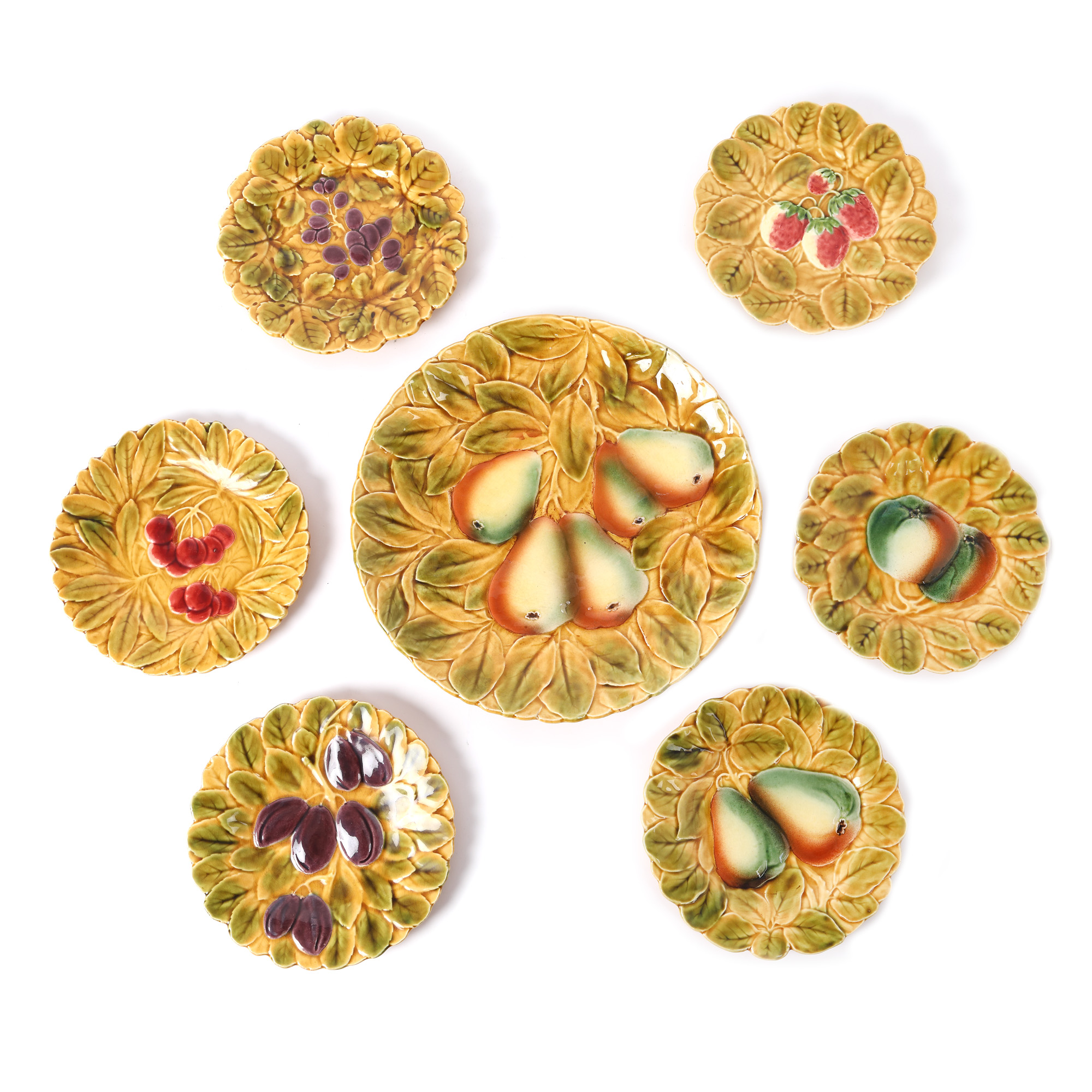 191. Set din porțelan Sarreguemines, format din platou și șase farfurii, decorat cu fructe, cca. 1900-1925