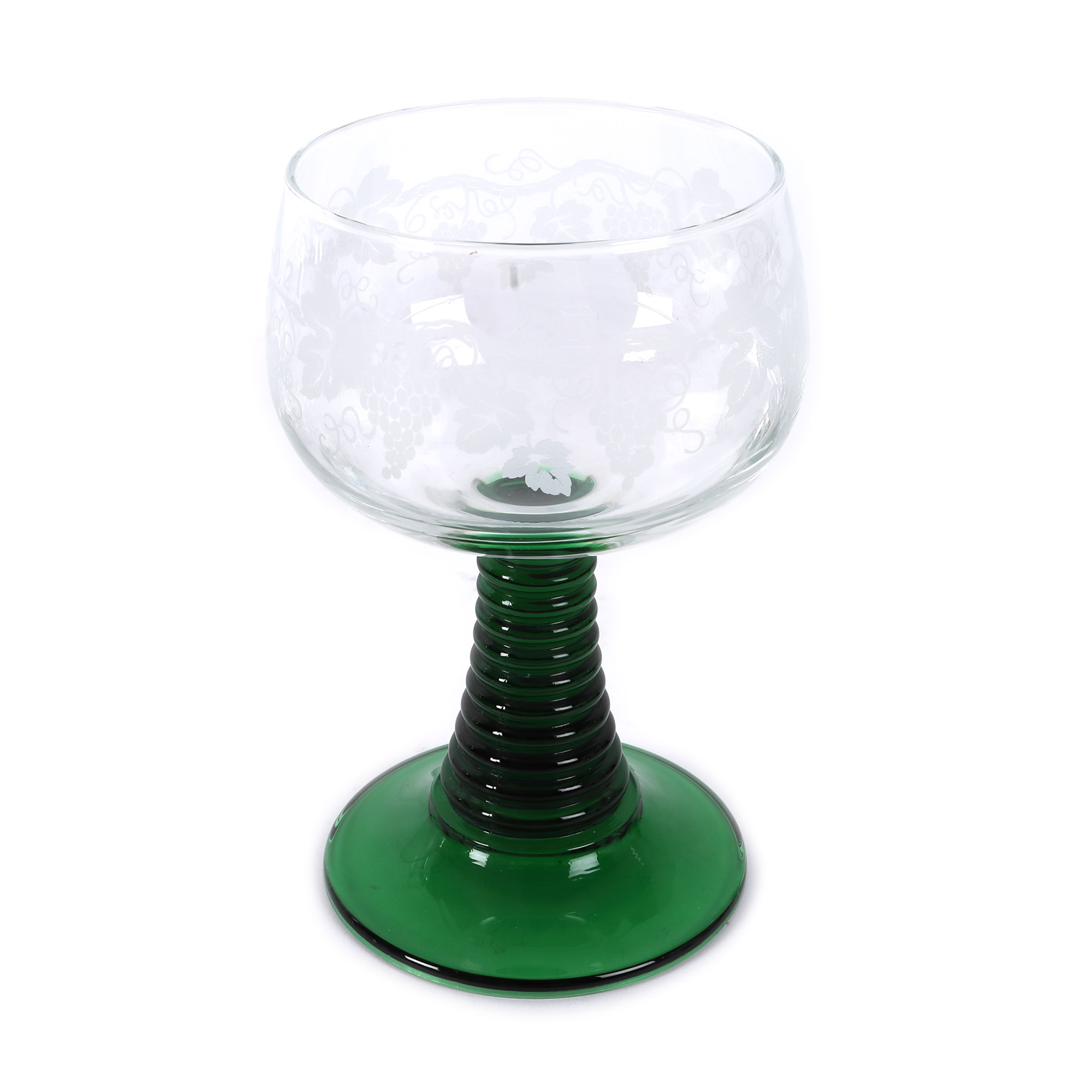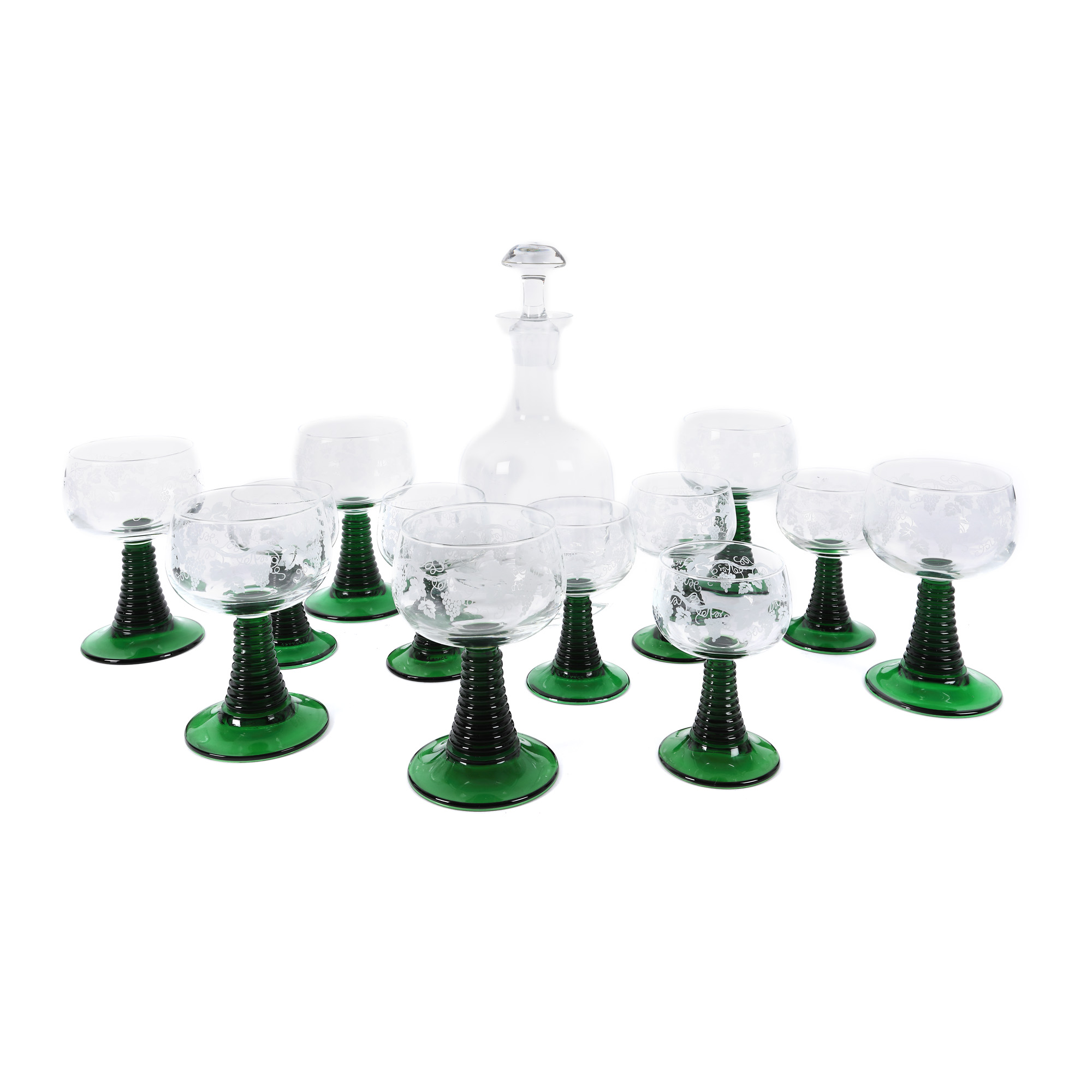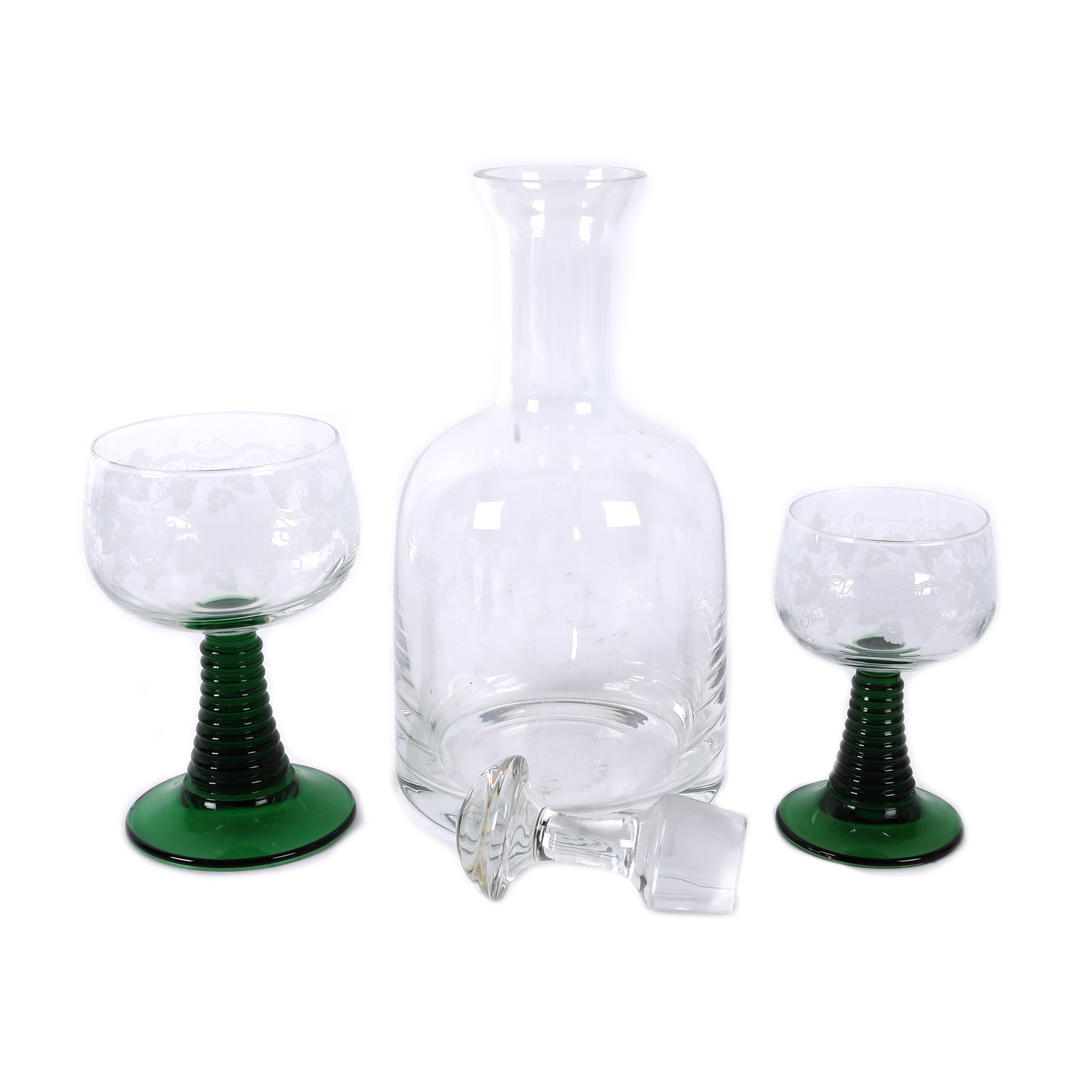143. Set Luminarc format din decantor și 12 pahare, pentru vin, cu decor gravat viță-de-vie [Cca. 1960]