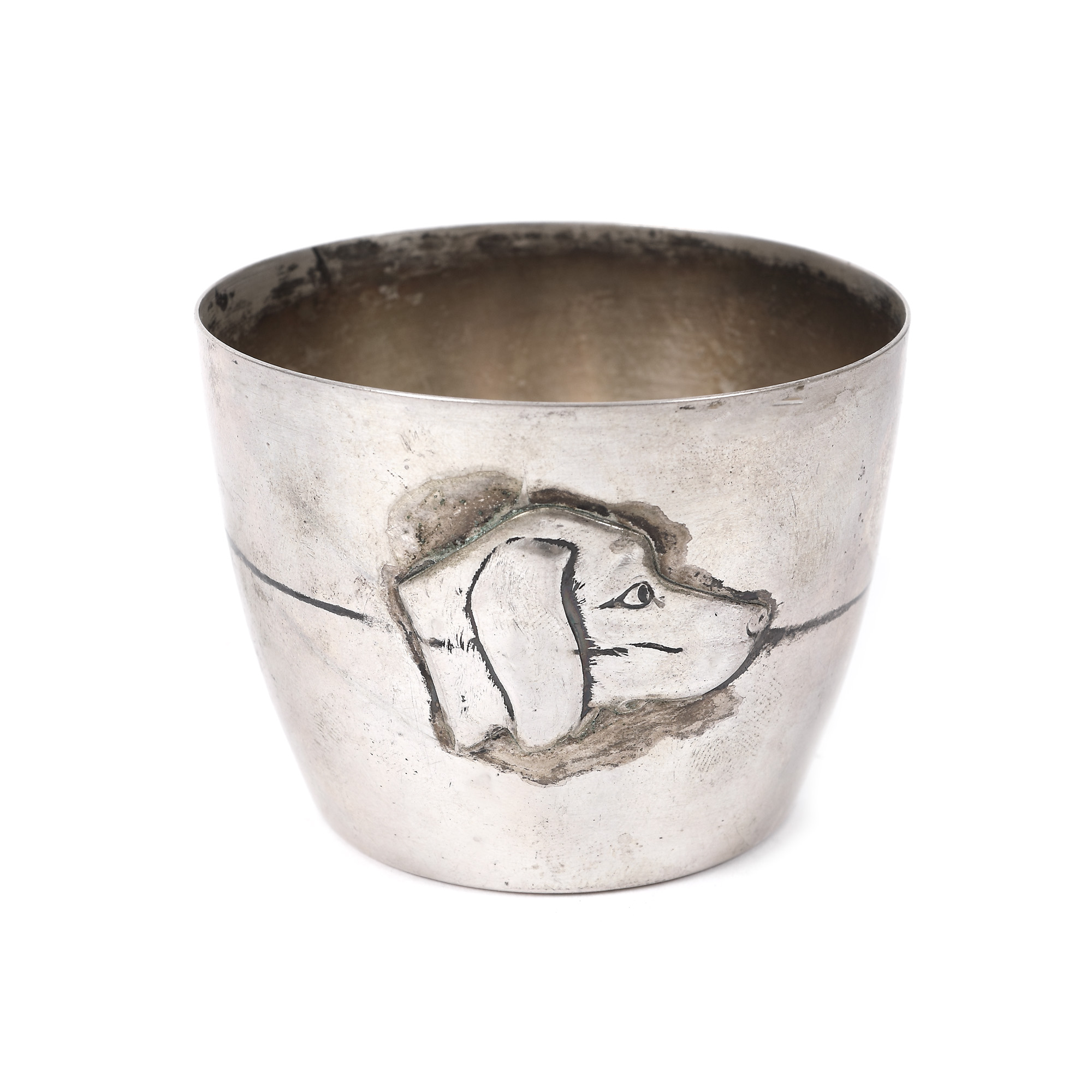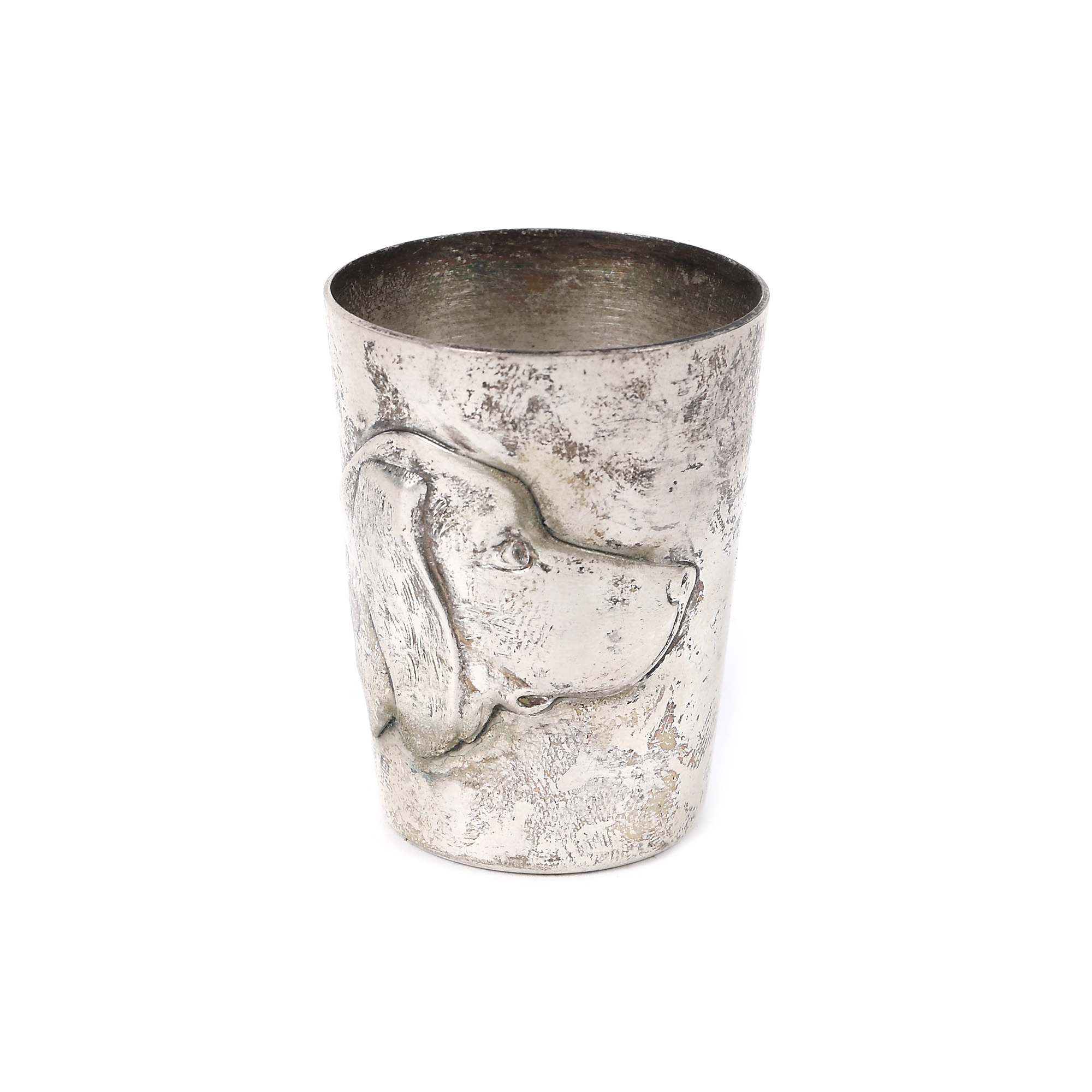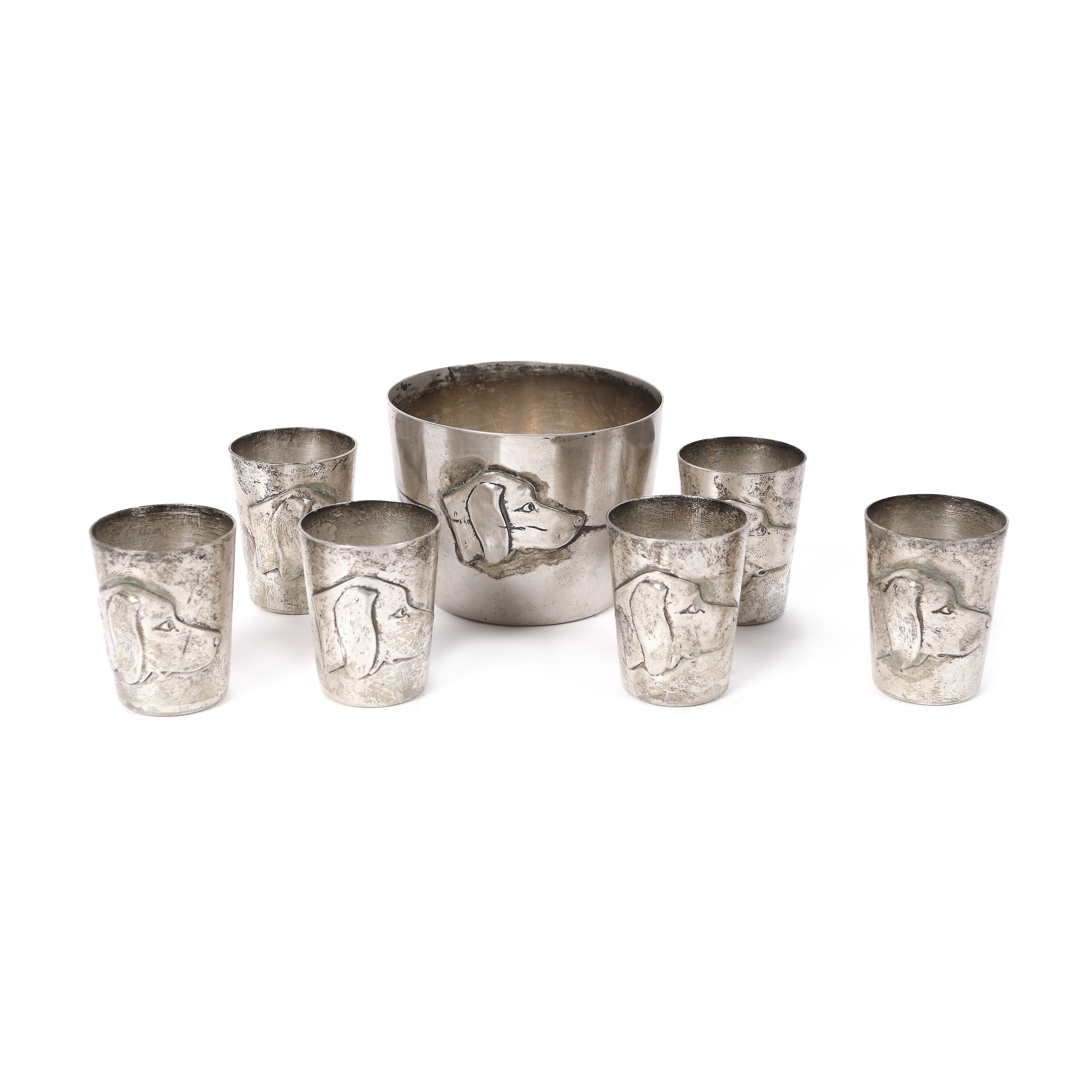 207. Set pentru aperitive, format din bol și șase pahare, decorat cu cap de cățel beagle [A doua jumătate a sec. XX]