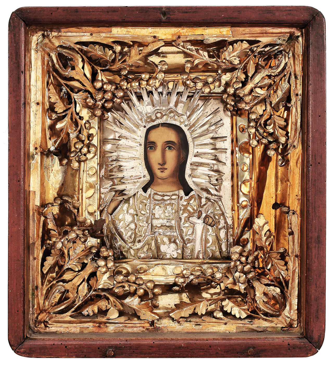 73. Icoană pe lemn, "Sfânta Muceniţă Ecaterina", Rusia, sec. XX, cu ferecătură din argint
