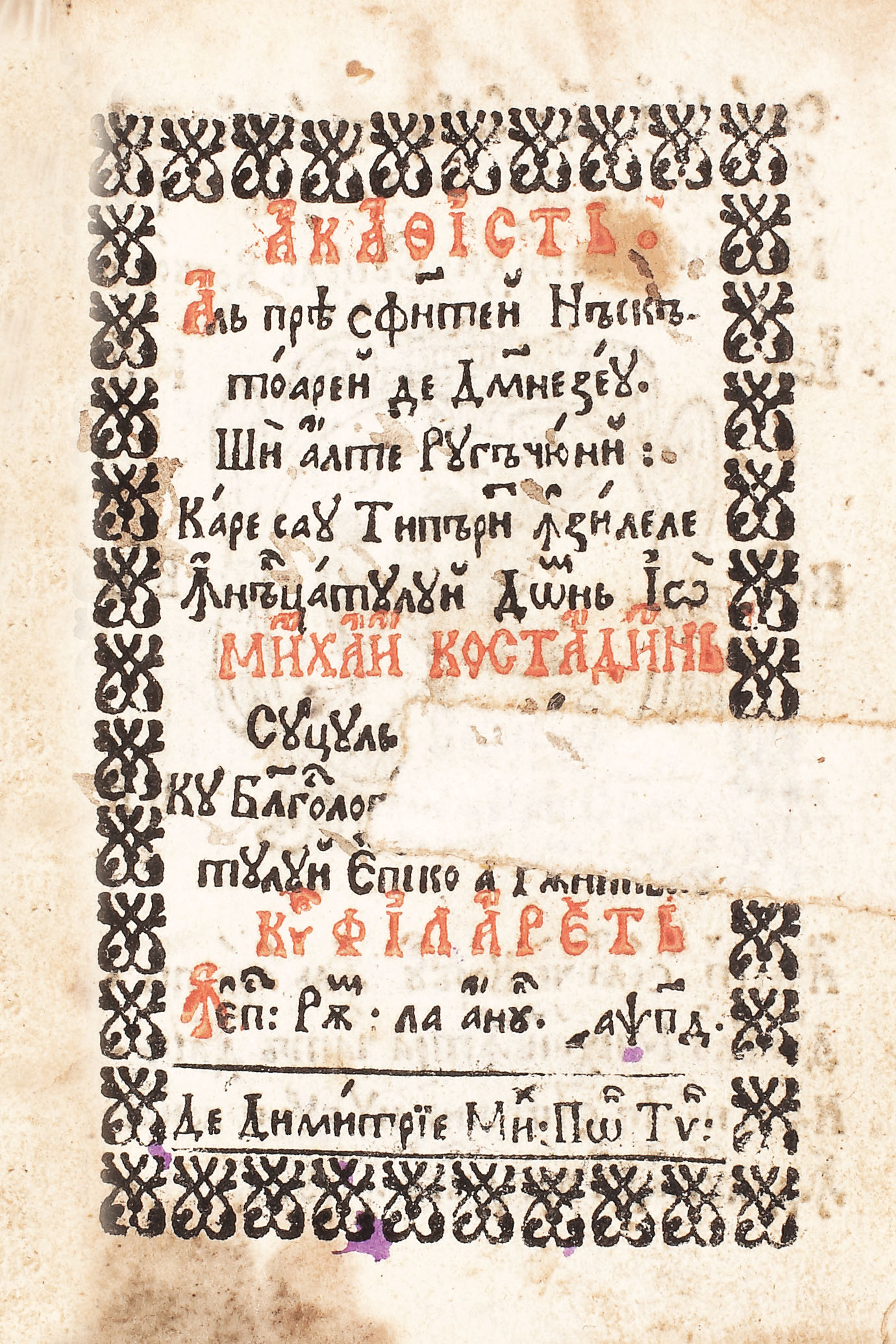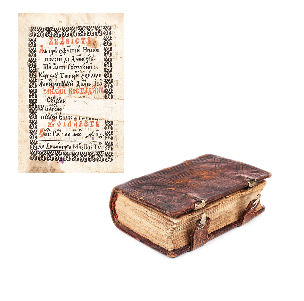 "Acatistul Preasfintei Născatoare de Dumnezeu şi alte rugăciuni", ormanentat cu gravuri: stema Valahiei şi o icoană cu Maica Domnului la fila 42 v., semnată D. Mih. Tip. Volumul de mici dimensiuni poate fi încadrat la seria liliput românesc vechi. Legătură de epocă, poate chiar prima, cu închizători şi ornamente reprezentând simbolic crucea.