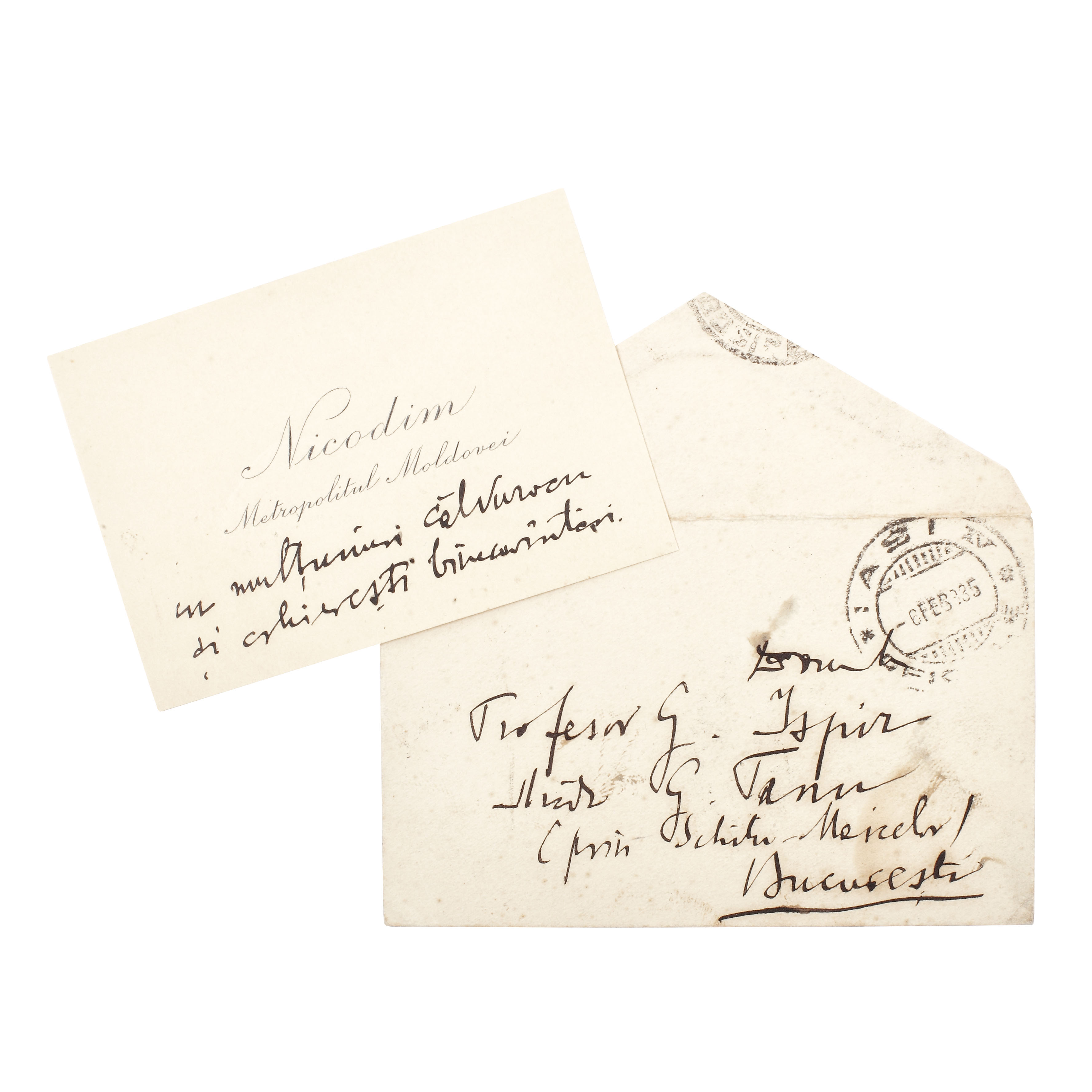 189. Carte de vizită a Mitropolitului Nicodim Munteanu, cu însemnări olografe adresate profesorului Vasile Ispir, în plicul original, 1935