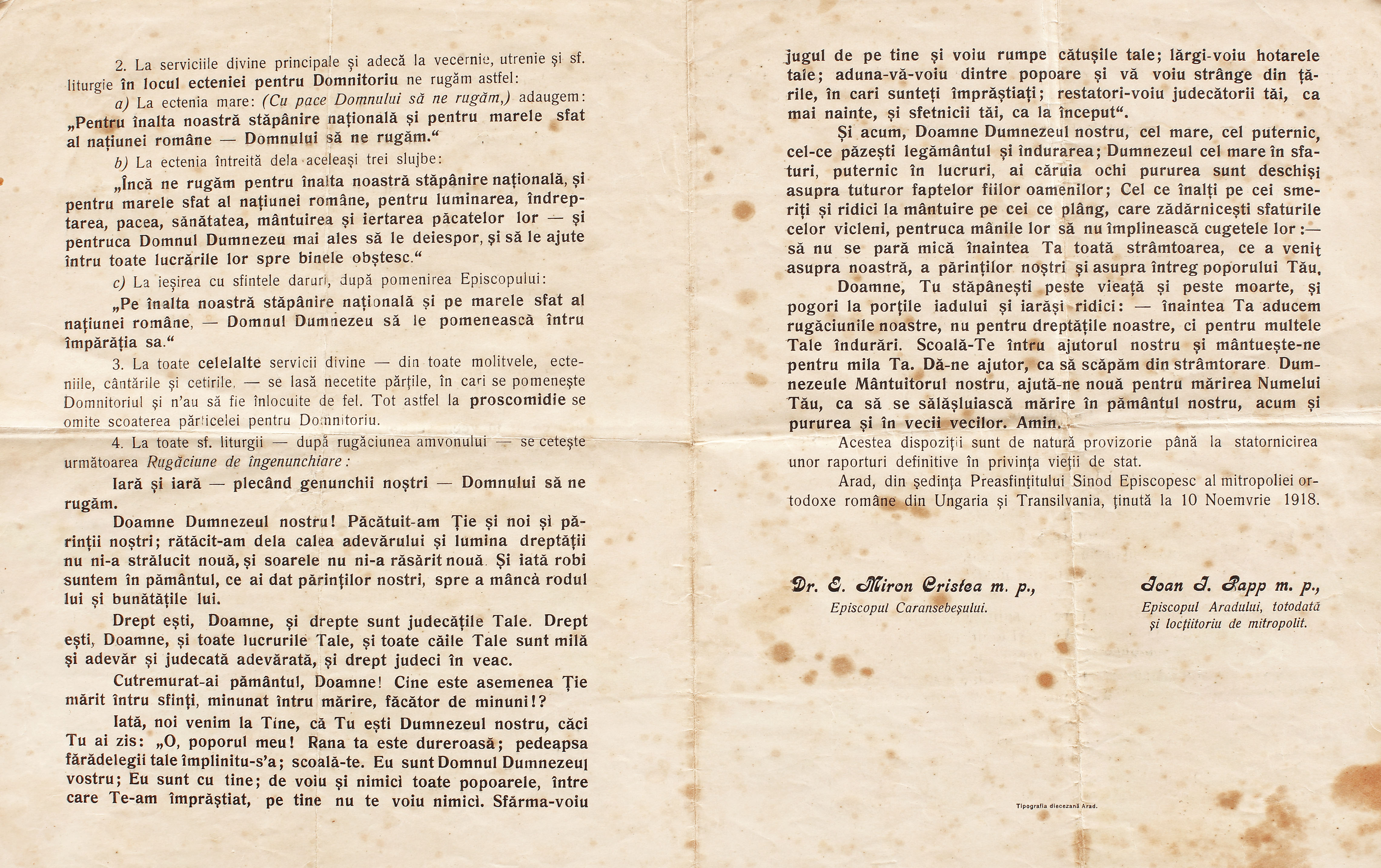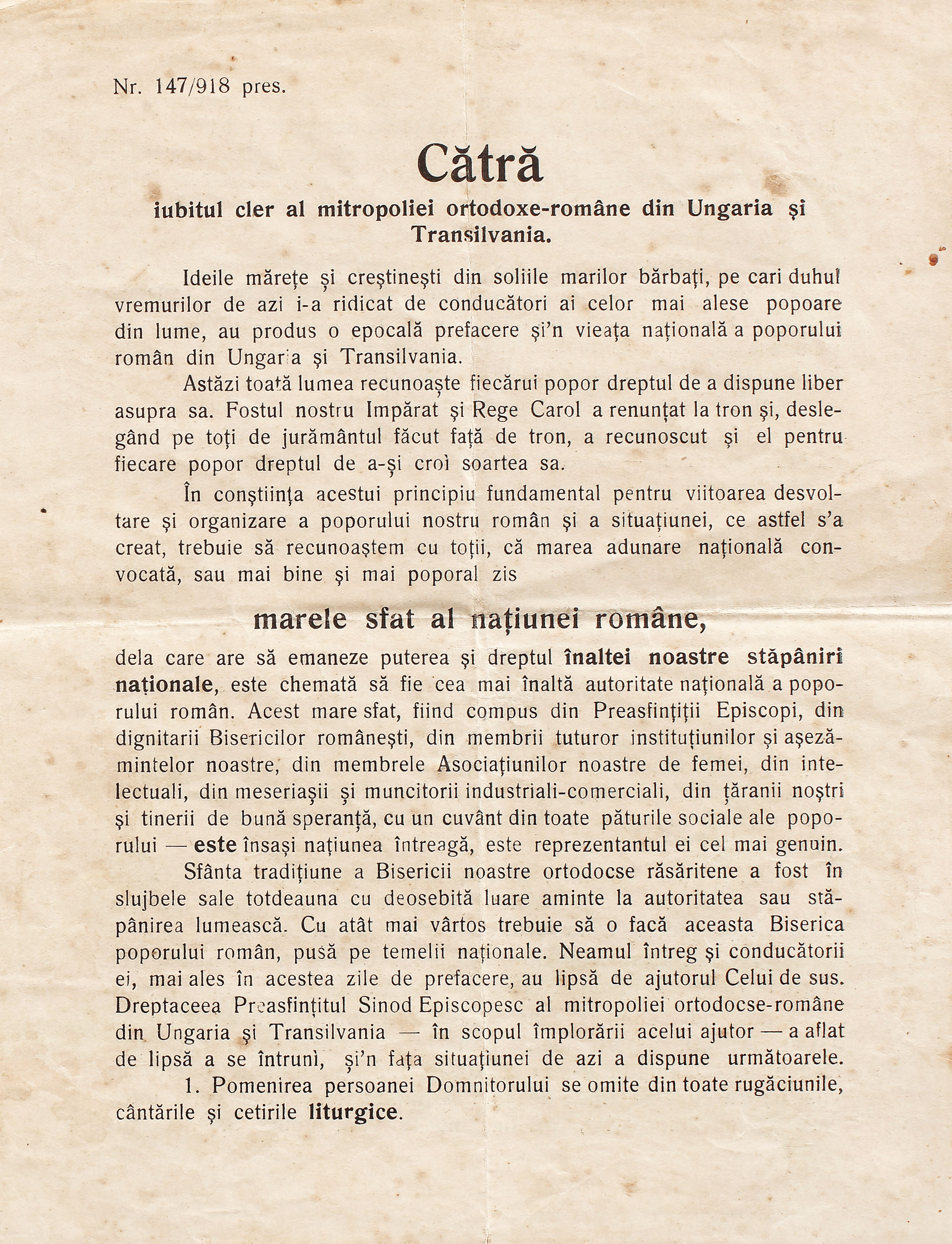 Sunt clarificate de Sinodul Episcopesc al Mitropoliei Ortodoxe din Ungaria şi Transilvania anumite aspecte privitoare la săvârşirea serviciului religios după ce Carol I, Împărat al Austriei şi Rege al Ungariei, a renunțat la tron (de exemplu, omiterea pomenirii regelui la slujbe). Hârtie velină.