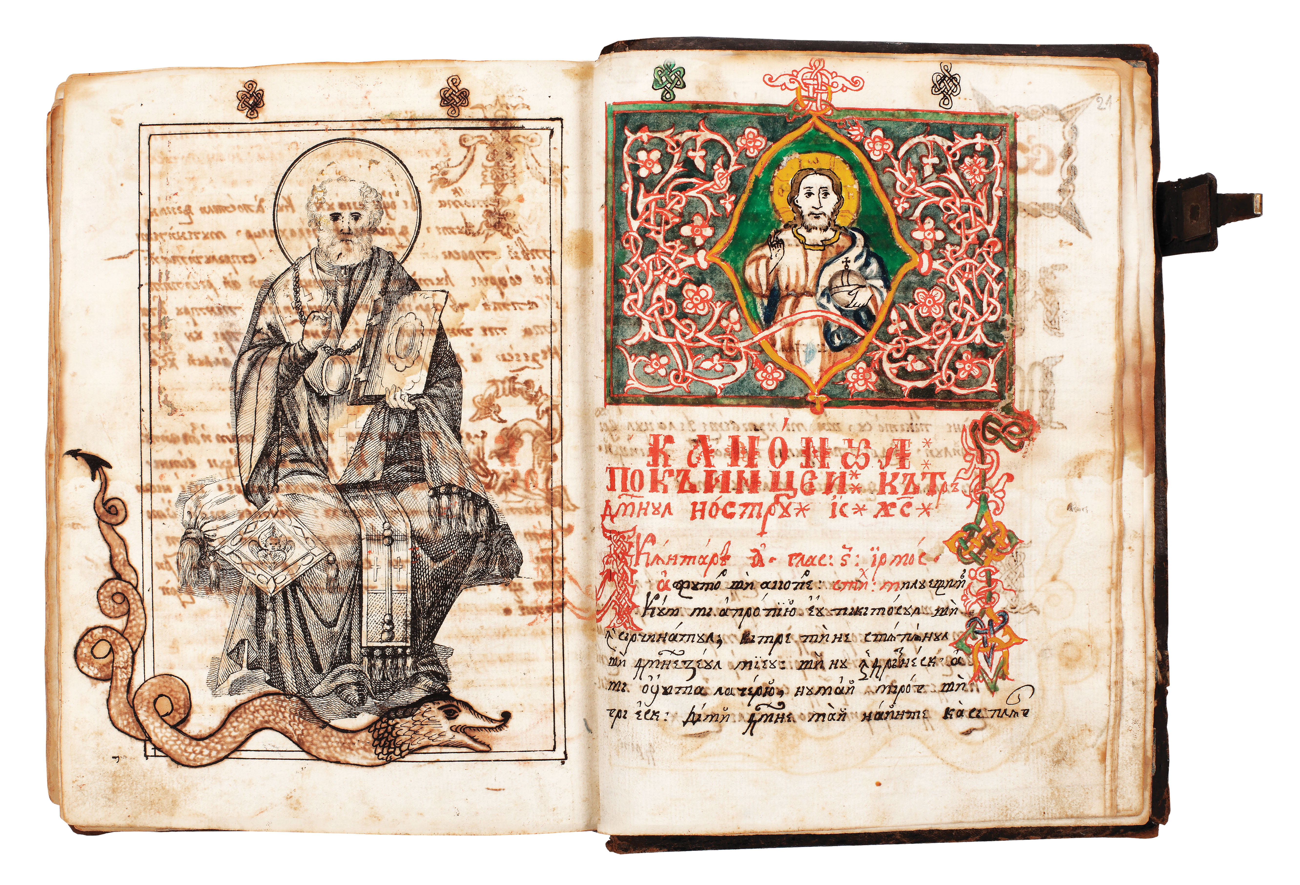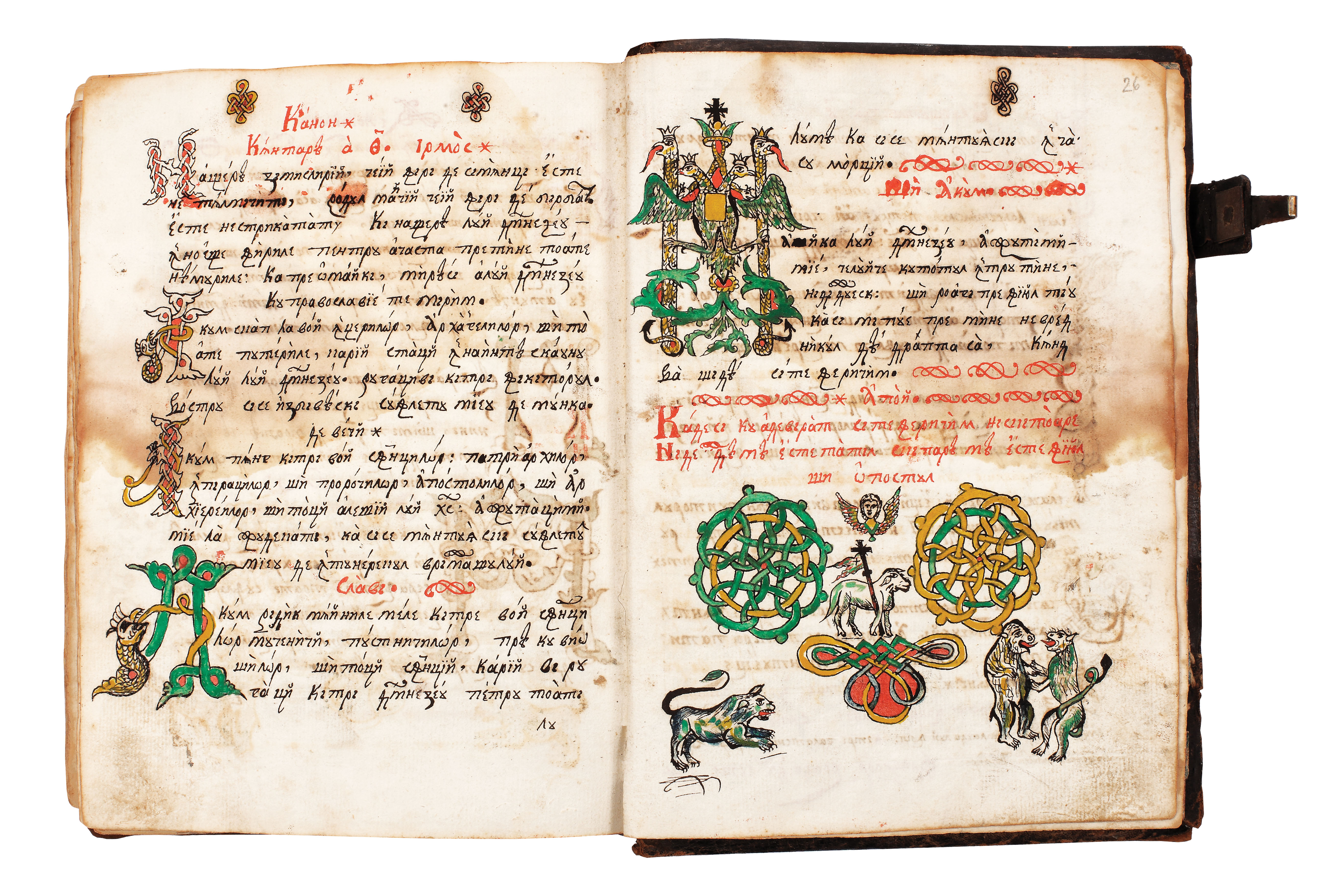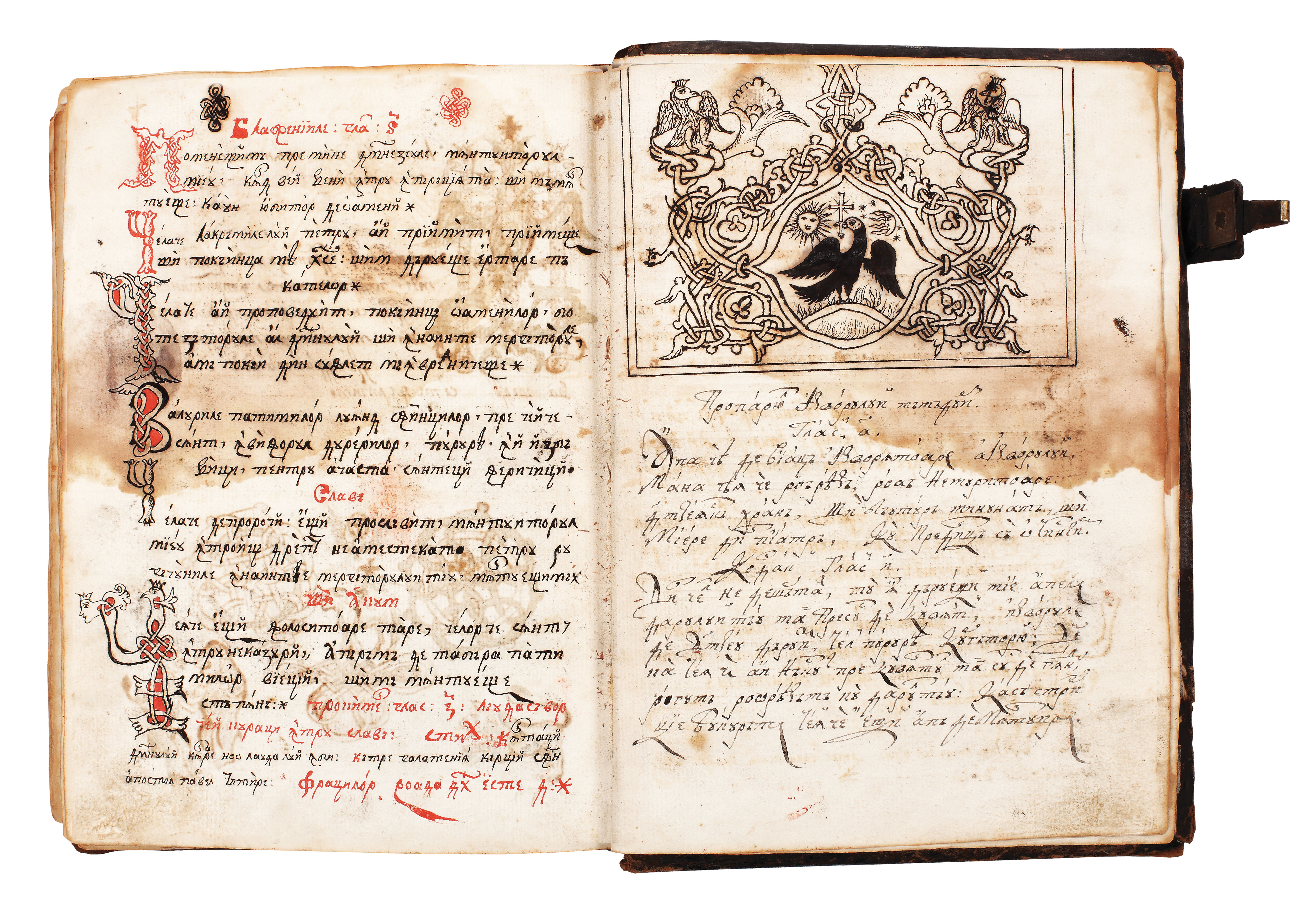 Volumul se deschide cu "Ceaslovul" tipărit la Buzău. Ceaslovul este o carte care a servit copiilor şcolari pe vremuri şi ca Abecedar. Se prezintă, sub aspect grafic, într-o ţinută de excepţie, cu tipar îngrijit şi ornamente, frontispicii şi vigniete lucrate cu măiestrie. Gravurile cărţii sunt lucrate de Monahul Constantie (f. 4 verso, p. 230) şi Monahul Ghervasie (p. 468, "Pogorârea de pe Cruce", scenă după Rubens). A doua lucrare din volum este superbul manuscris numit "Miscelaneu" (text cu conţinut variat), scris cu litere chirilice şi ornamentat cu ornamente policrome din gama roşului, galbenului, verdelui, făcând din această operă un unicat paleografic. Motivele sunt arhaice, tradiţionale şi originale, reprezentând frontispicii, iniţiale ornate şi istoriate, vigniete şi miniaturi. Peste tot întâlnim vrejuri, flori, capete de şerpi şi balauri, reptile încoronate şi stema Ţării Româneşti (fila 27). Nu lipsesc nici portretele cu Sf. Ioan cel Nou de la Suceava (f. 15) şi cu Iisus Hristos (f. 21). Excepţională şi de mare atracţie este gravura imprimată cu Sf. Evanghelist Ioan în postură de Mare Învăţător (f. 20v). Au lucrat la minierea cărţii doi copişti: primul a înfrumuseţat filele 1-26, al doilea doar fila 27. Pe fila 4 verso este trecută cota copistului şi anul 1846. Legătura este din tăbliţe de lemn îmbrăcate în piele decorată pe ambele coperte cu chenare duble din vrejuri aurite. Pe coperta din faţă apare central Mântuitorul, iar pe coperta posterioară Sf. Nicolae. Legătura, elegantă, de mijlocul secolului XIX, poate chiar prima, păstrează o închizătoare. Stare bună de conservare.