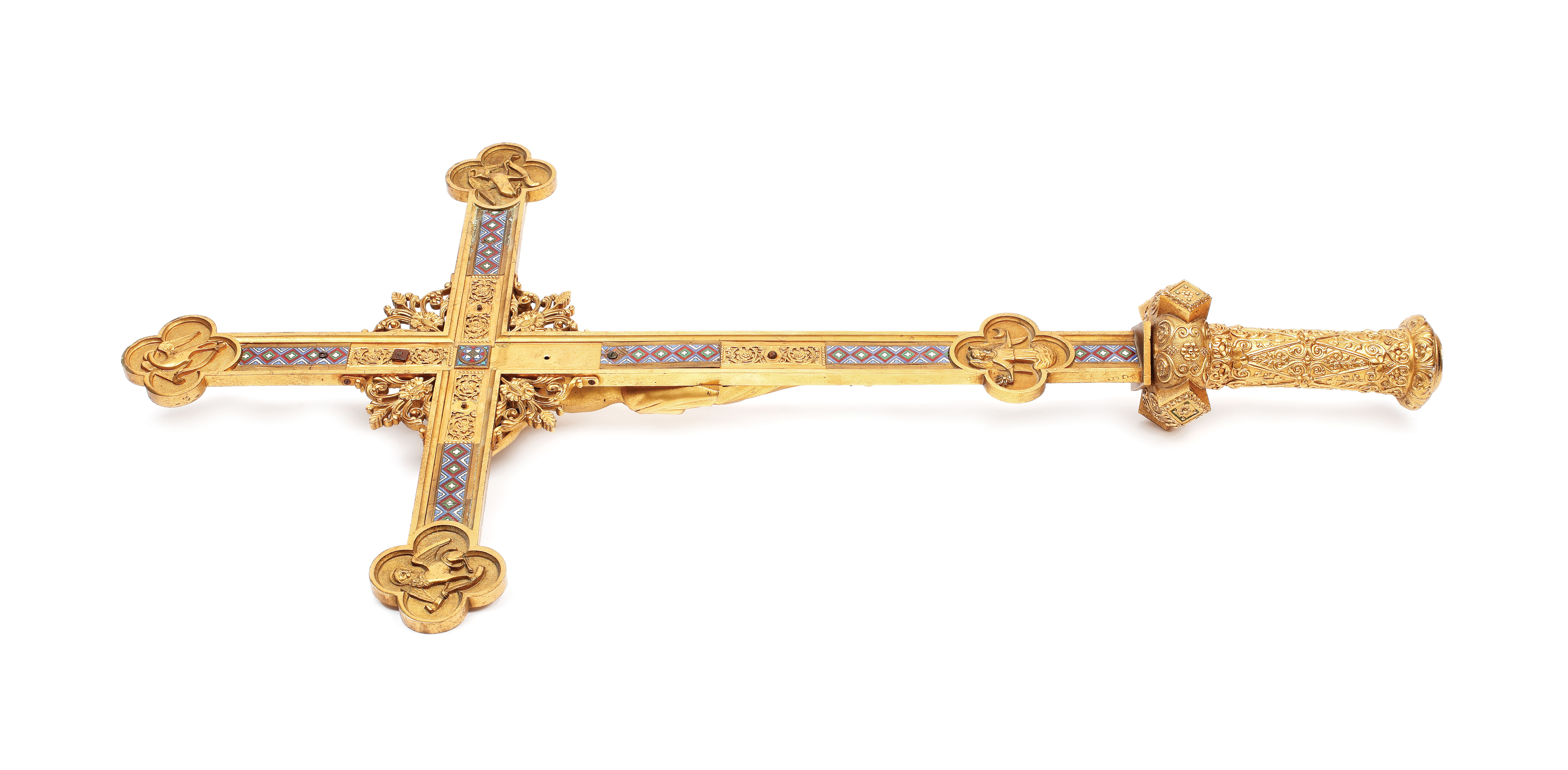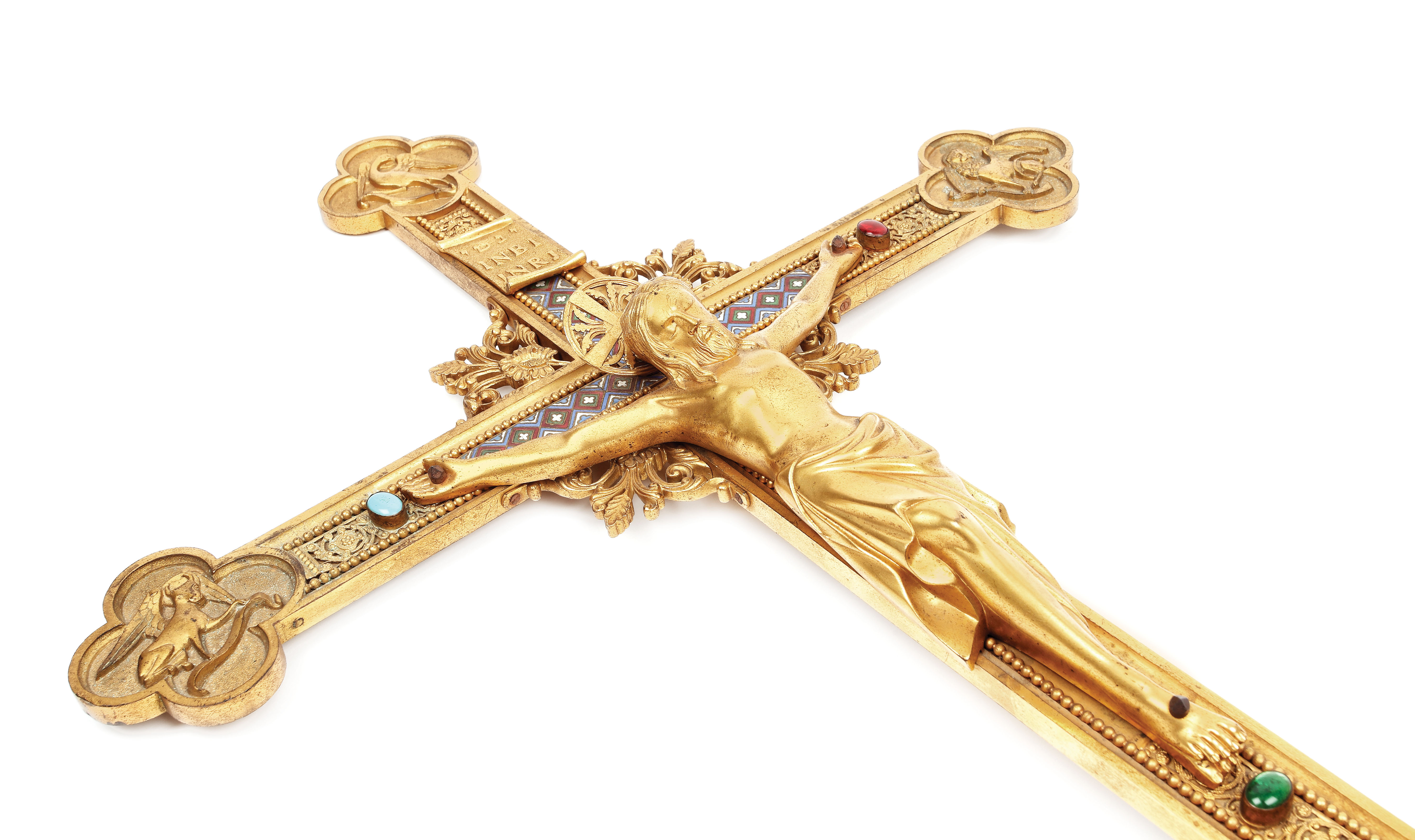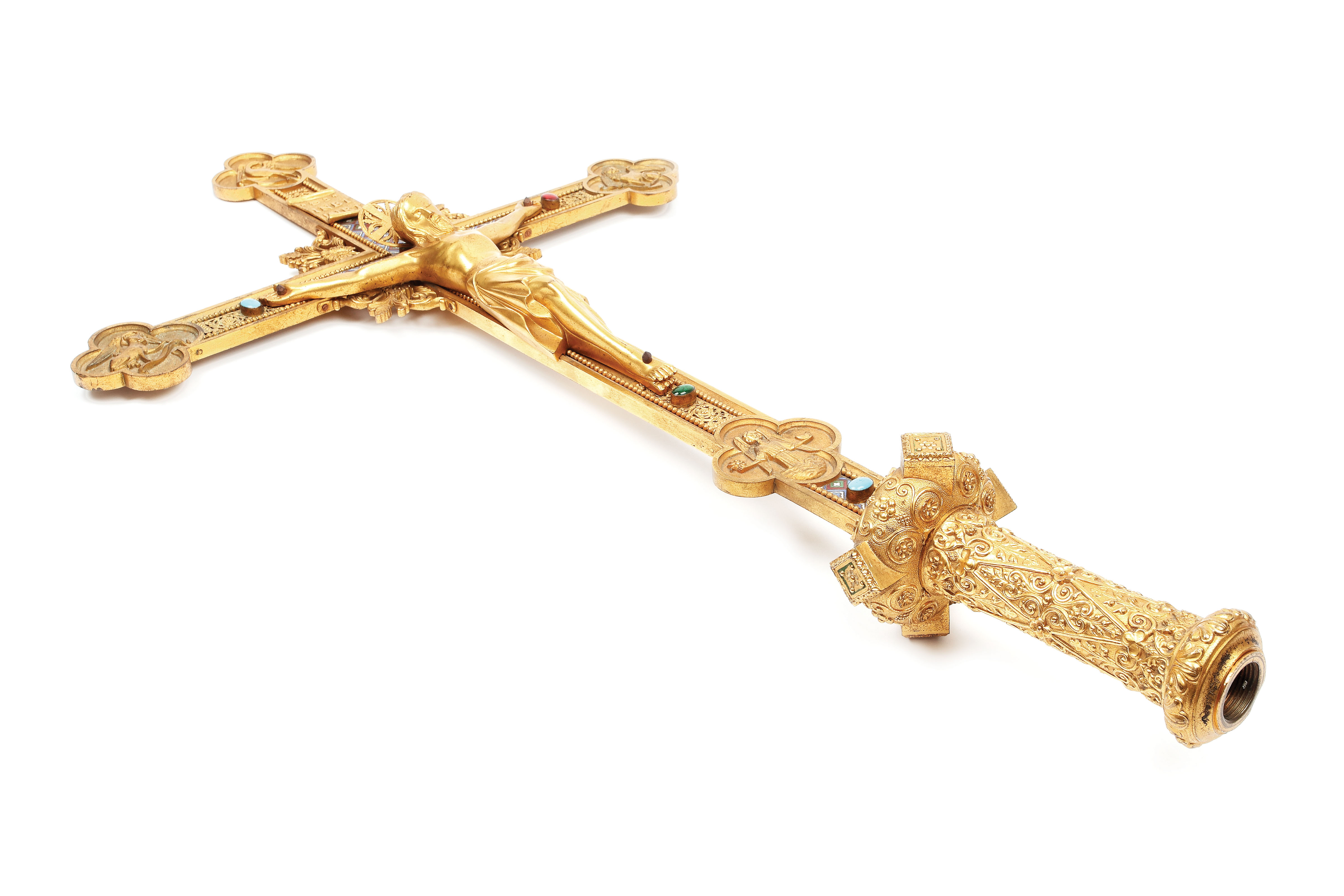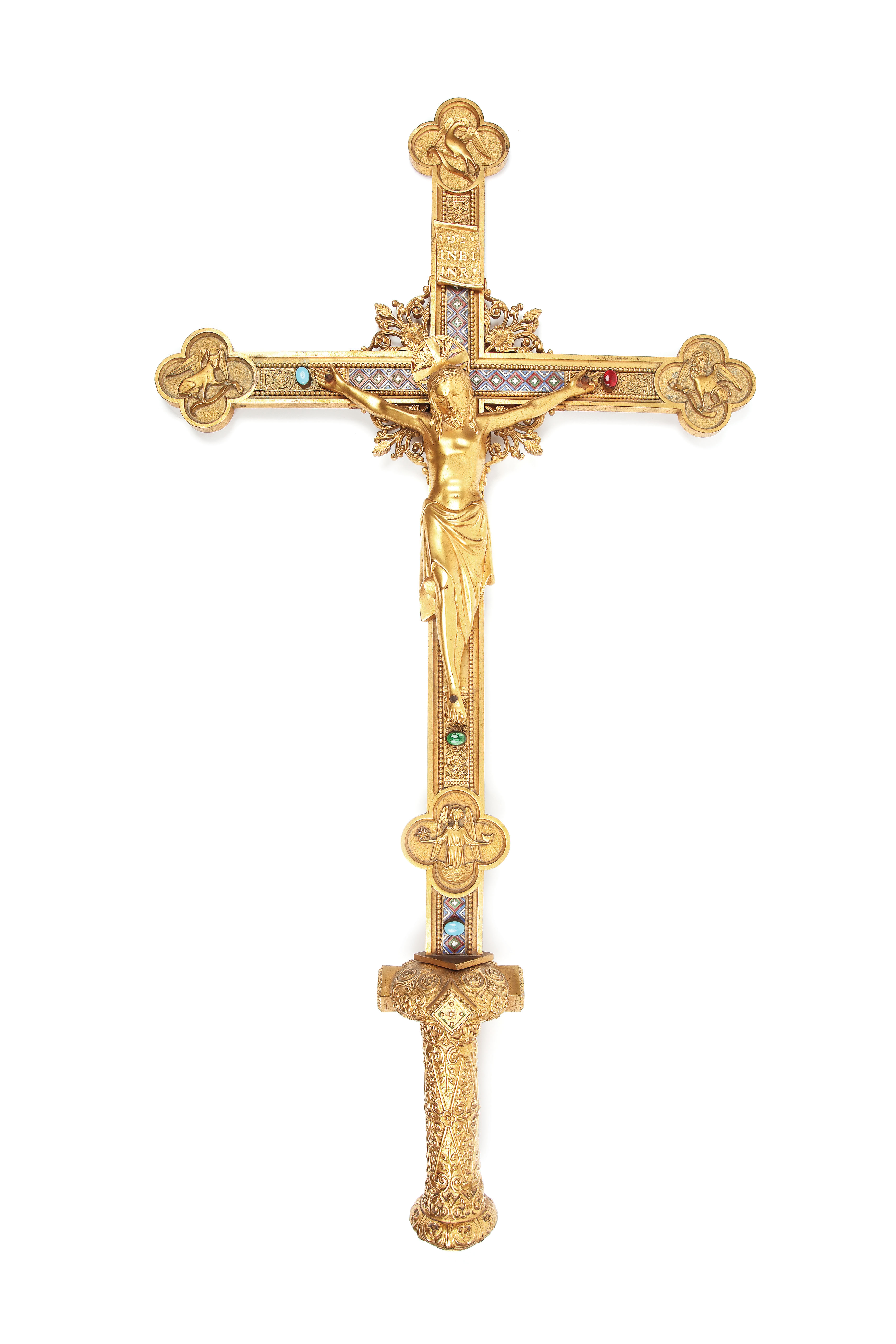 161. Cruce de altar, din bronz, decorată cu pietre semi-prețioase
