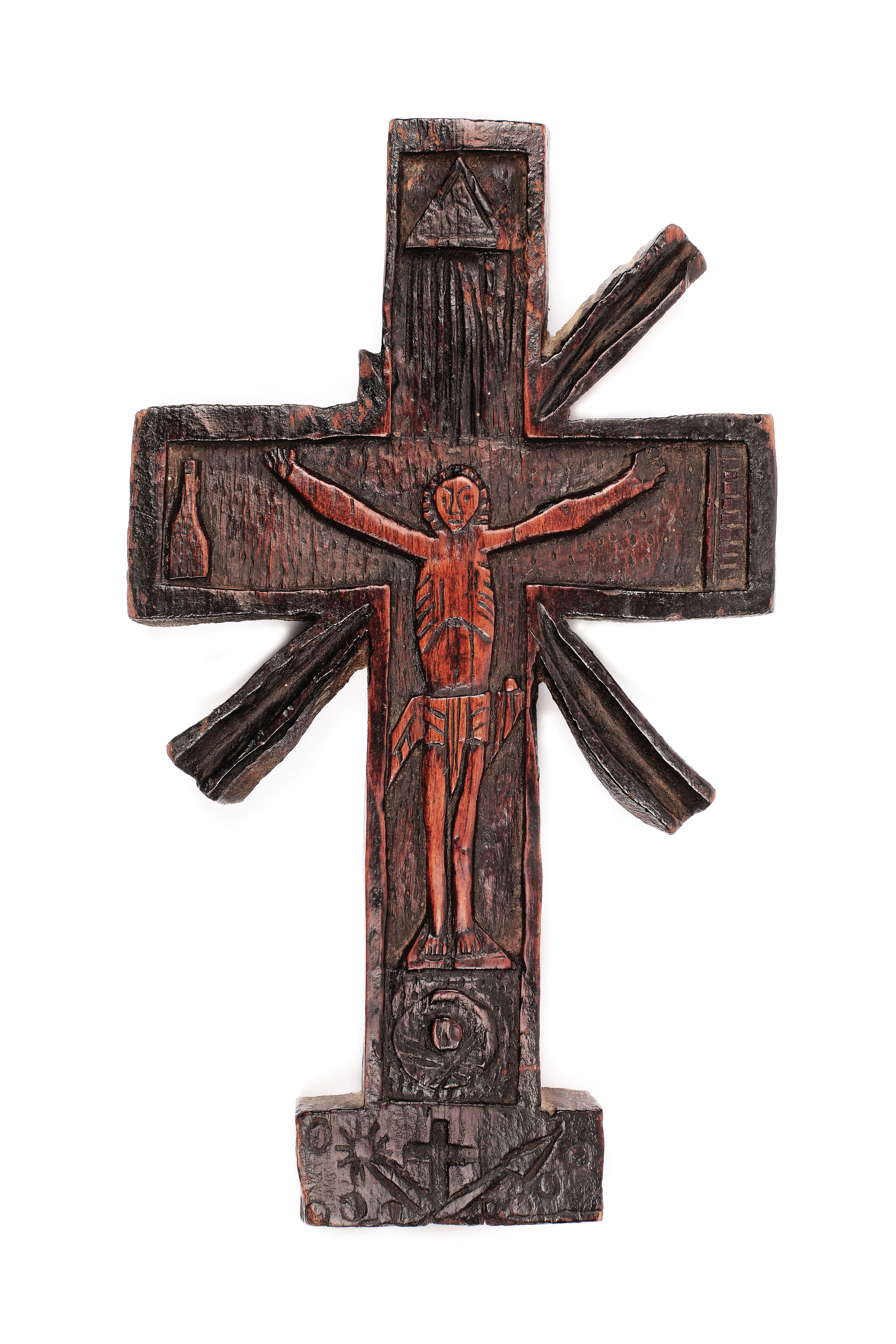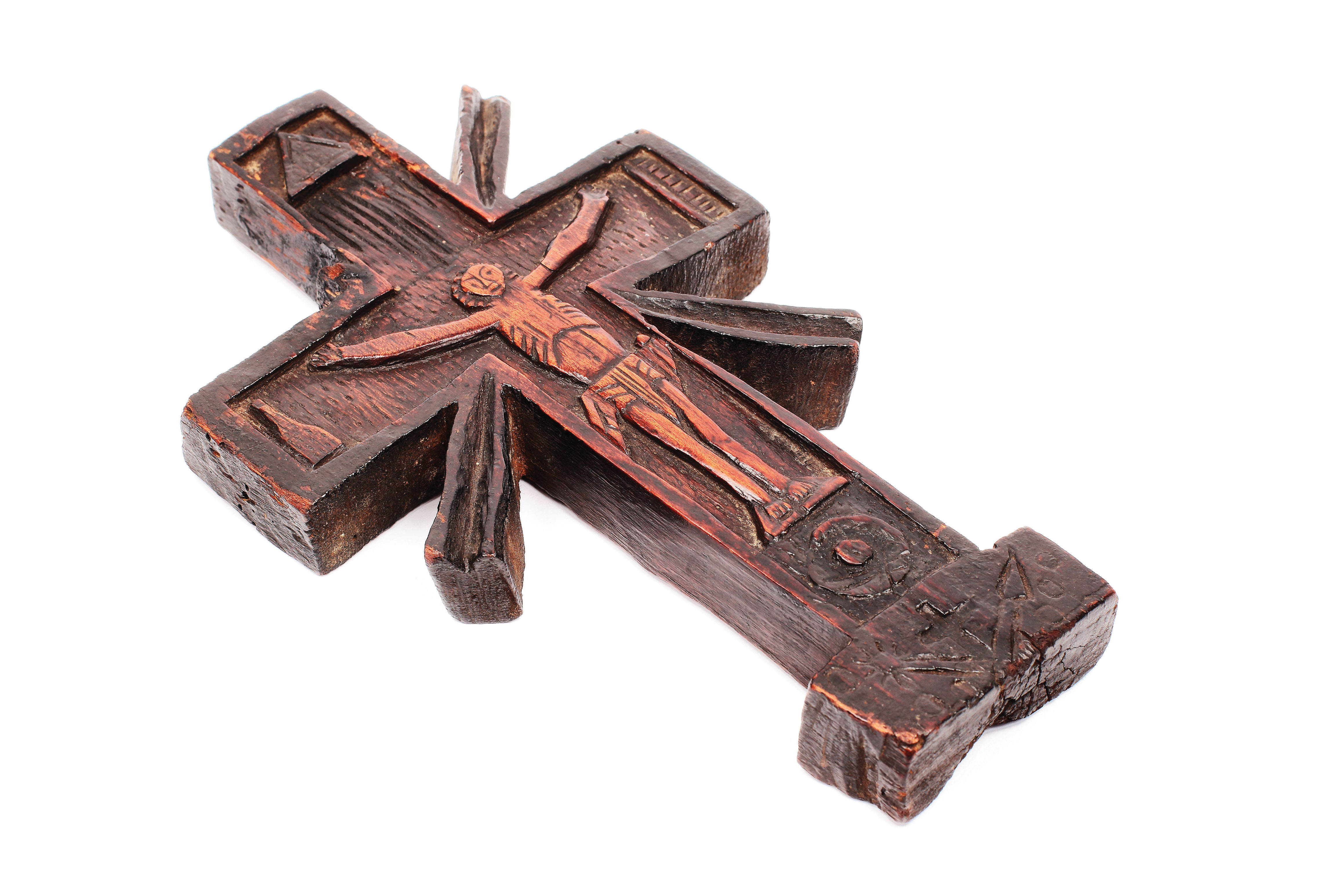 152. Cruce populară de mână, sculptată în relief cu scena "Răstignirii", între simbolurile cerului și iadului, 1825
