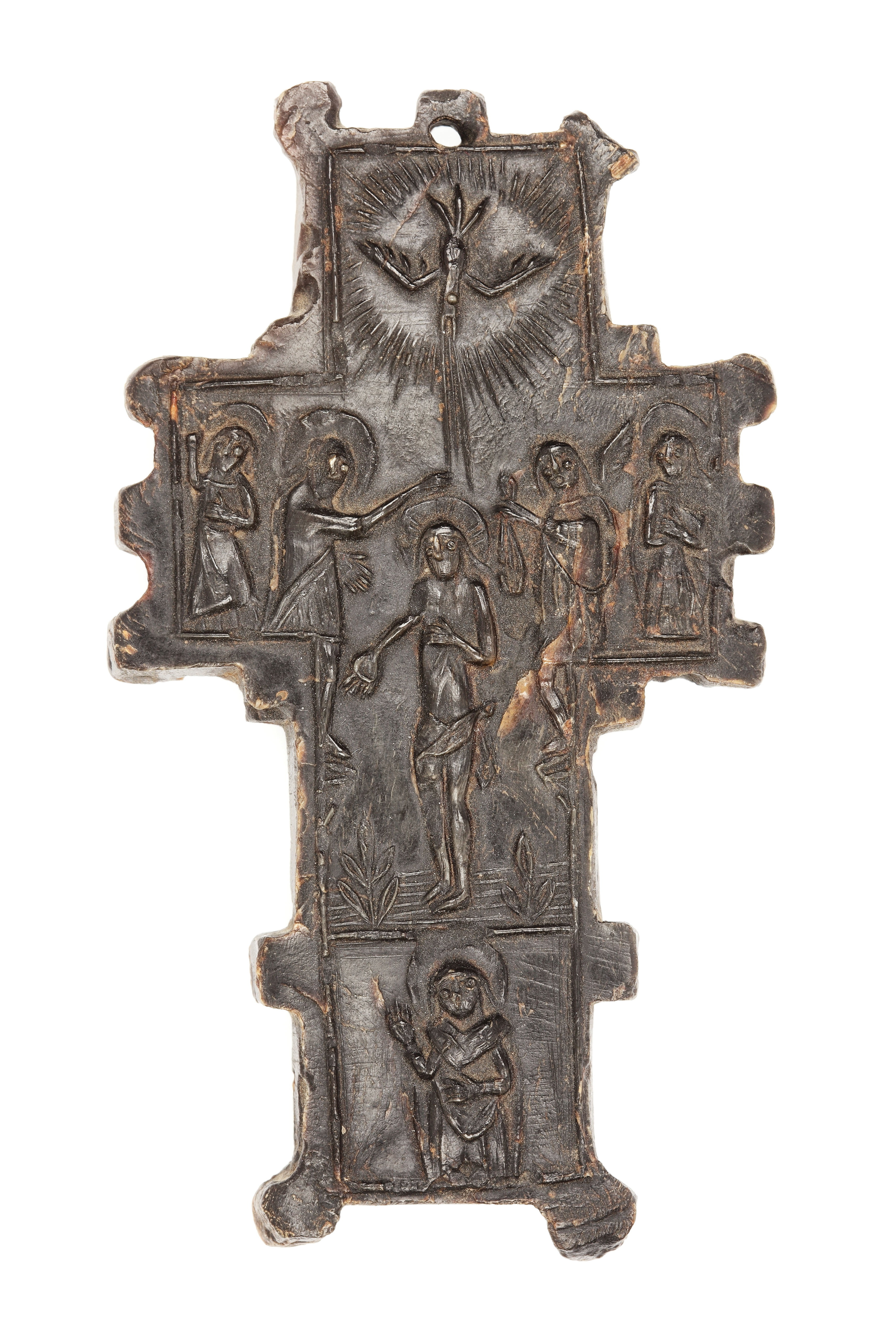 154. Crucifix de călătorie, sculptat în corn, decorat cu scene biblice de inspirație apuseană, sfârșitul sec. XIX