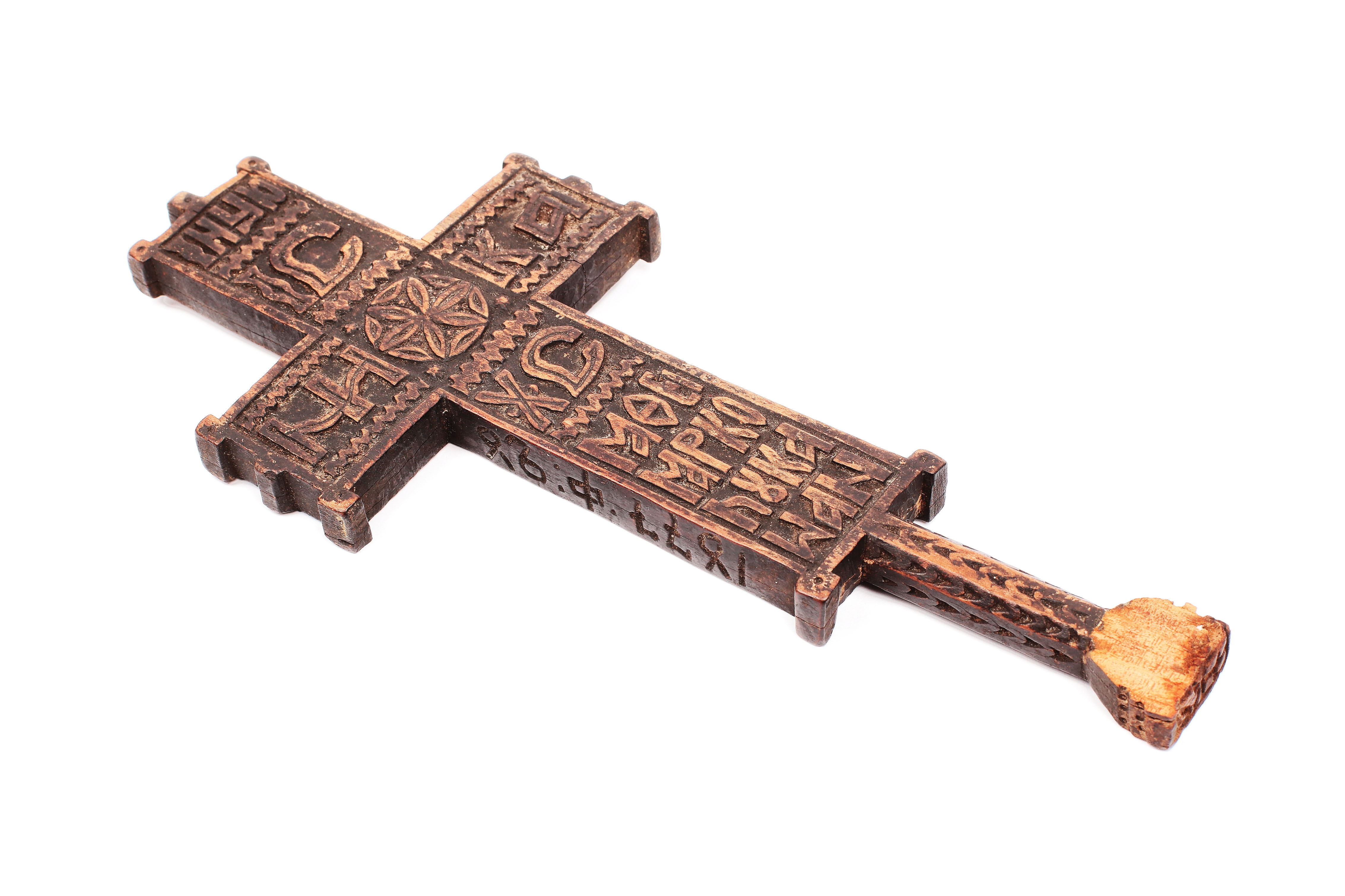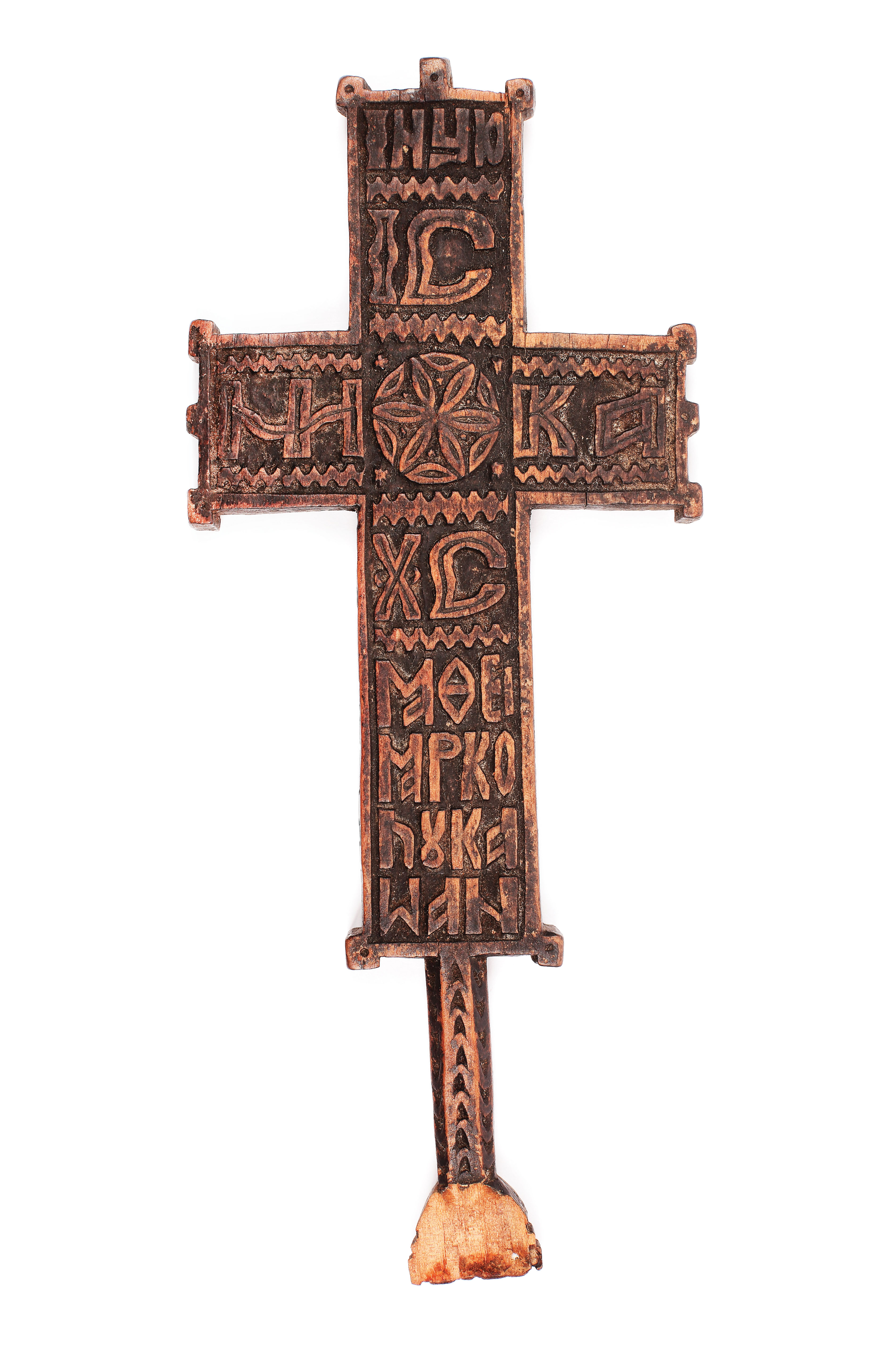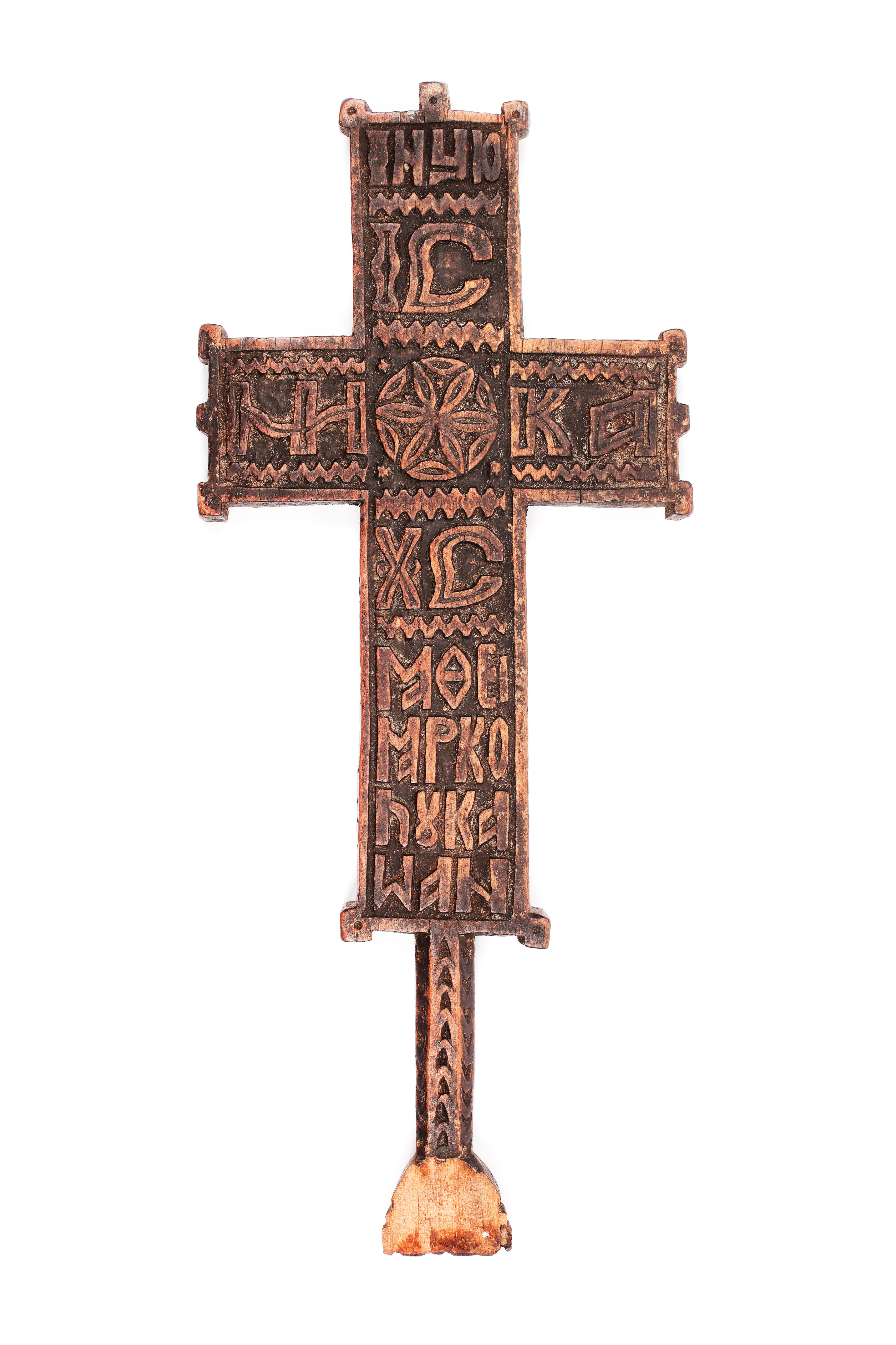 151. Crucifix din lemn, pentru binecuvântare, decorat cu rozetă și cu numele celor patru evangheliști, 1877