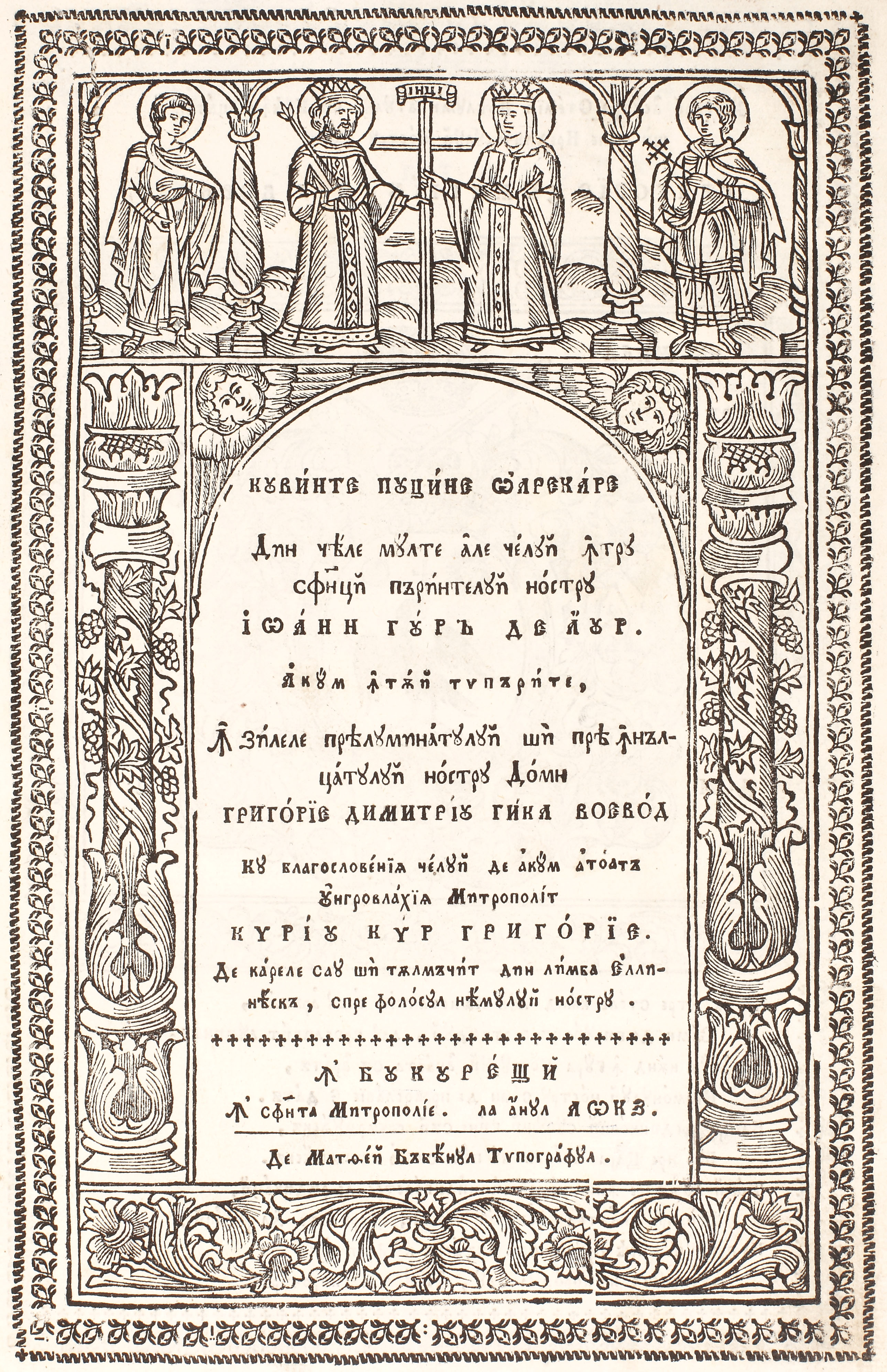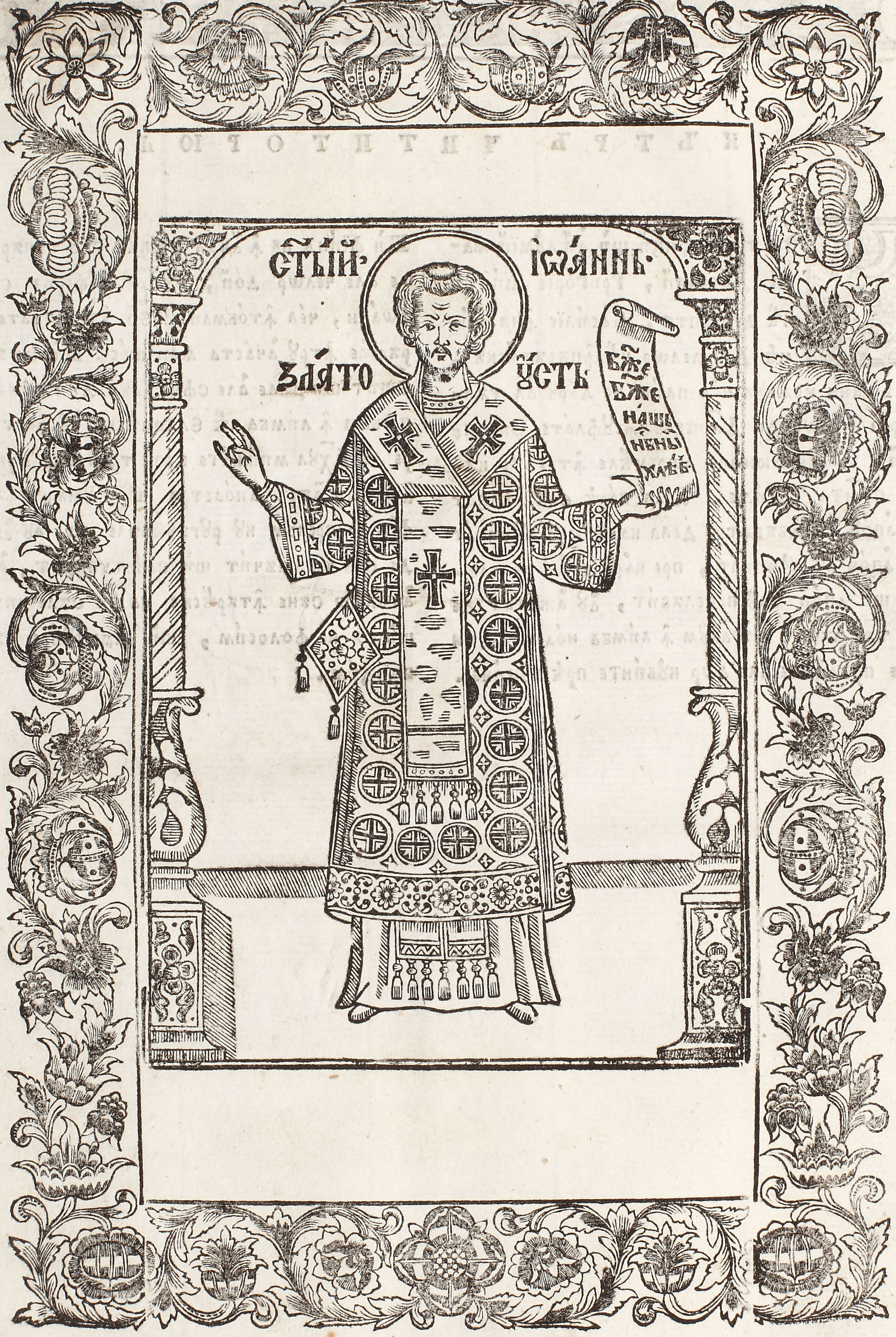 Tipar cu negru pe două coloane. Textul paginii de titlu este încadrat de o gravură al cărei cadru este compus din chipuri de sfinţi, colonade şi vrejuri. Pe versoul filei pe care s-a tipărit Prefaţa este înfăţişată o gravură mare cu reprezentarea Sf. Ioan Gură-de-Aur, iar pe versoul foii de titlu apare stema Valahiei. Sunt, în total, 42 de învățături ce narează despre: milostenie, suferință, însoțire, curvie ("pentru curvii fieștecarele să-și aibă muierea sa"), despre femeia legată de bărbat și de libertatea ei după moartea acestuia, despre erezii și rostul lor, despre femeile desfrânate, vrăjitoare, descântătoare, despre sodomia celor fără de lege ori despre cei care petrec și care se îmbată înainte de sărbătoarea Învierii Domnului. Legătura originală este din tăbliţe de lemn îmbrăcate în piele neagră decorată cu benzi din vrejuri şi flori, iar în câmpul copertei este dispusă o cruce formată din poansoane. Stare bună de conservare.