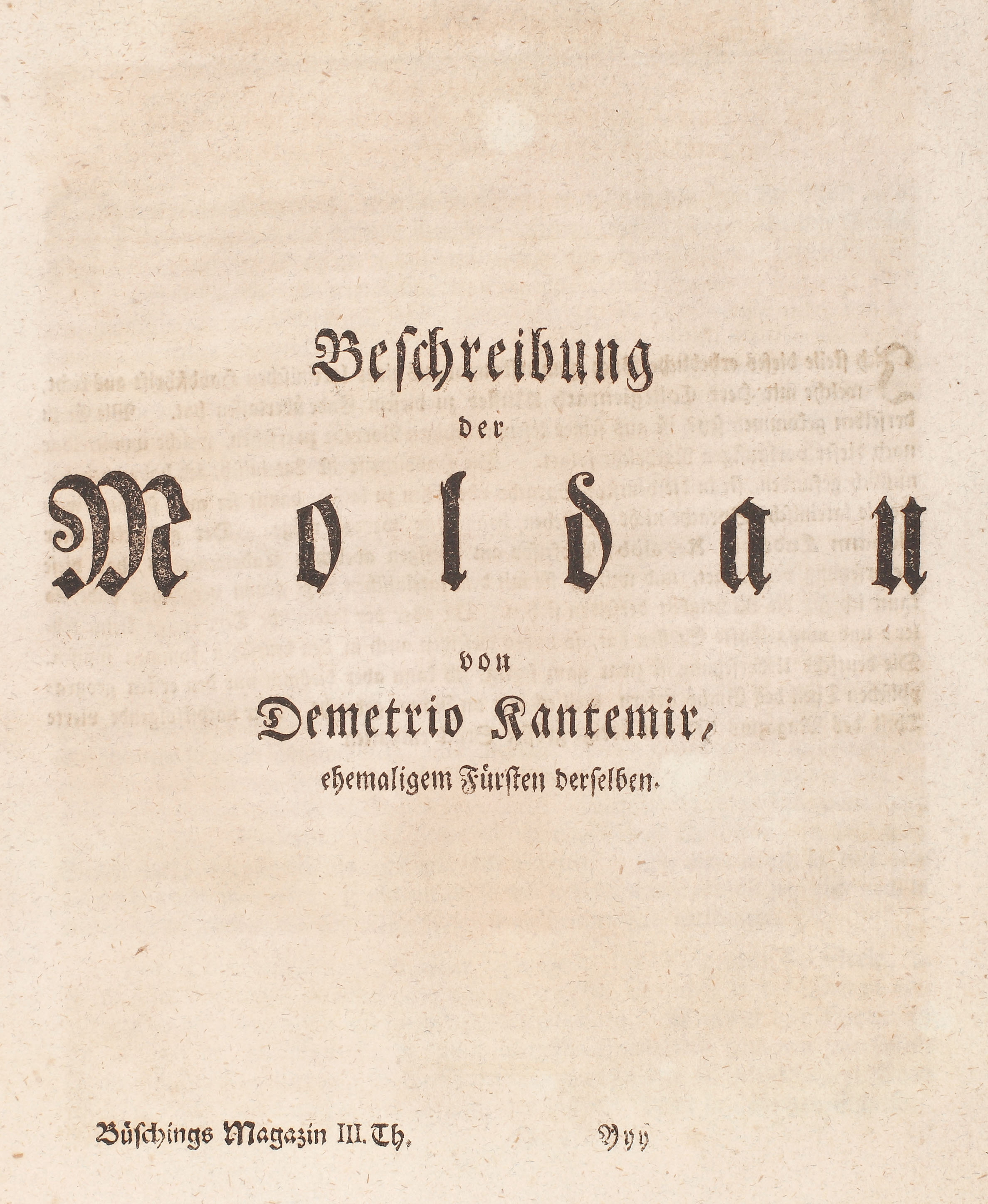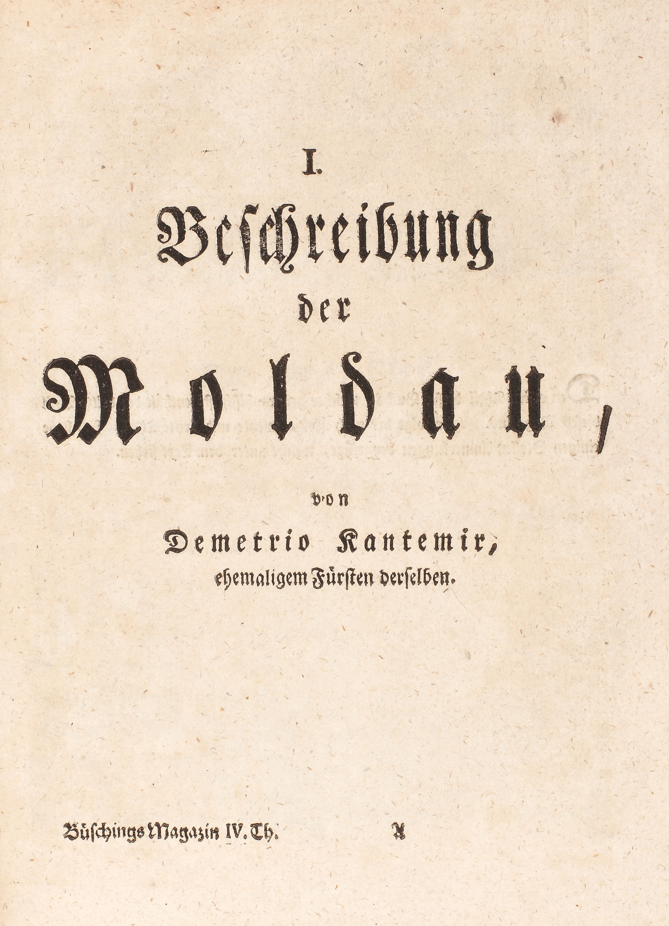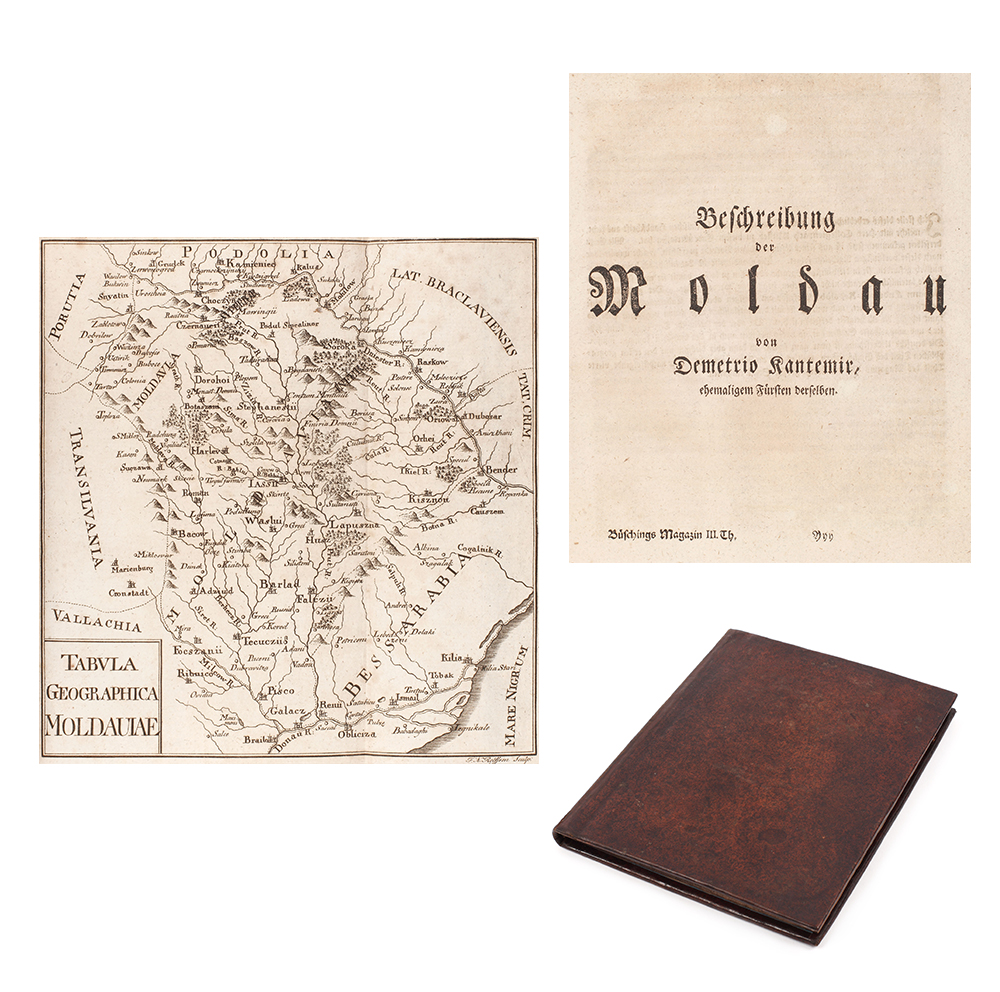"Descrierea Moldovei/Beschreibung der Moldau" este cea mai renumită şi căutată operă a ilustrului cărturar iluminist Dimitrie Cantemir, fiind considerată prima scriere ştiinţifică a unui român. Autorul tratează în lucrare o suită de teme de interes istoric precum organizarea guvernului ţării, ceremoniile obişnuite la Constantinopol la învestirea şi destituirea unui Principe, dările publice date către Poartă (100.000 taleri), instituţiile judecătoreşti, şcoala şi organizarea bisericească (arătându-se că majoritatea locuitorilor Moldovei erau ortodocşi şi că biserica moldavă aparţinea ierarhic de Constantinopol), geografia Moldovei, instituţiile politice, armata, justiţia, finanţele, moravurile, limba, religia, relaţiile Moldovei cu Turcia etc. Deşi a fost scrisă în 1716, totuşi vede lumina tiparului abia în 1769-1770, în anuarul „Magazin für die neue Historie und Geographie”, tom. II-IV, iar în volum în 1771 (Frankfurt-Leipzig). Exemplarul de faţă este un exemplar separatum, tipăritura în această formă fiind foarte rară. Exemplarul este complet şi conţine o hartă a Moldovei, gravată, semnată F.M. Rolfsem. Legătura este din piele de culoare maro marmorată. Pe copertele interioare sunt redate foile de titlu ale celor două volume din anuarul amintit mai sus.