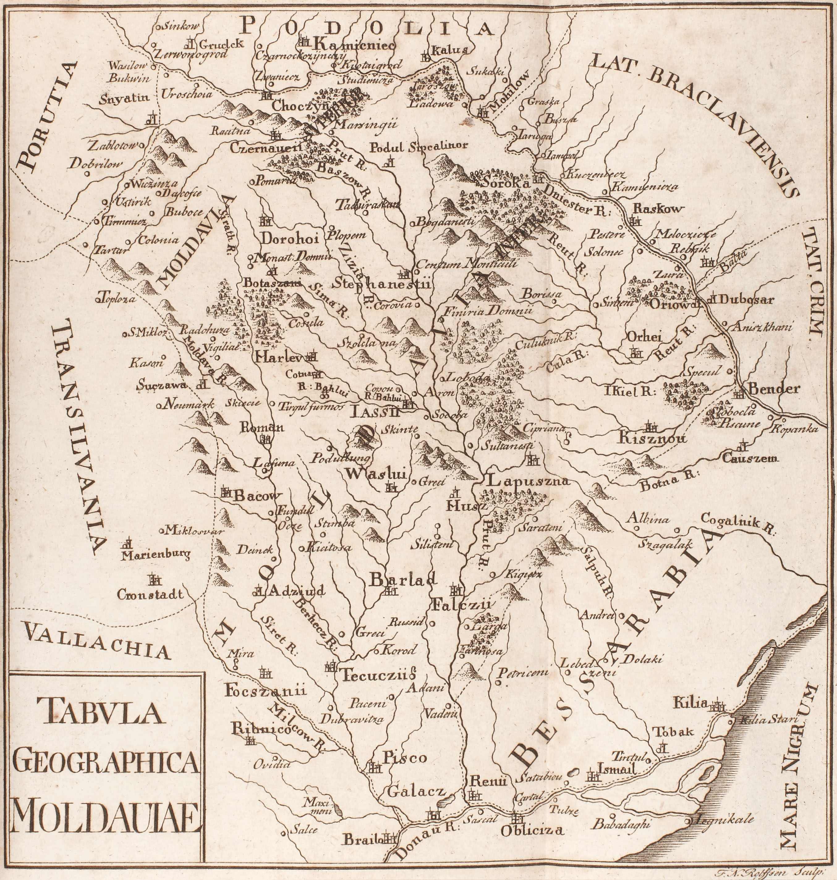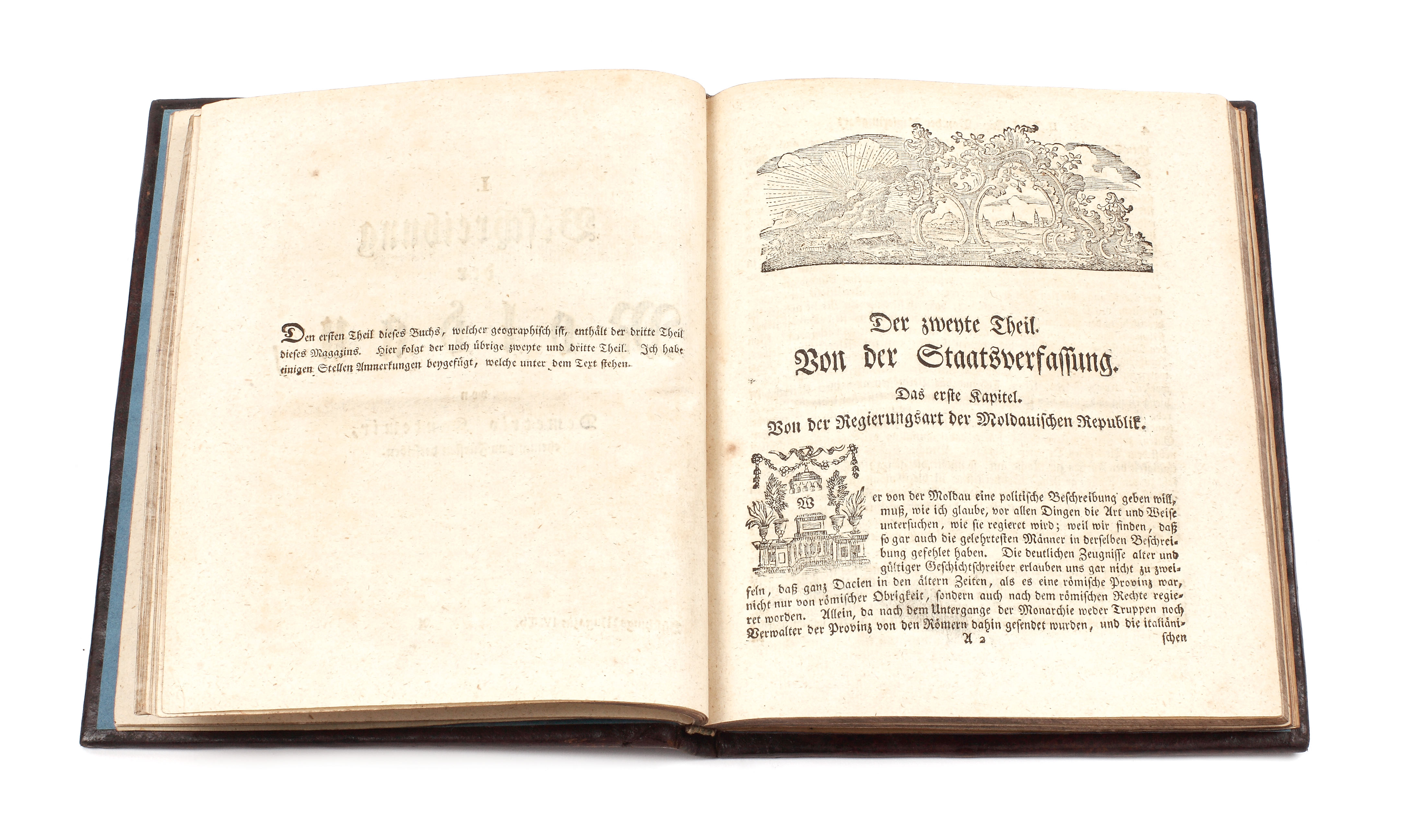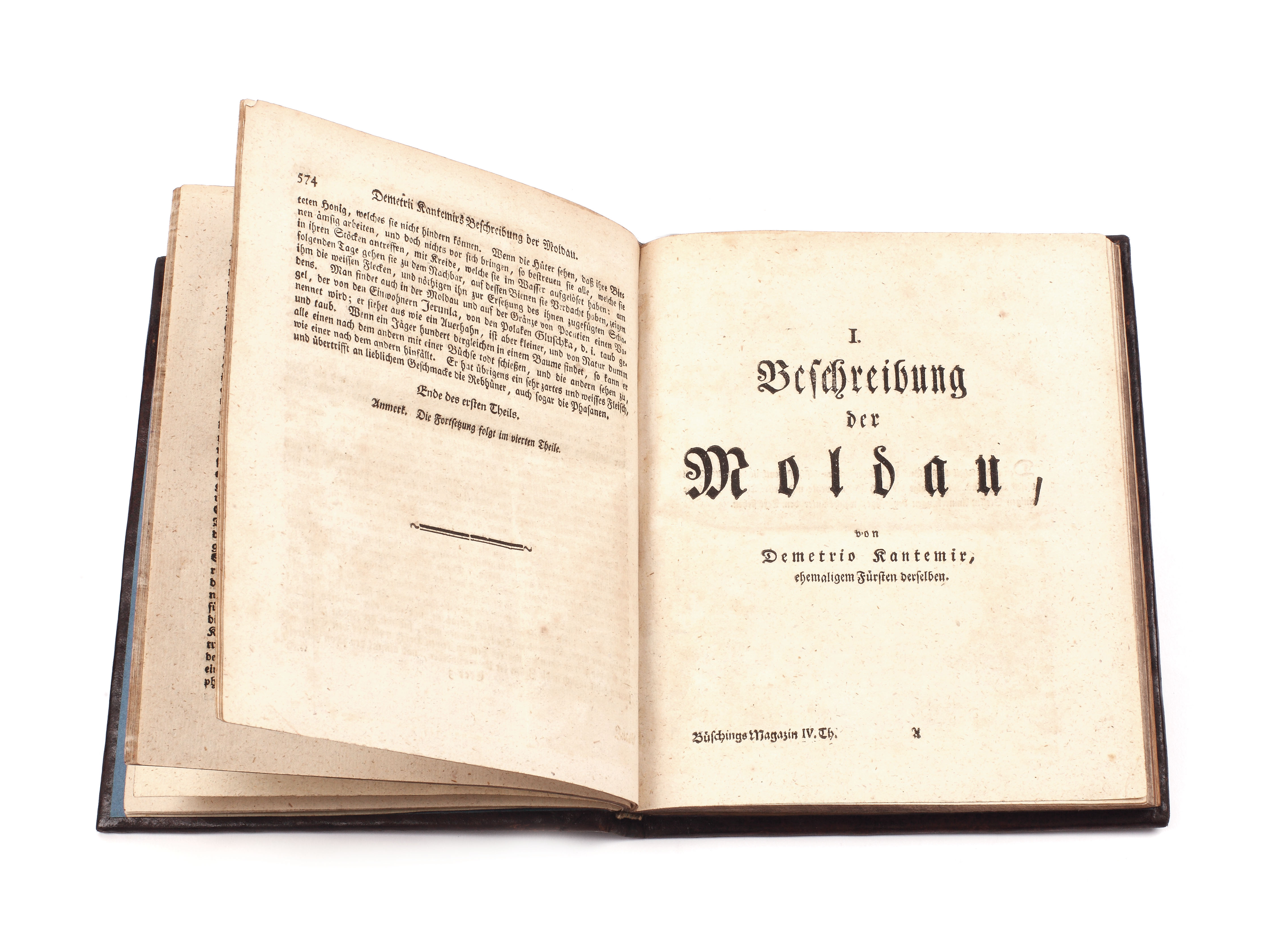 "Descrierea Moldovei/Beschreibung der Moldau" este cea mai renumită şi căutată operă a ilustrului cărturar iluminist Dimitrie Cantemir, fiind considerată prima scriere ştiinţifică a unui român. Autorul tratează în lucrare o suită de teme de interes istoric precum organizarea guvernului ţării, ceremoniile obişnuite la Constantinopol la învestirea şi destituirea unui Principe, dările publice date către Poartă (100.000 taleri), instituţiile judecătoreşti, şcoala şi organizarea bisericească (arătându-se că majoritatea locuitorilor Moldovei erau ortodocşi şi că biserica moldavă aparţinea ierarhic de Constantinopol), geografia Moldovei, instituţiile politice, armata, justiţia, finanţele, moravurile, limba, religia, relaţiile Moldovei cu Turcia etc. Deşi a fost scrisă în 1716, totuşi vede lumina tiparului abia în 1769-1770, în anuarul „Magazin für die neue Historie und Geographie”, tom. II-IV, iar în volum în 1771 (Frankfurt-Leipzig). Exemplarul de faţă este un exemplar separatum, tipăritura în această formă fiind foarte rară. Exemplarul este complet şi conţine o hartă a Moldovei, gravată, semnată F.M. Rolfsem. Legătura este din piele de culoare maro marmorată. Pe copertele interioare sunt redate foile de titlu ale celor două volume din anuarul amintit mai sus.