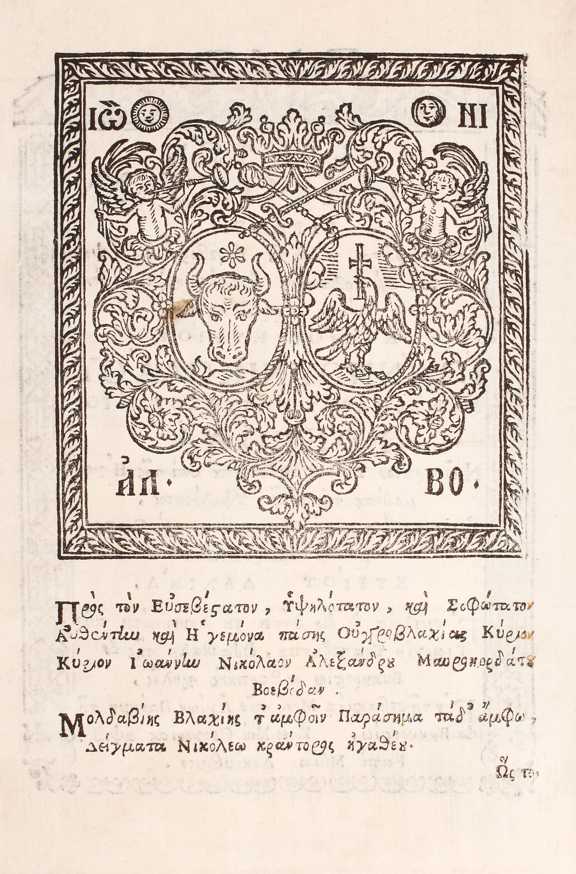 Ediţia I. Tipar cu negru. Titlu încadrat de o compoziţie tipografică, iar pe verso stema Moldovei şi a Ţării Româneşti, cu iniţialele lui Mavrocordat. Sub stemă se pot lectura versurile de laudă ale lui Gheorghe din Trapezunt, dascăl la Şcoala Domnească din Bucureşti. Volum legat integral în piele maronie ornată cu fleuroane în plan central, pe ambele coperte. Stare bună de conservare.