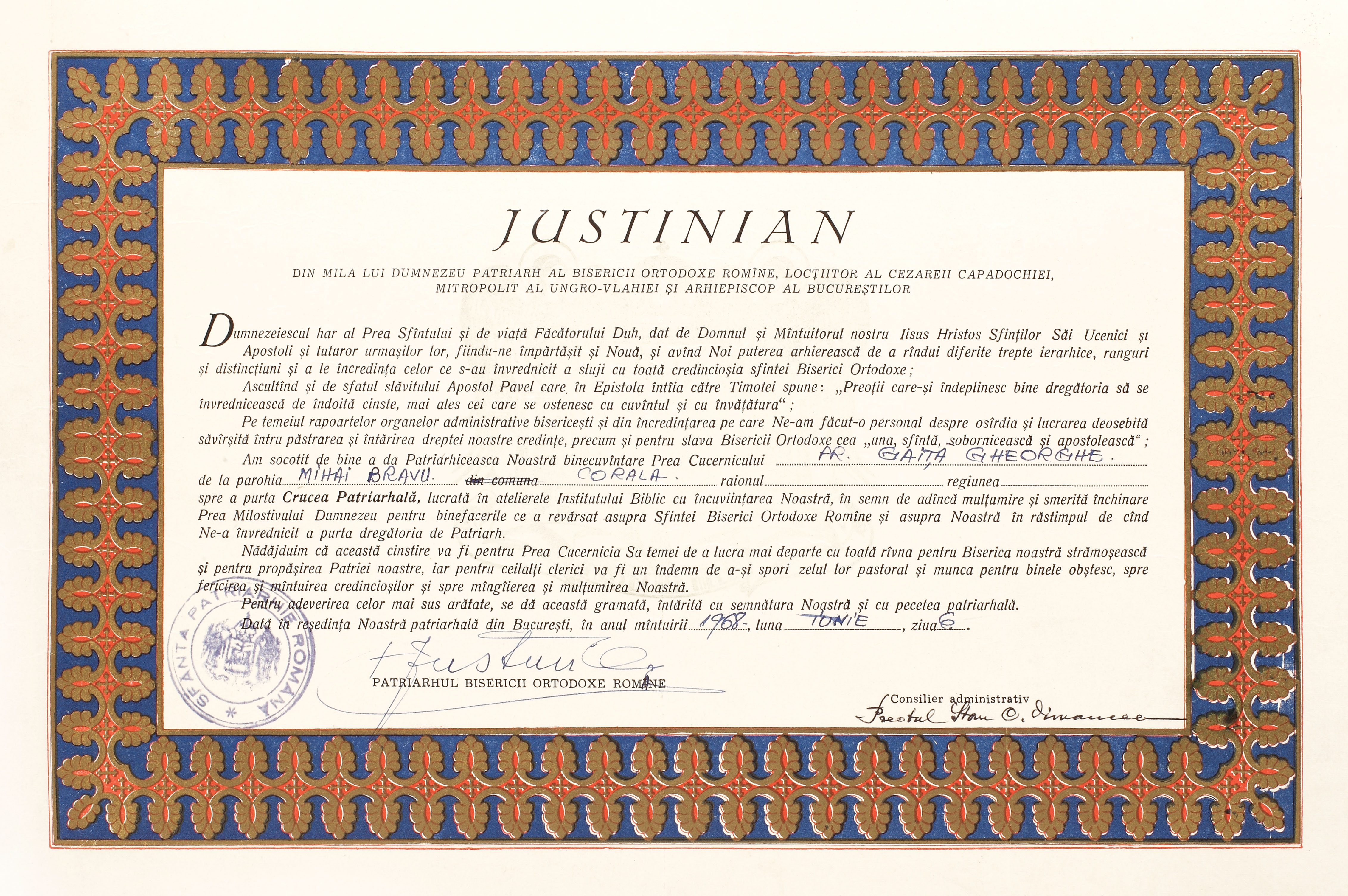 195. Diplomă de acordare a distincției ”Crucea Patriarhală” către preotul Gh. Gaiță, semnată de Patriarhul Justinian, 1968