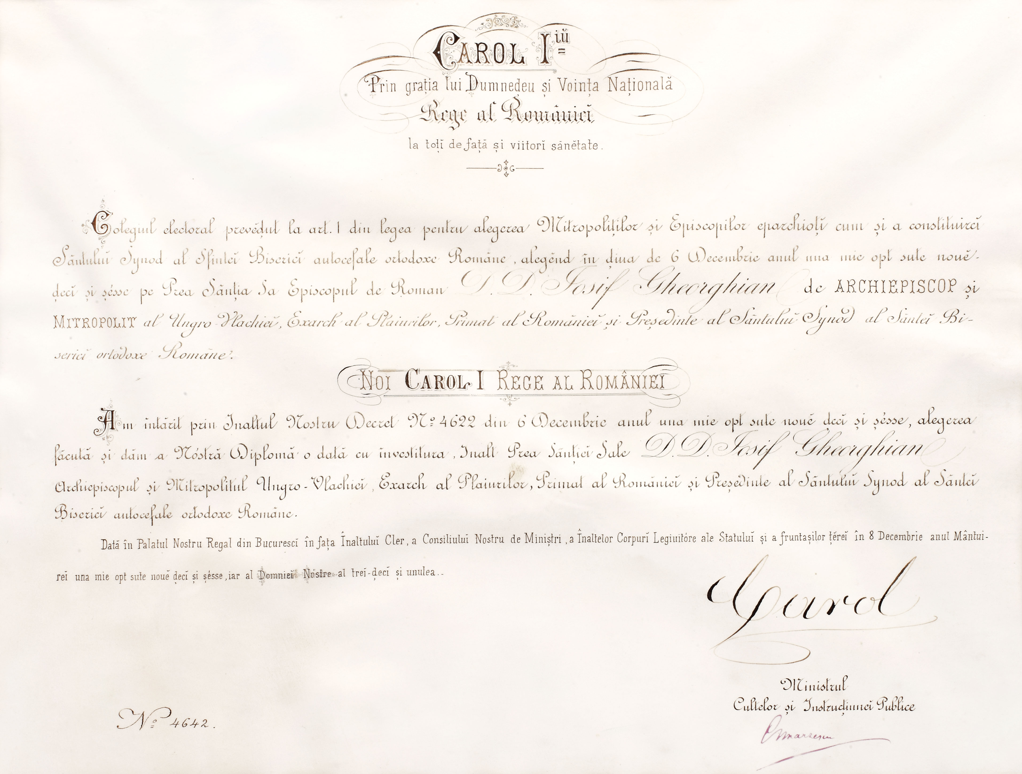 194. Diplomă de învestire în funcție a Mitropolitului D.D. Iosif Gheorghian, semnată olograf de Regele Carol I, 1896