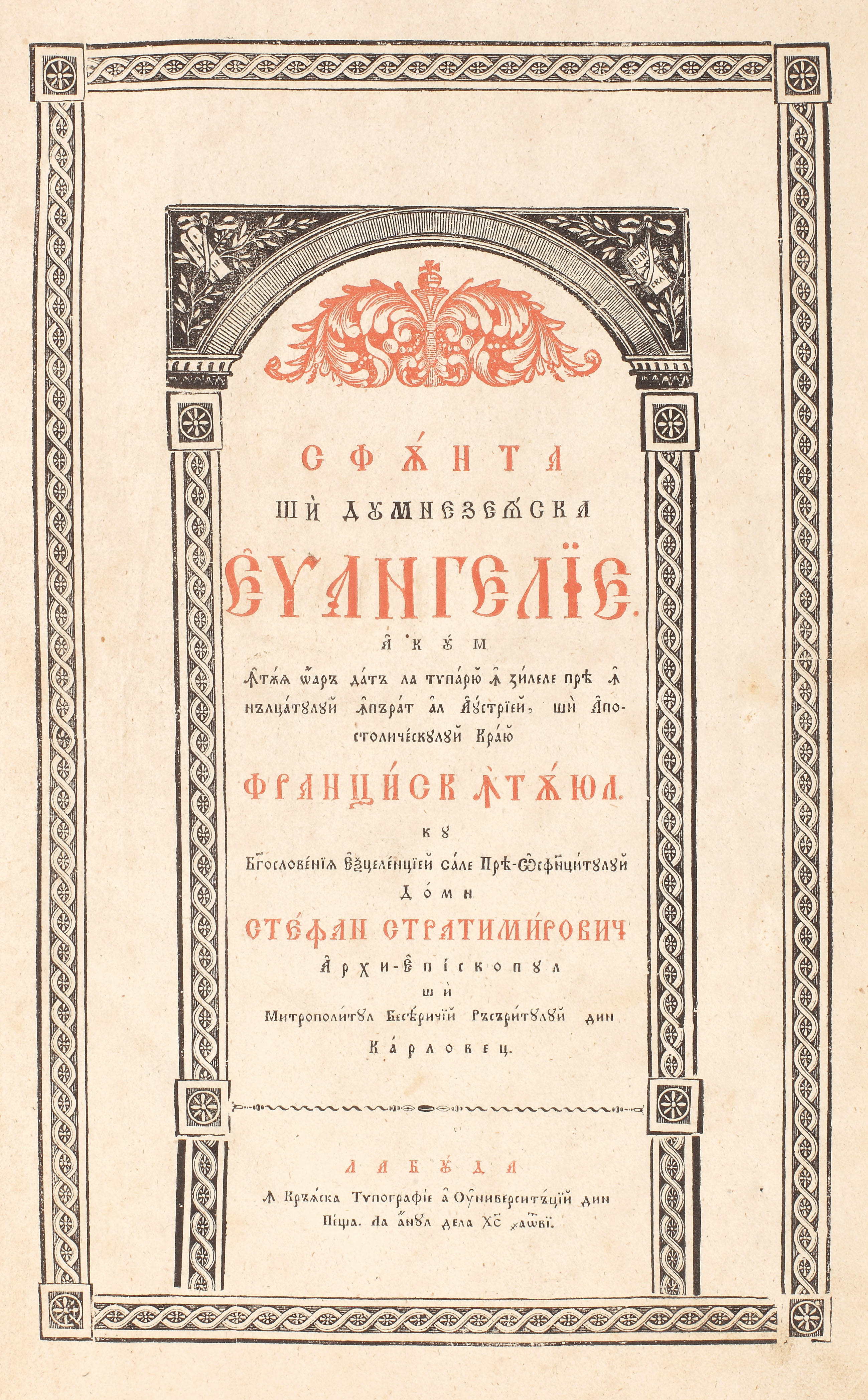 Romanian in Cyrillic script; printed in black and red; paper of Viennese origin (Mathes mill); complete copy, (2) + 141 + (11) pages