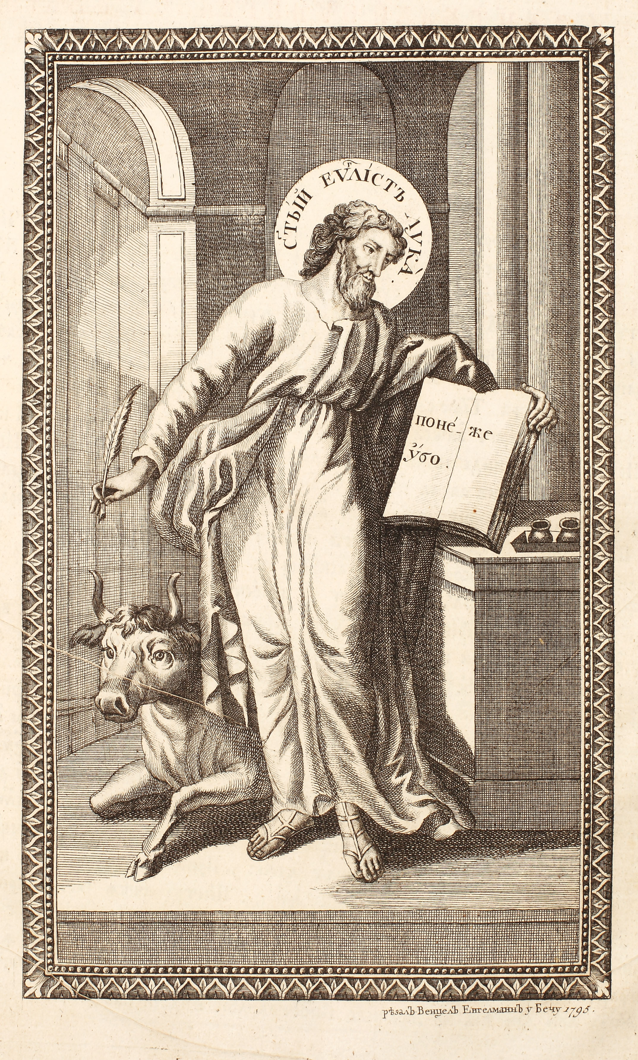 Tipar îngrijit, pe două coloane. Elementul grafic de excepţie este dat de cele patru gravuri în plină pagină reprezentându-i pe Evangheliştii Ioan, Matei, Luca şi Marcu datate 1794 şi 1795 şi sculptate de gravorul vienez Wenzel Engelmann, specializat şi în gravarea hărţilor. Aceste gravuri au fost concepute iniţial pentru a ilustra o ediţie a Bibliei, cu caractere chirilice, dar proiectul a fost abandonat. Tirajul lucrării a fost de 1500 de exemplare şi s-a epuizat în 1816. Legătura cărţii este din tăbliţe de lemn învelite în piele de culoare maro de corată pe ambele coperte cu câte un chenar dublu din motive tipografice. Compoziţia copertei superioare este de tip centru-colţ, cu cei patru Evanghelişti la colţuri şi "Răstignirea Domnului" în centru; pe ultima copertă, în centru, este ilustrată "Maica Domnului cu Pruncul". Ambele coperte sunt aurite. Legătura este cea originală, excepţie făcând închizătorile.