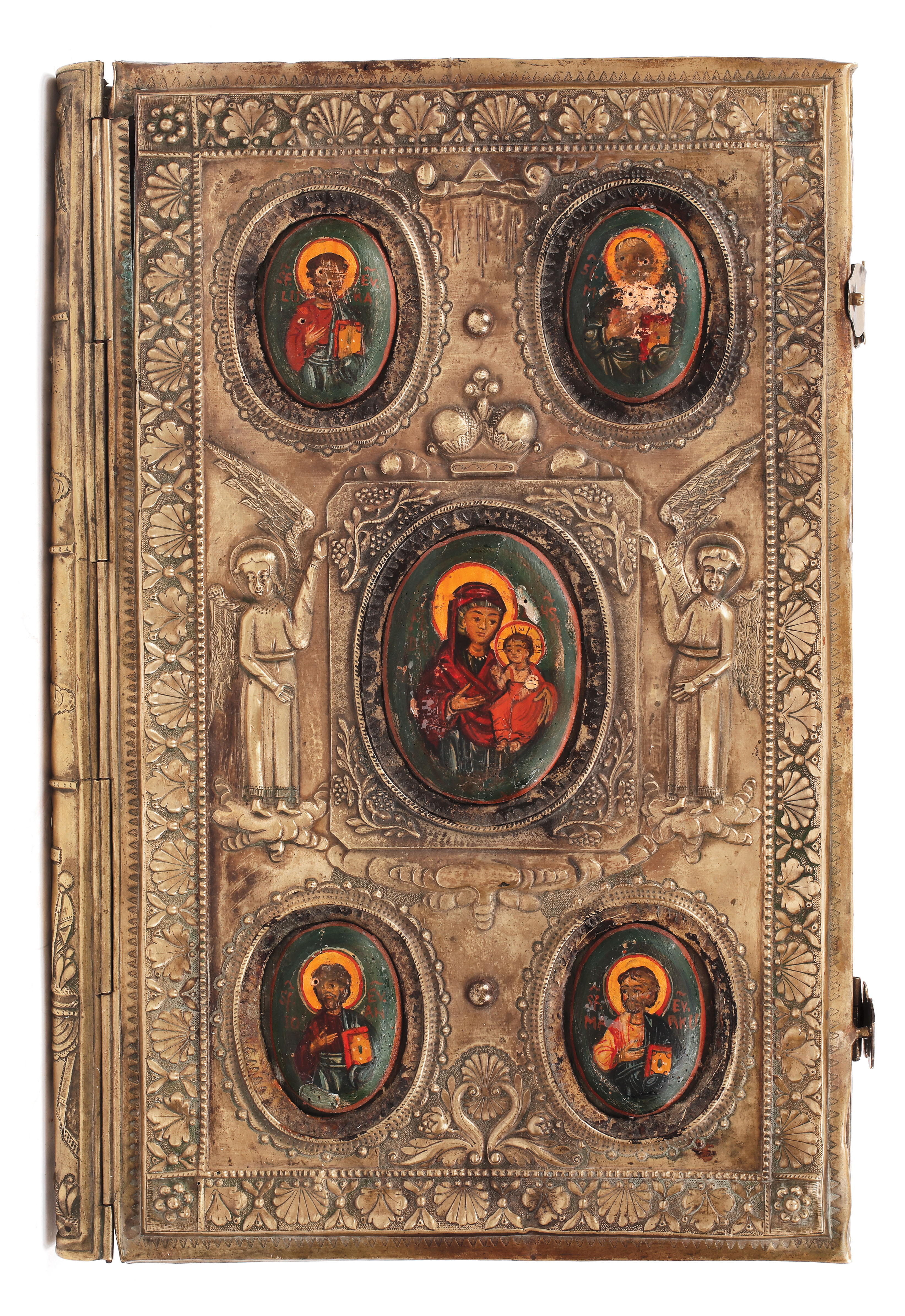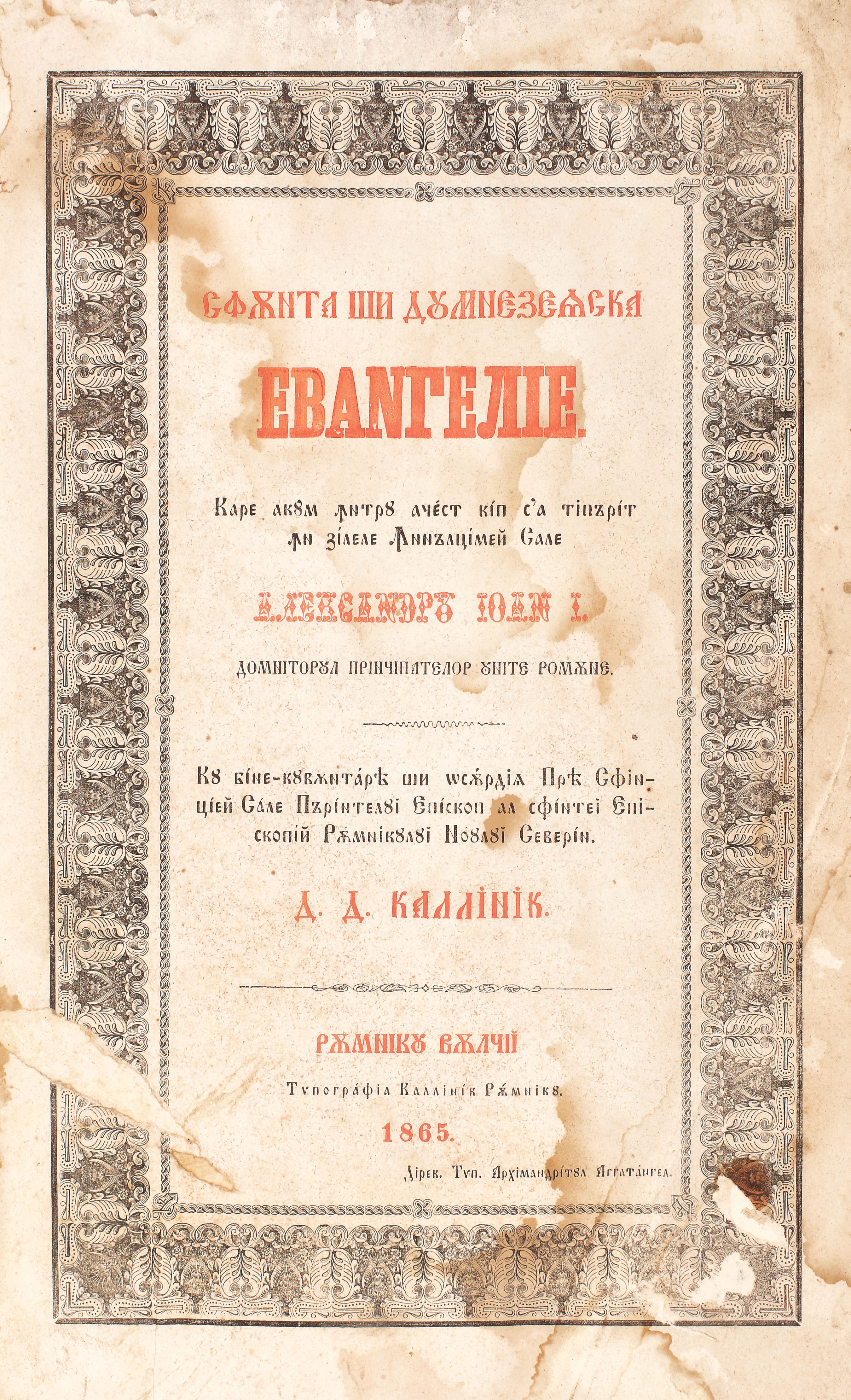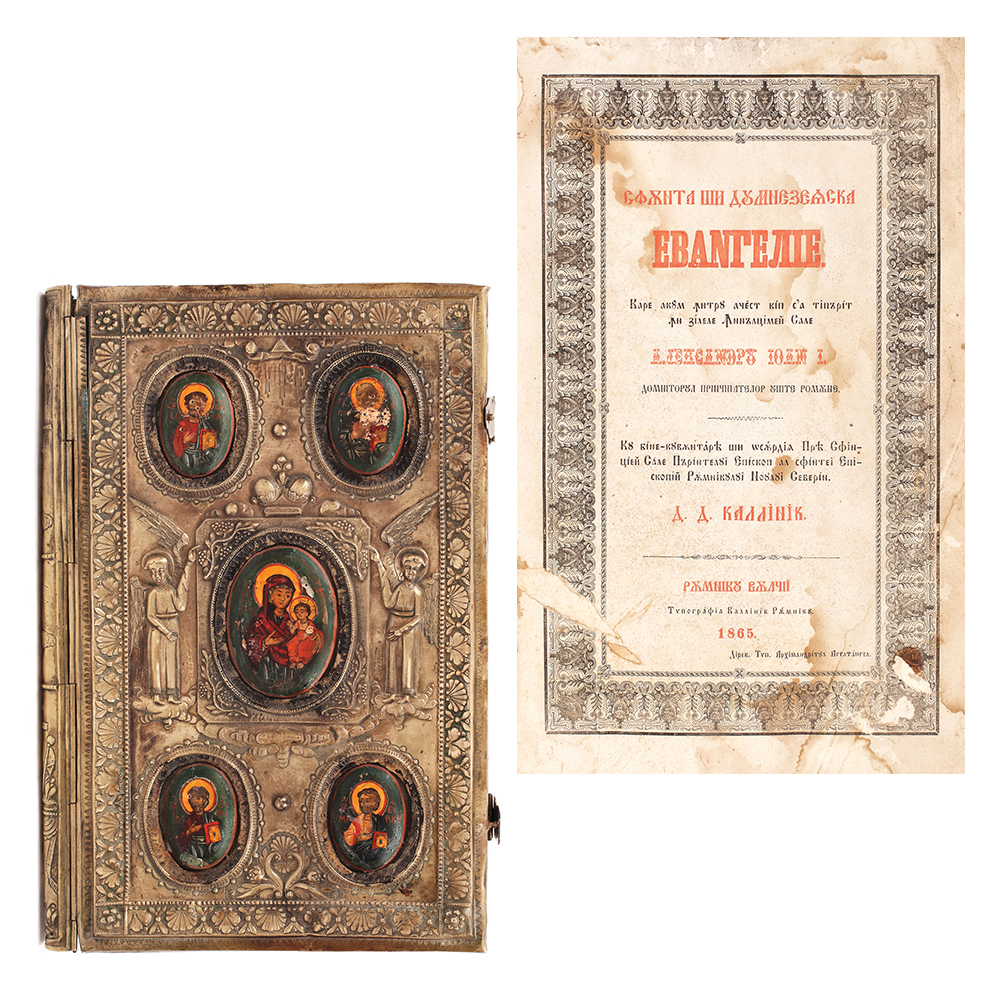 Episcop de Râmnicul Noului Severin, D. D. Calinic Această ediţie a Evangheliei, îngrijită de D.D. Calinic, Episcopul de Râmnicul Noului Severin, este tipărită în 2 coloane, cu iniţiale roşii şi gravuri în plină pagină cu Evangheliştii şi gravuri cu scene biblice la începutul fiecărei Evanghelii. Volumul are dimensiuni 35 x 24 cm, dar i-a fost adăugată o ferecătură mai mare, cu dimensiuni 45 x 31 cm, situaţie întâlnită la mai multe cărţi în trecut. Ferecătura este din alamă lucrată în tehnica ciocănirii: coperta din faţă prezintă un chenar floral ce încadrează patru medalioane din lemn pictat dispuse la colţuri, reprezentându-i pe Evanghelişti, iar în centru un alt medalion cu Maica Domnului cu Pruncul, susţinut de doi îngeri. Coperta din spate are un chenar floral care închide icoana Sf. Treimi, varianta canonică cu arătarea persoanelor treimice lui Avraam la Stejarul Mamvri. Sub scenă un text slavon. Cotorul este plin şi are cinci compartimente cu simboluri religioase. Posibil secol XIX, lipovenească.