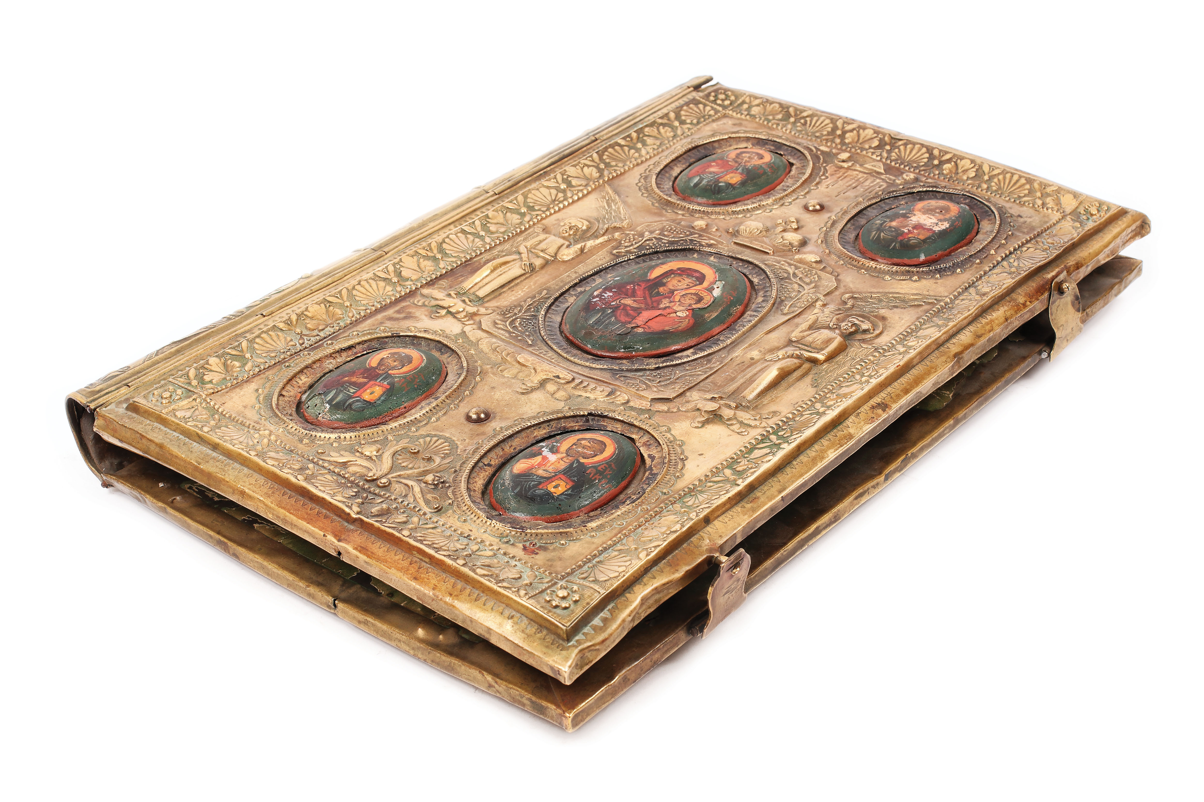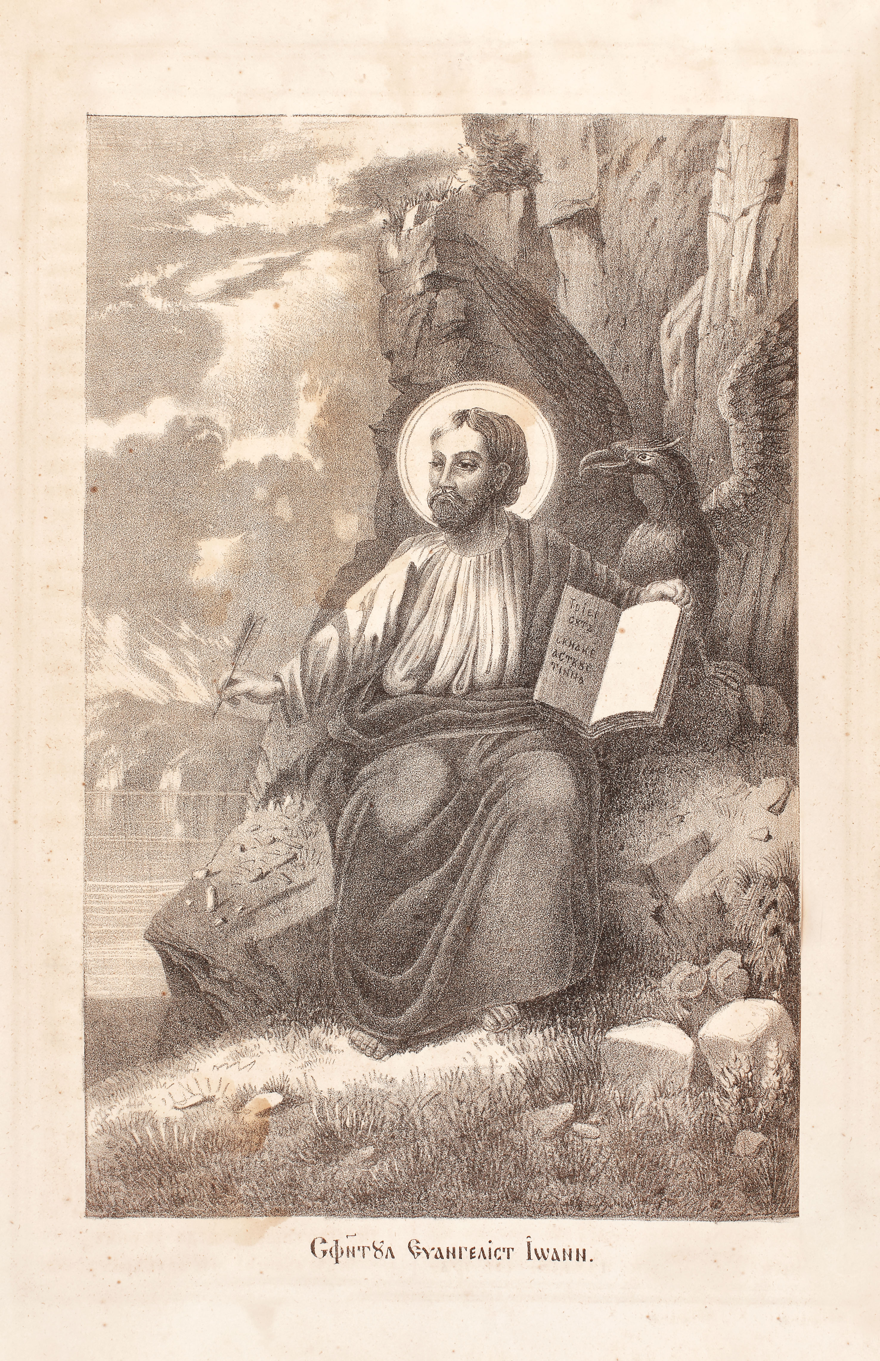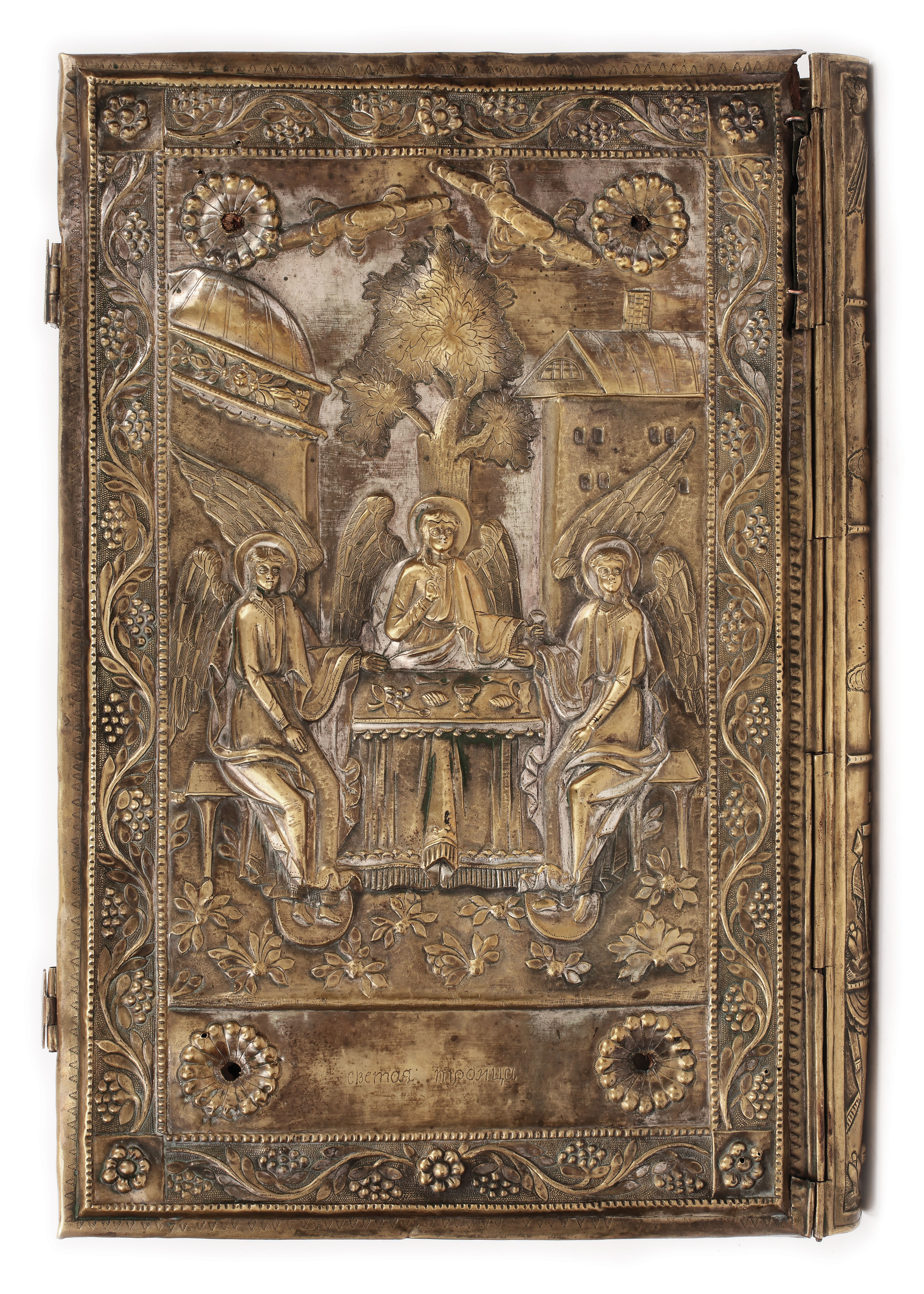 Episcop de Râmnicul Noului Severin, D. D. Calinic Această ediţie a Evangheliei, îngrijită de D.D. Calinic, Episcopul de Râmnicul Noului Severin, este tipărită în 2 coloane, cu iniţiale roşii şi gravuri în plină pagină cu Evangheliştii şi gravuri cu scene biblice la începutul fiecărei Evanghelii. Volumul are dimensiuni 35 x 24 cm, dar i-a fost adăugată o ferecătură mai mare, cu dimensiuni 45 x 31 cm, situaţie întâlnită la mai multe cărţi în trecut. Ferecătura este din alamă lucrată în tehnica ciocănirii: coperta din faţă prezintă un chenar floral ce încadrează patru medalioane din lemn pictat dispuse la colţuri, reprezentându-i pe Evanghelişti, iar în centru un alt medalion cu Maica Domnului cu Pruncul, susţinut de doi îngeri. Coperta din spate are un chenar floral care închide icoana Sf. Treimi, varianta canonică cu arătarea persoanelor treimice lui Avraam la Stejarul Mamvri. Sub scenă un text slavon. Cotorul este plin şi are cinci compartimente cu simboluri religioase. Posibil secol XIX, lipovenească.