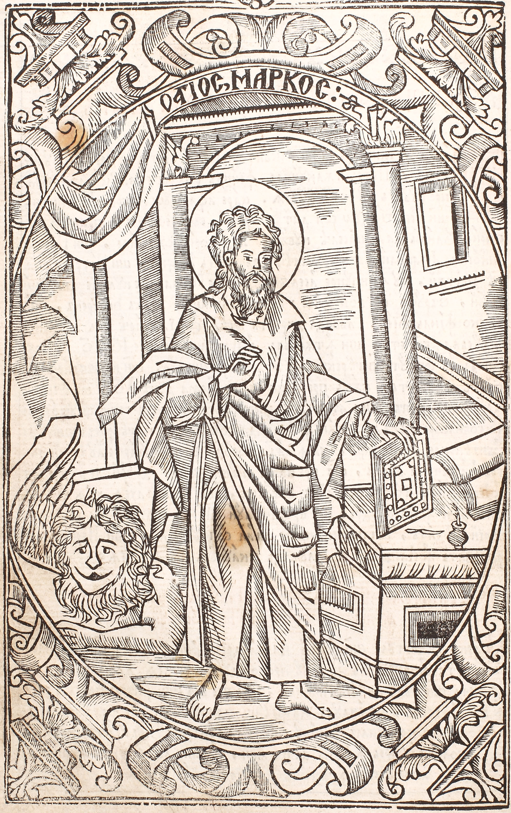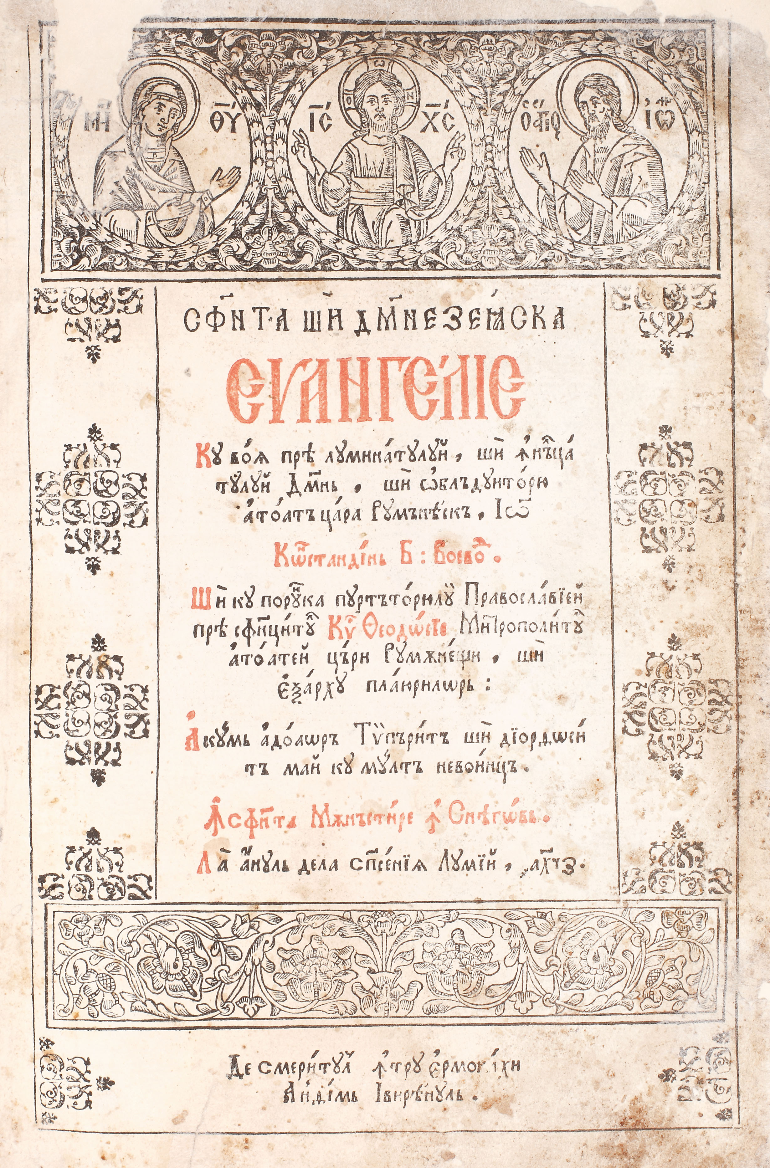 Tipărită sub patronajul domnului Țării Românești Constantin Brâncoveanu, rolu de editor revenindu-i Mitropolitului Teodosie Veștemeanul. Este prima Evanghelie în limba română tipărită de Antim Ivireanul. El este autorul xilogravurilor, două dintre ele fiind semnate pe filacterele Sf. Evanghelişti Luca şi Marcu cu un „A” pe care îl regăsim şi în alte documente (a se vedea "Hrisovul arhieresc" din 20 iulie 1715). Filele tipărite la 1760 poartă numele lui Iordache Stoicovici. Tiparul este înfrumuseţat cu frontispicii şi cele patru gravuri cu Sf. Evanghelişti în plină pagină. Sunt plăcile cu care s-a ilustrat "Evanghelia greco-română", tot a ierarhului-tipograf Antim. Aceste plăci au servit la alte ediţii ulterioare şi au inspirat pe unii xilografi din secolul al XVIII-lea. Legătură veche, încuietori volum refăcute. Volum restaurat.