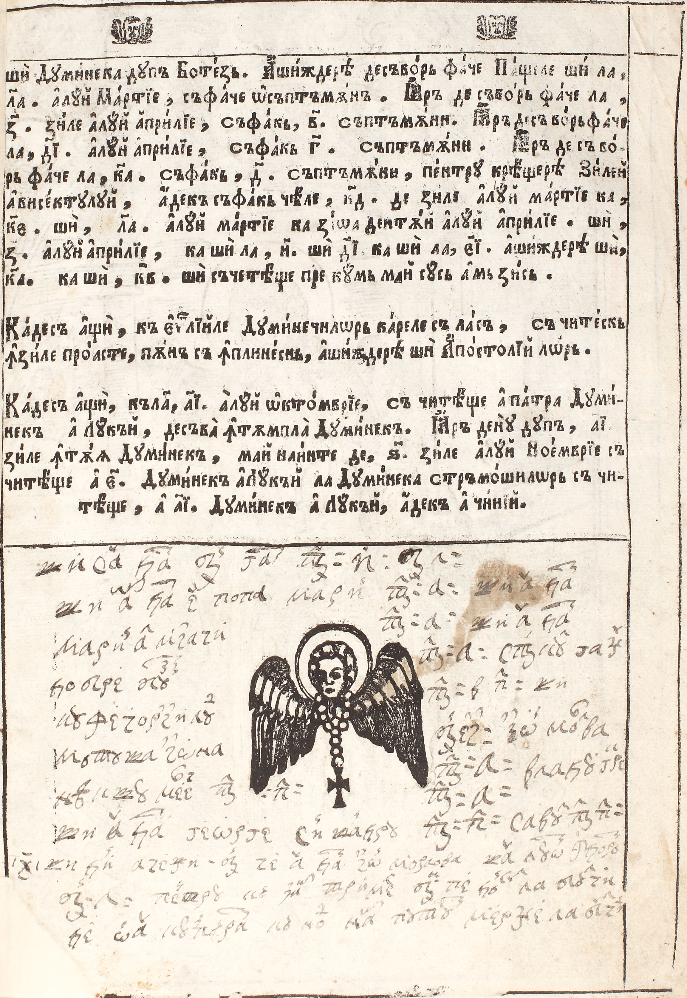 limba română cu caractere chirilice; tipar negru şi roşu; (3) +180 file (din care filele 1, 41, 84, 177, 179-180 au fost înlocuite, la o restaurare, cu file aparținând ediției 1760)