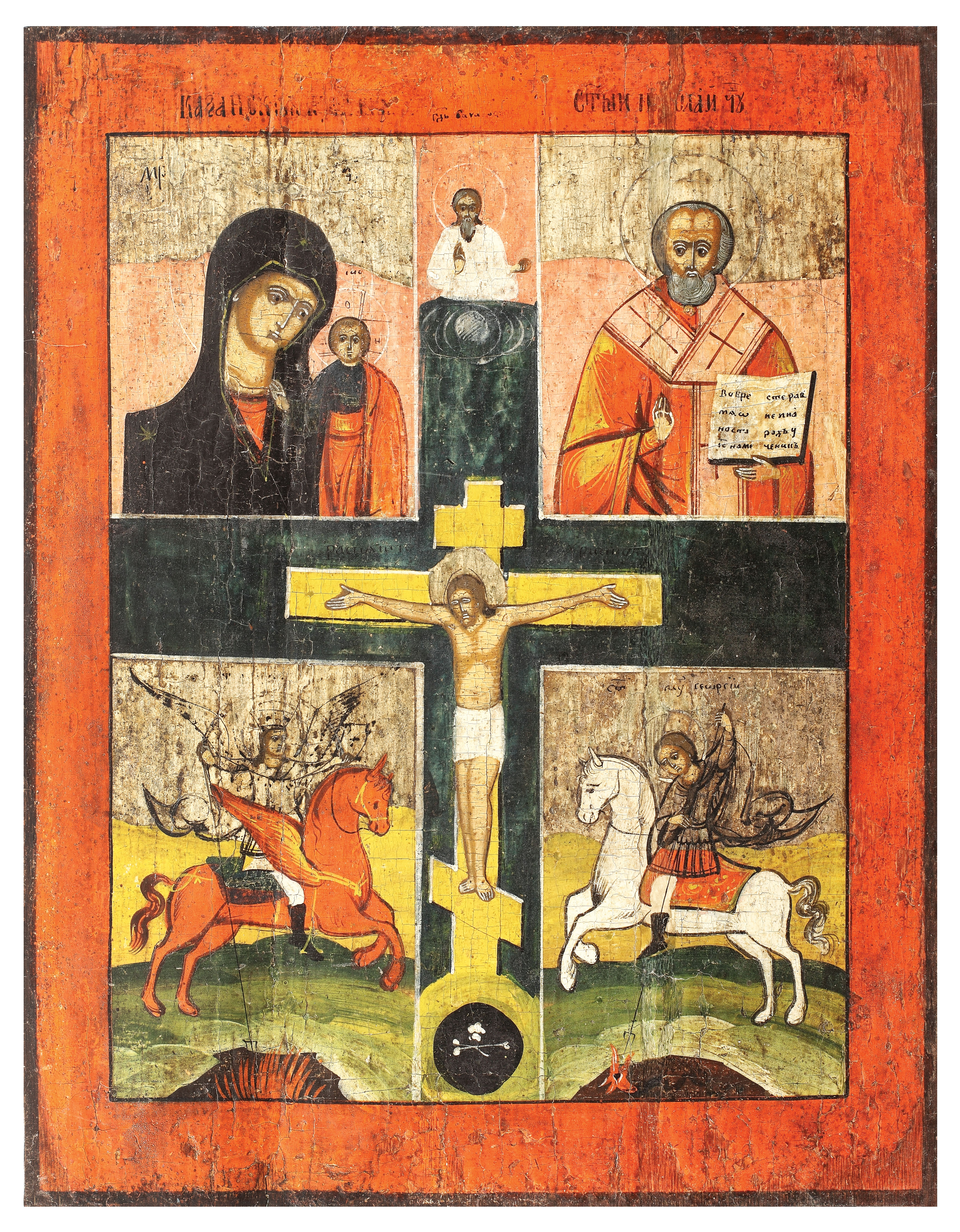 58. Icoană pe lemn, ”Răstignirea, Sfântul Nicolae, Sfântul Teodor, Sfântul Gheorghe și Maica Domnului cu Pruncul”, școală lipovenească, a doua jumătate a sec. XIX