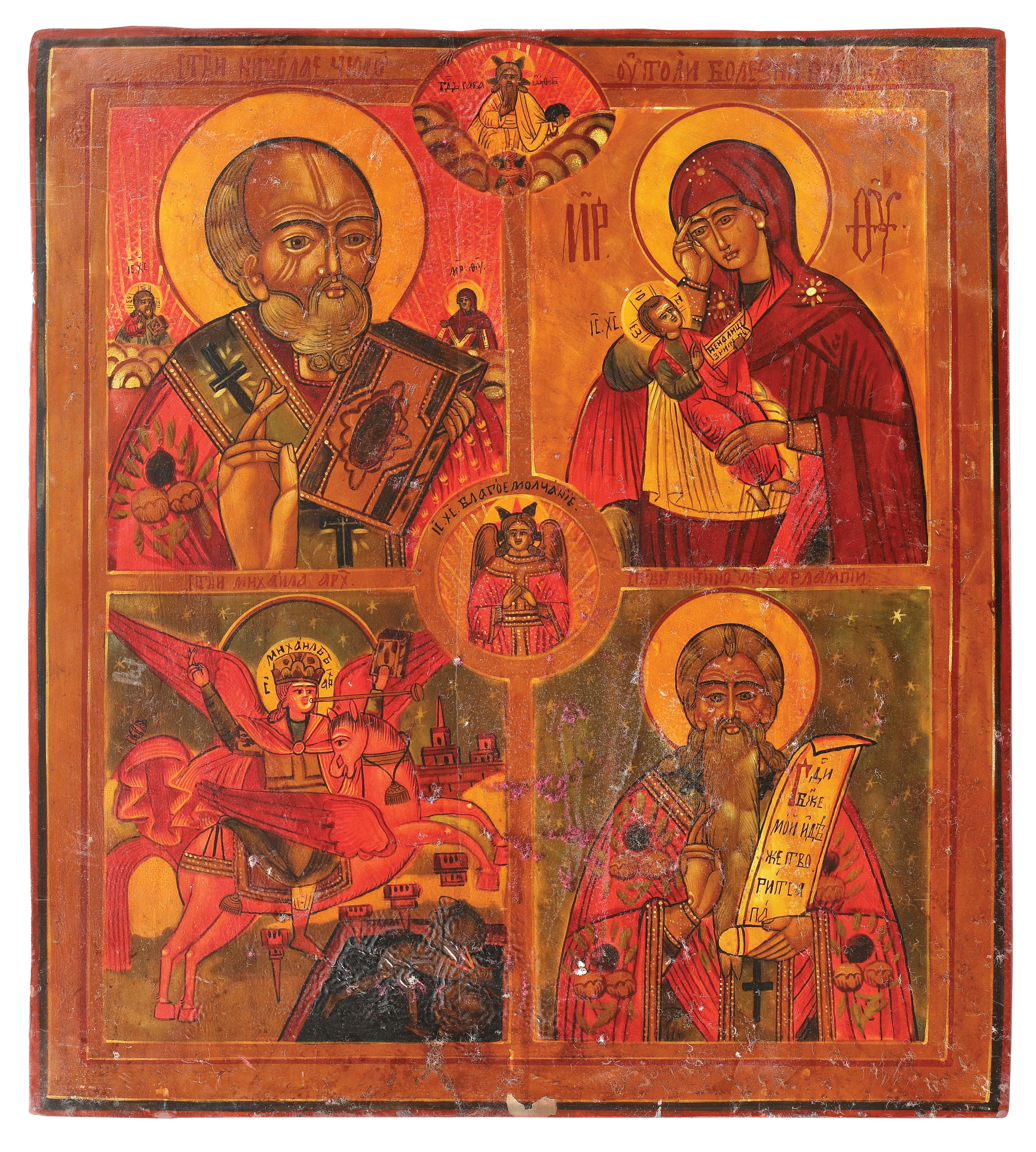 53. Icoană pe lemn, ”Sfântul Nicolae, Maica Domnului cu Pruncul, Arhanghelul călare, Sfântul Haralambie”, atelier rusesc, sec. XIX