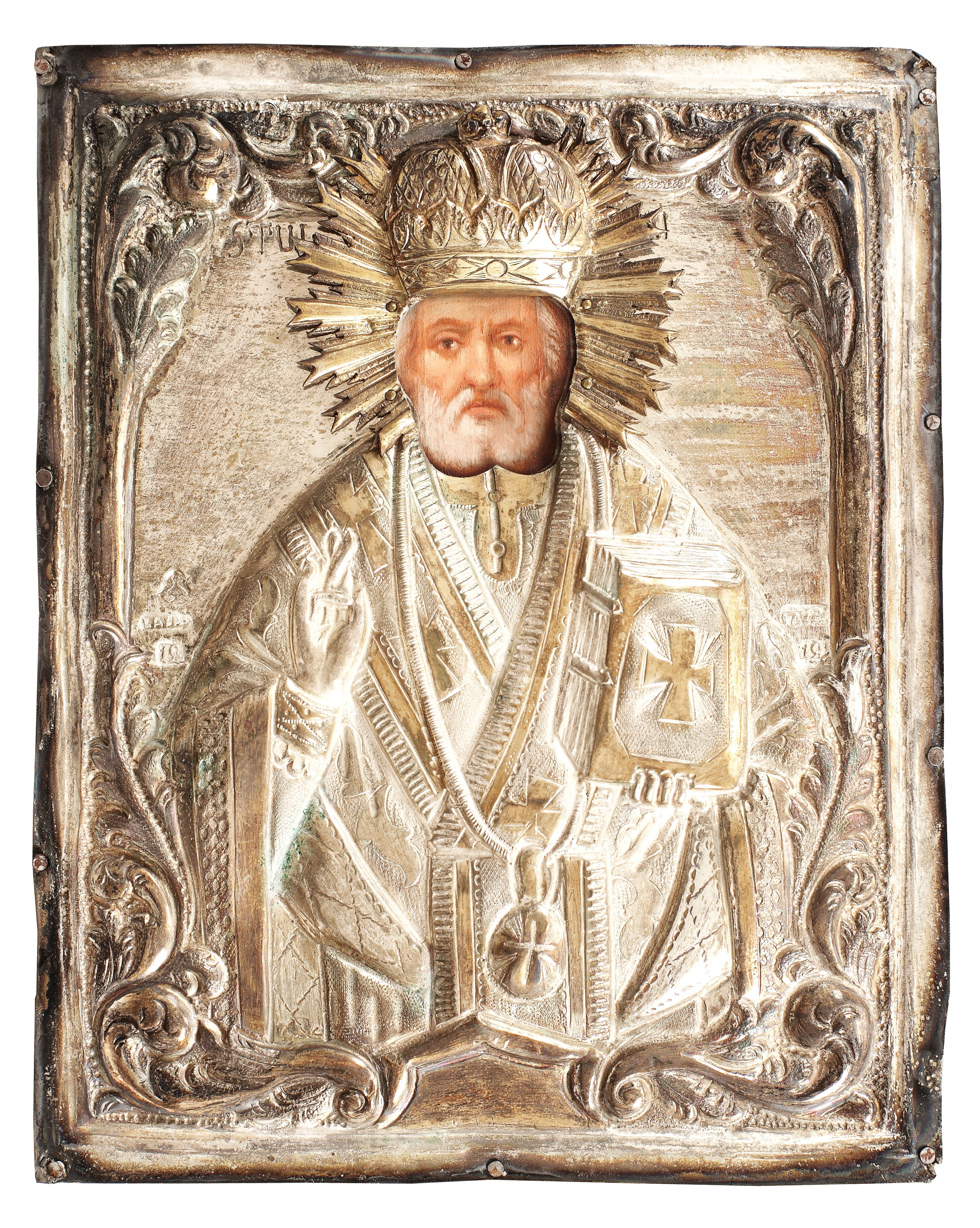 44. Icoană pe lemn, ”Sfântul Nicolae”, școală românească, sec. XIX, cu ferecătură din argint