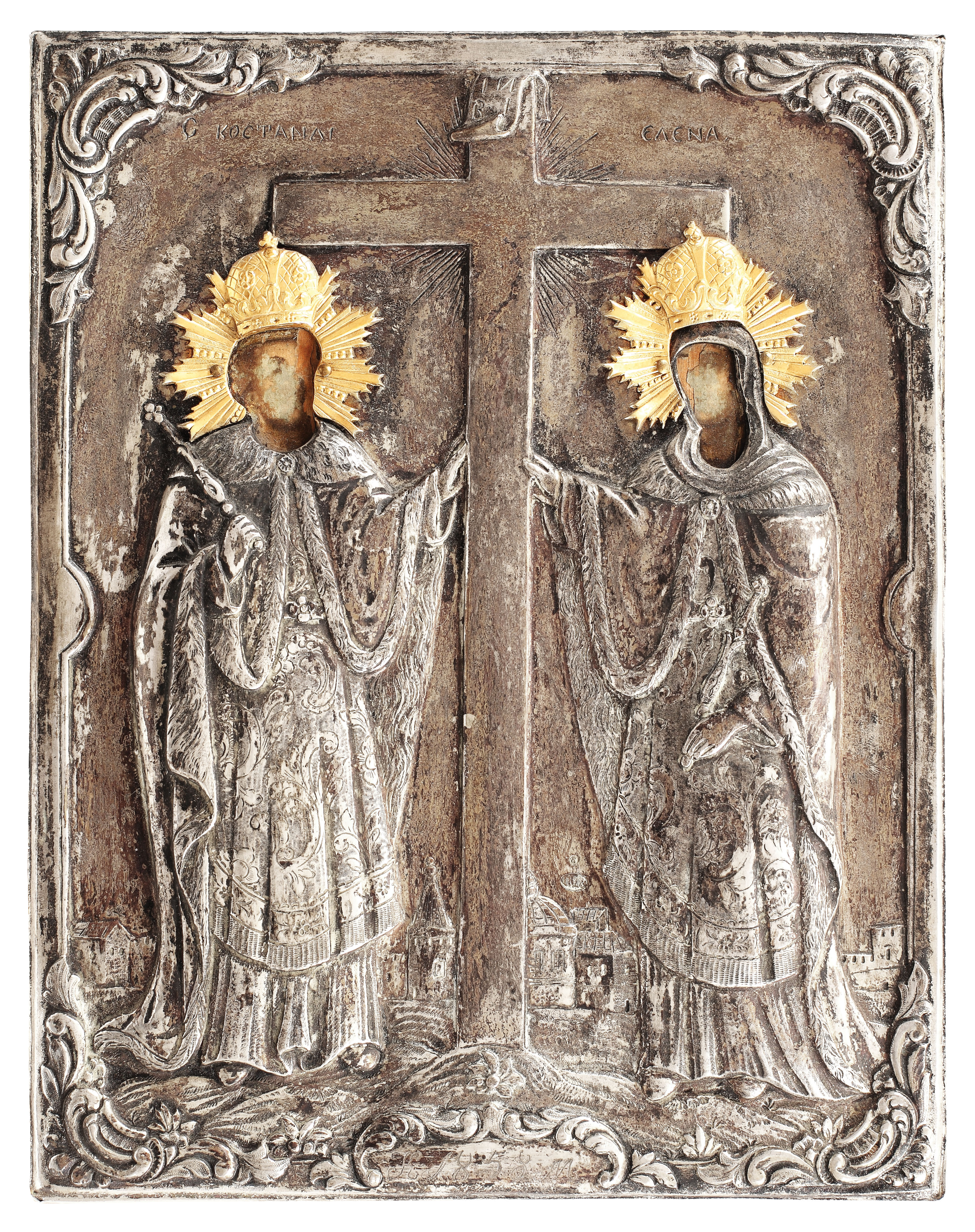 43. Icoană pe lemn, ”Sfinții Împărați Constantin și Elena”, școală românească, 1858, cu ferecătură din argint