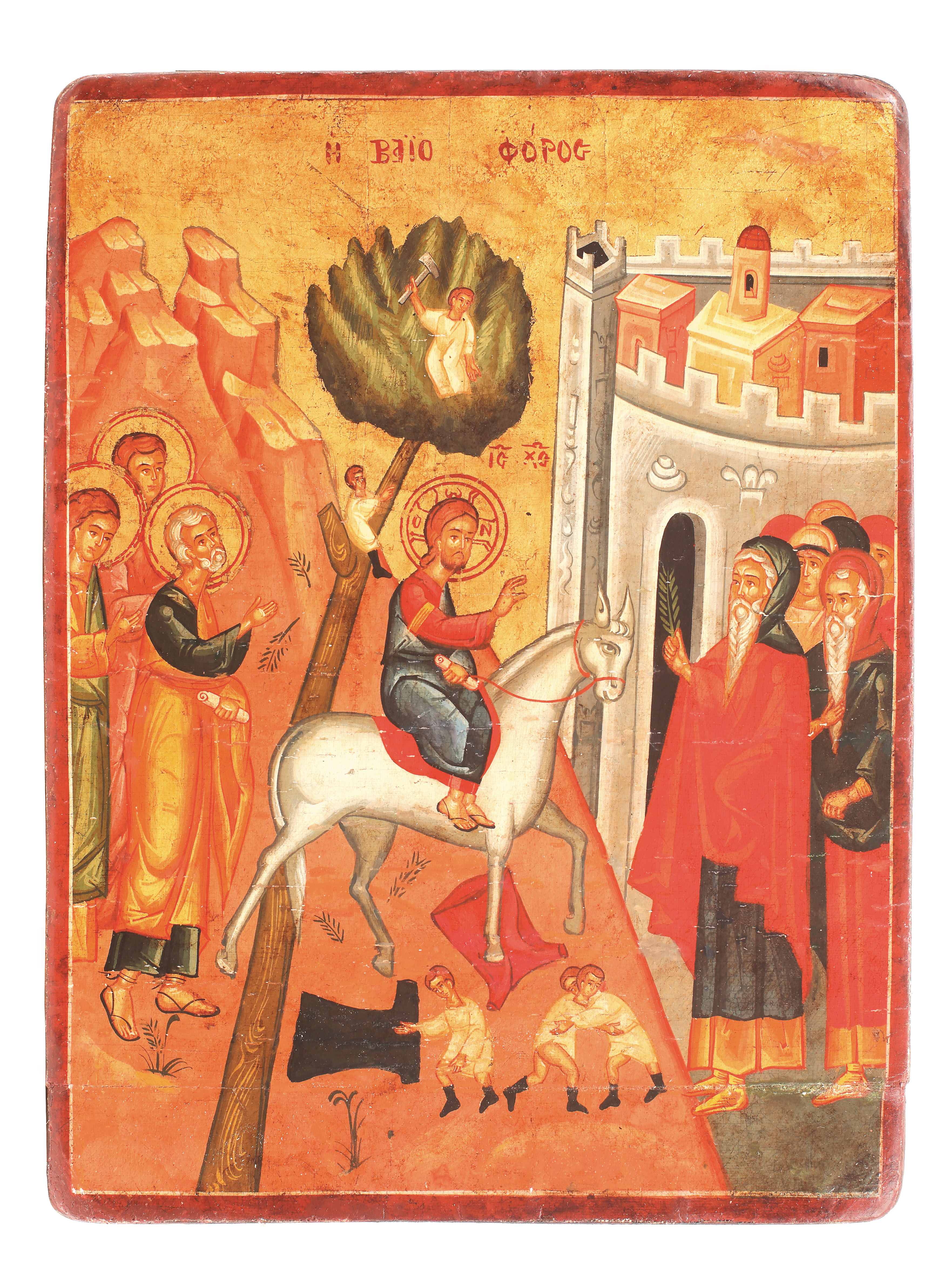 Pe fondul de aur se desfășoară scena obișnuită: Iisus Hristos călare pe asin, urmat de Apostoli, este întampinat la intrarea în Ierusalim cu mare cinstire și bucurie. Populația ține în mâini ramuri de finic iar copiii aștern veșminte la picoarele lui Iisus călare. Compoziția, modelul chipurilor personajelor, cromatica și drapajul veșmintelo se înscrie în pictura brancovenescă de sec. XVIII.
