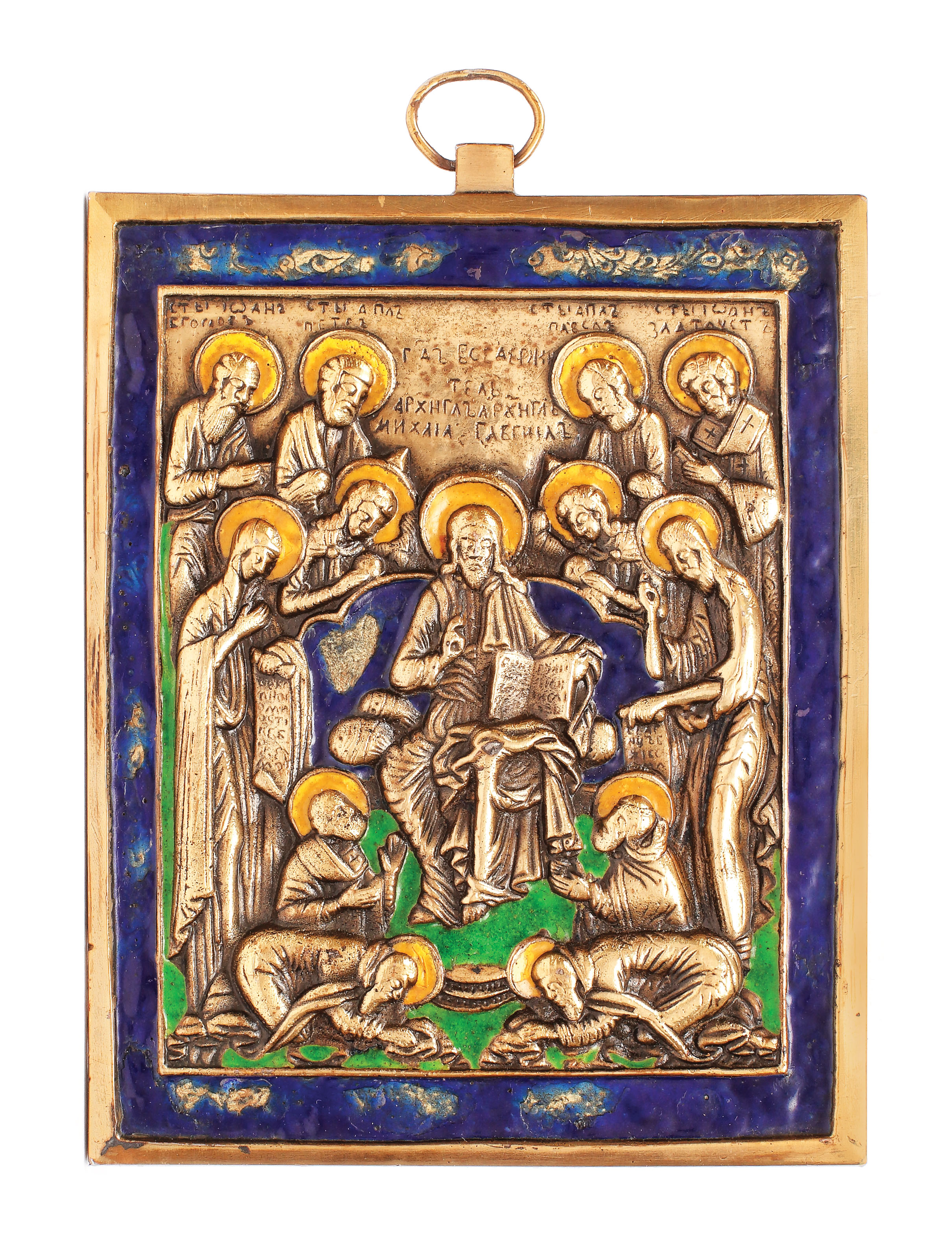 165. Iconiță, ”Iisus Hristos Pantocrator”, redat în jilț, cu Evanghelia, înconjurat de Maica Domnului și Sf. Ioan Botezătorul, atelier rusesc, sec. XIX