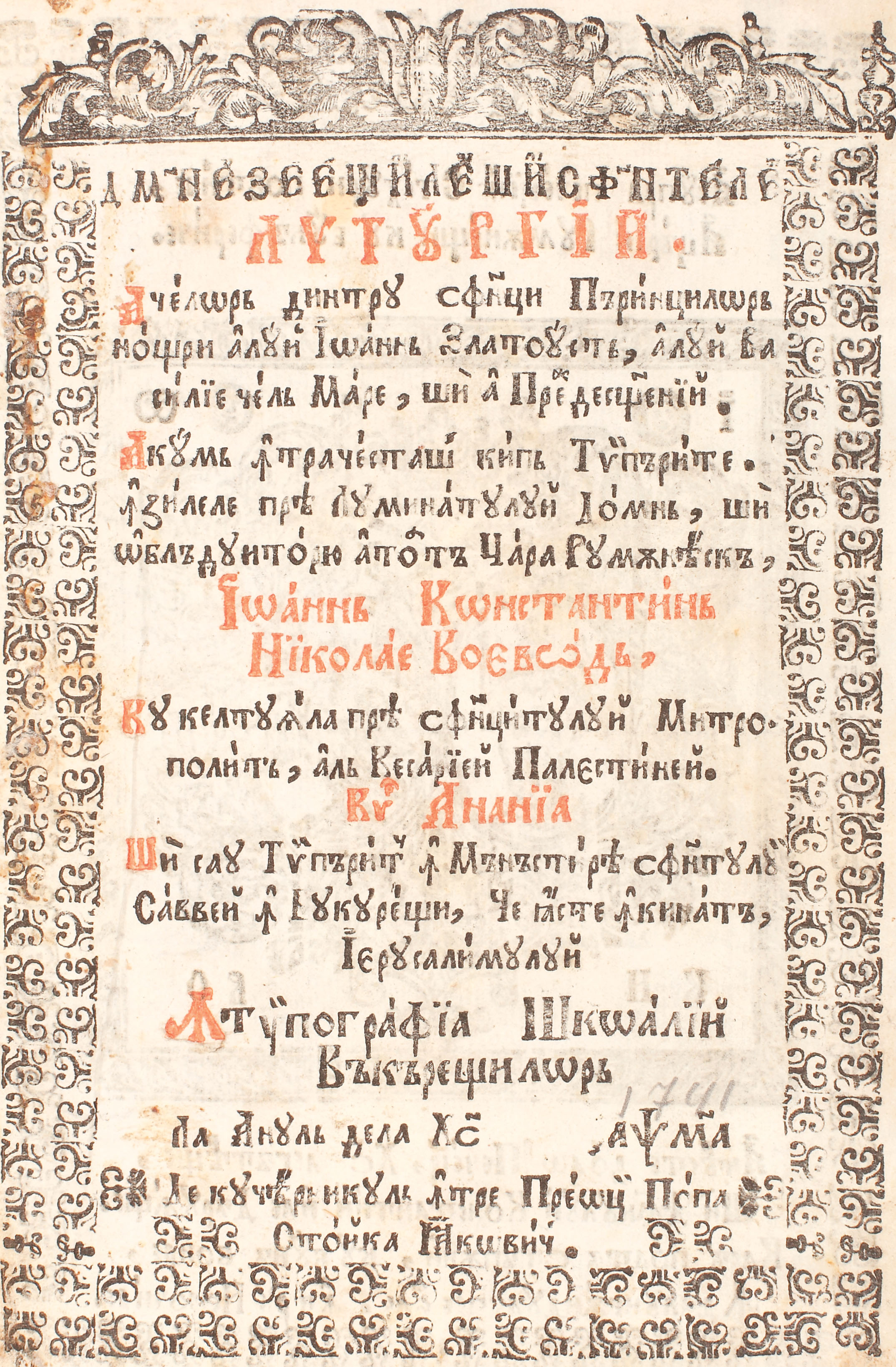 96C. ”Liturghie” din vremea lui Nicolae Mavrocordat, Bucureşti, 1741