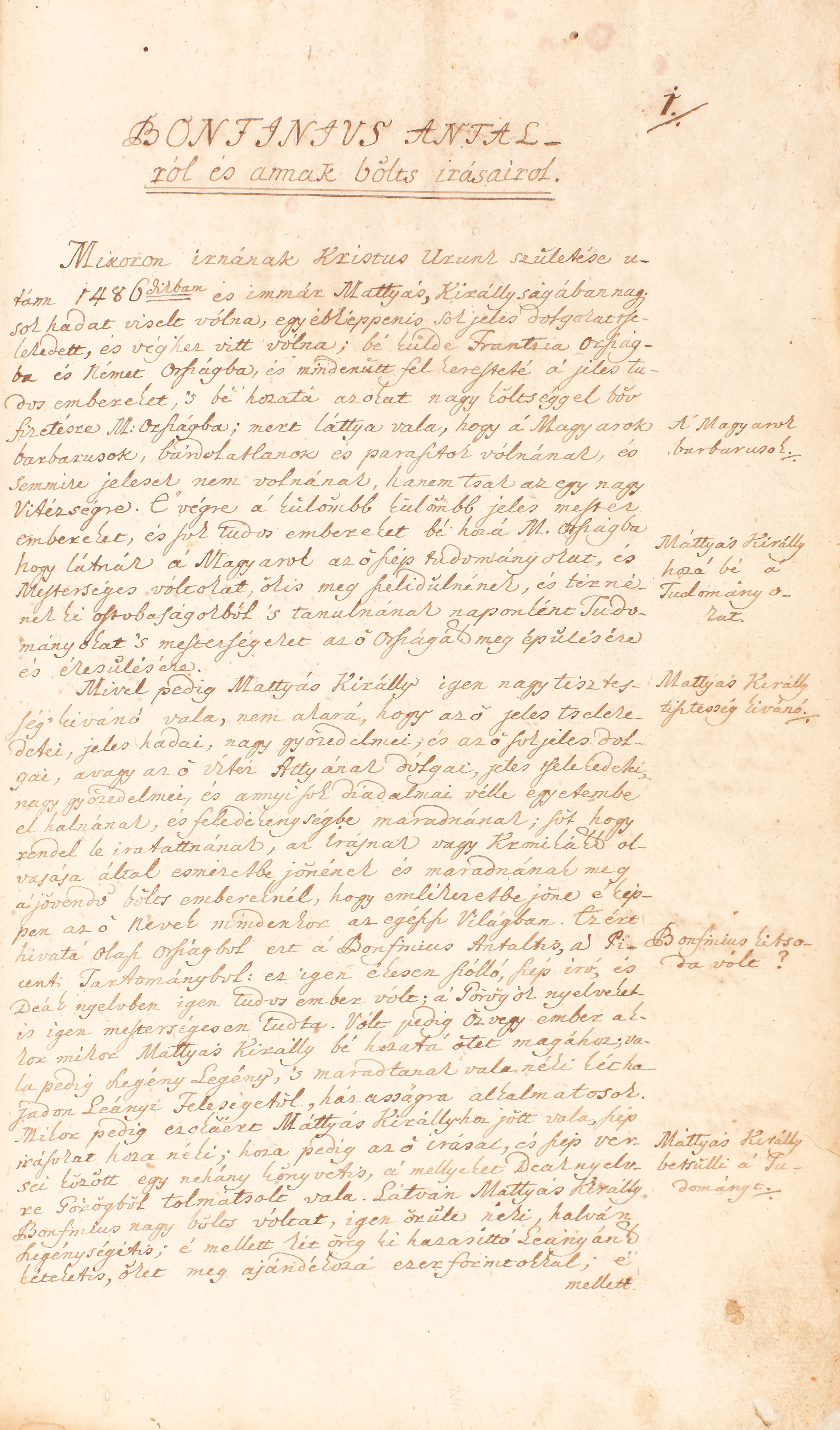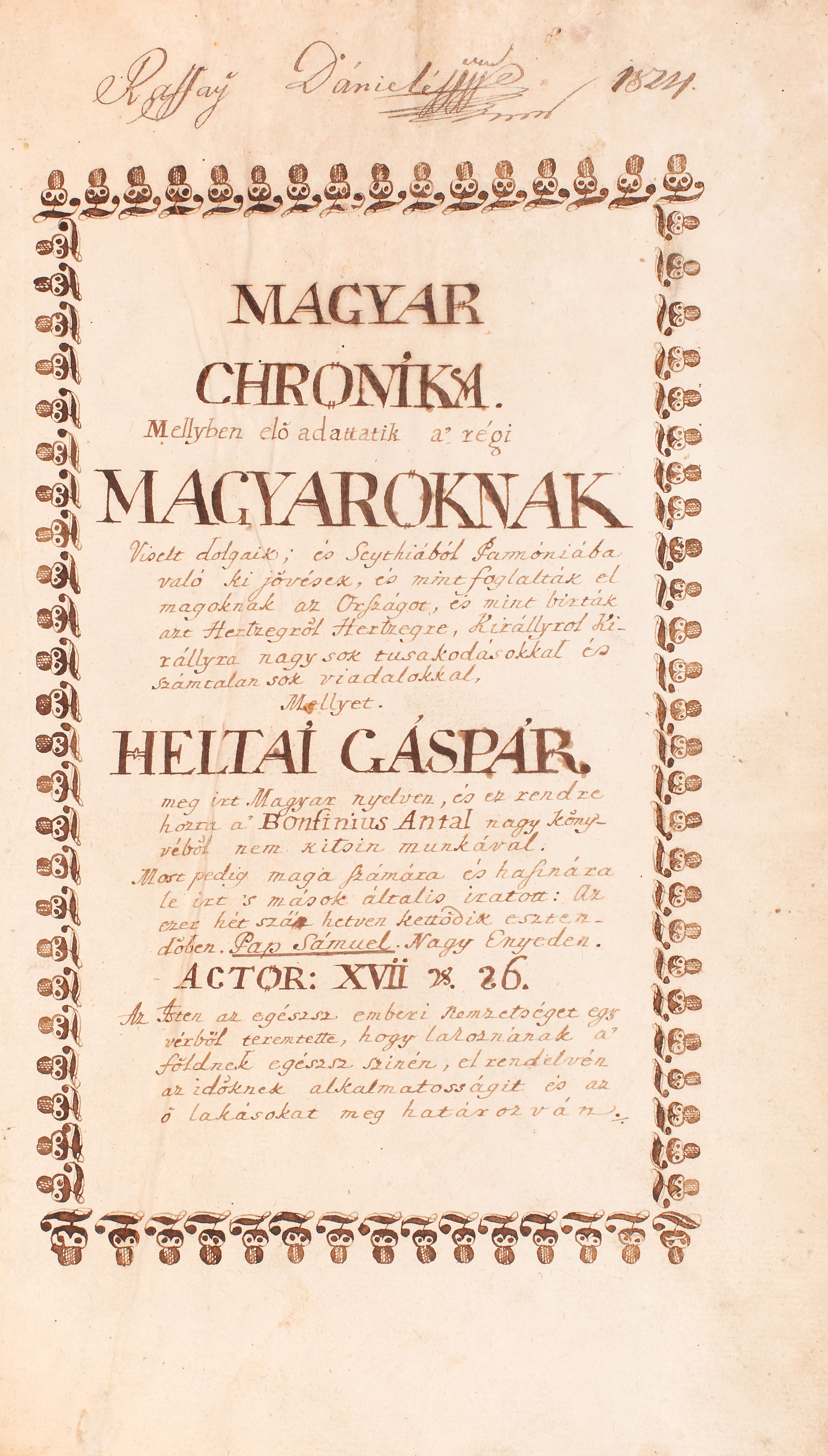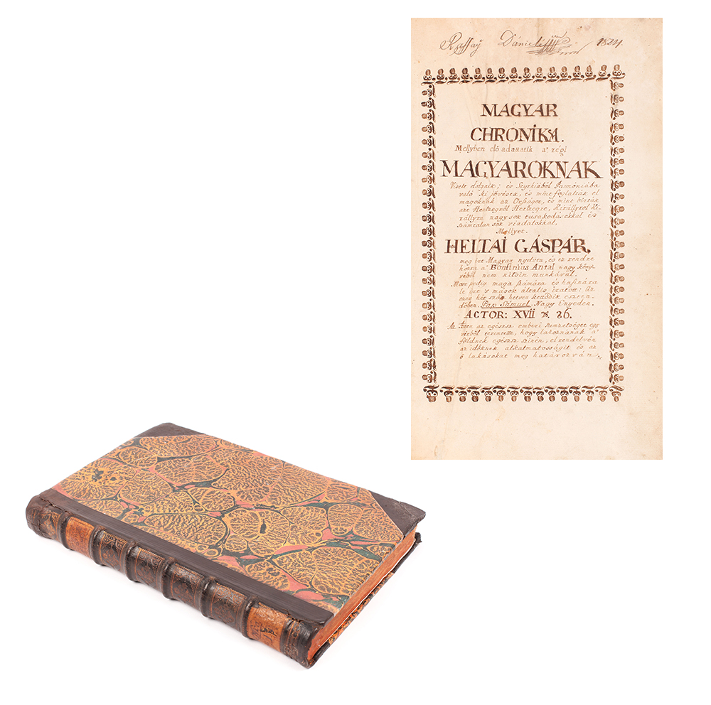 Manuscrisul "Cronică despre faptele ungurilor; Cum au descălecat ei din Sciția cea Mare în Pannonia" reprezintă o copie destul de fidelă a Cronicii maghiare ("Chronica az Maggyaroknac dolgairol") tipărite la Cluj de istoricul Heltai Gáspár, născut la Sibiu, preot la Cisnădioara și la Cluj. Scrierile sale au inspirat Palia de la Orăştie, 1582. Cronica vorbeşte despre continuitatea daco-romană în Dacia, că românii din Ardeal sunt urmașii romanilor, despre originea românească a lui Iancu de Hunedoara, despre războiul regelui Carol cu voievodul Basarab, despre descălecarea lui Bogdan-Vodă, despre războiul regelui Sigismund cu voievodul Ștefan cel Mare, despre lupta de la Nicopole, despre Dracula-Vodă și captivitatea acestuia la Buda, despre războiul lui Matei Corvin și Ștefan cel Mare, despre victoriile lui Ștefan asupra turcilor etc. şi alte evenimente privitoare la Moldova şi Valahia şi, desigur, se poate lectura o prezentare detaliată a istoriei maghiarilor. Totuşi, copia de faţă mai conţine mici interpolări, rezumate şi unele puncte de vedere originale. Grafica specifică scrierii din Epoca Luminilor. Autorul, locul şi anul copierii textului sunt redate în foaia de titlu: Pap Samuel, Aiud, 1772. Legătură de epocă: colţari şi cotor piele cu ornamente aurite, hârtie în câmpuri. Stare de conservare generală bună.