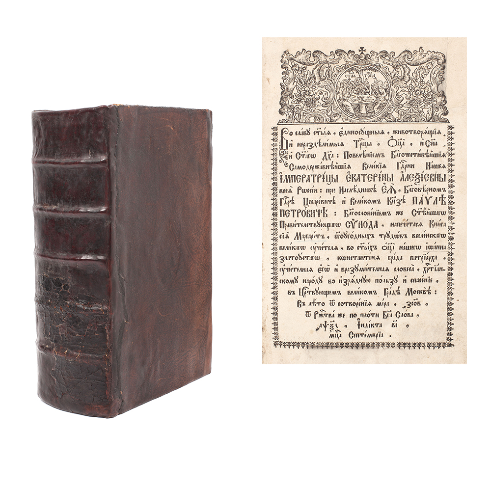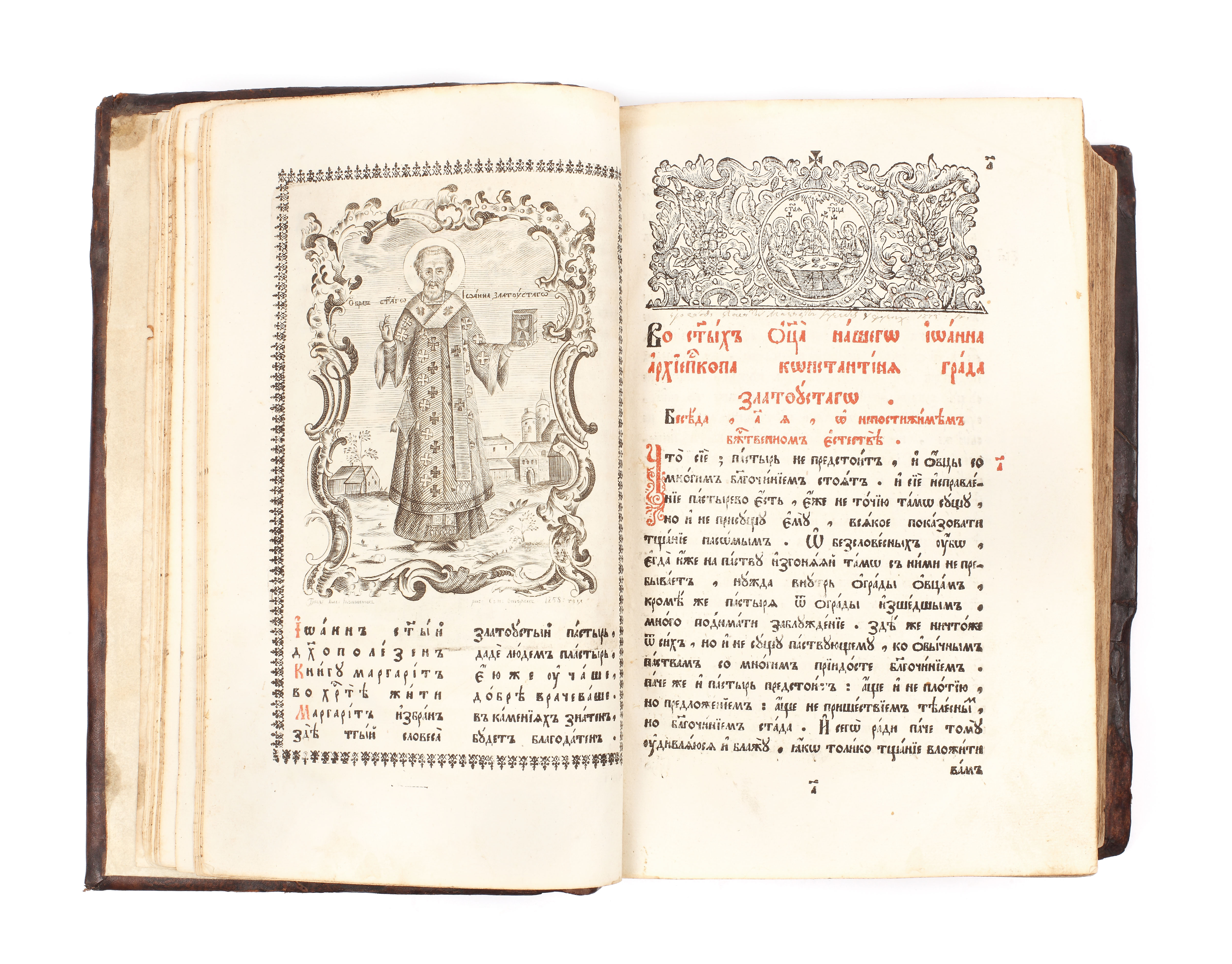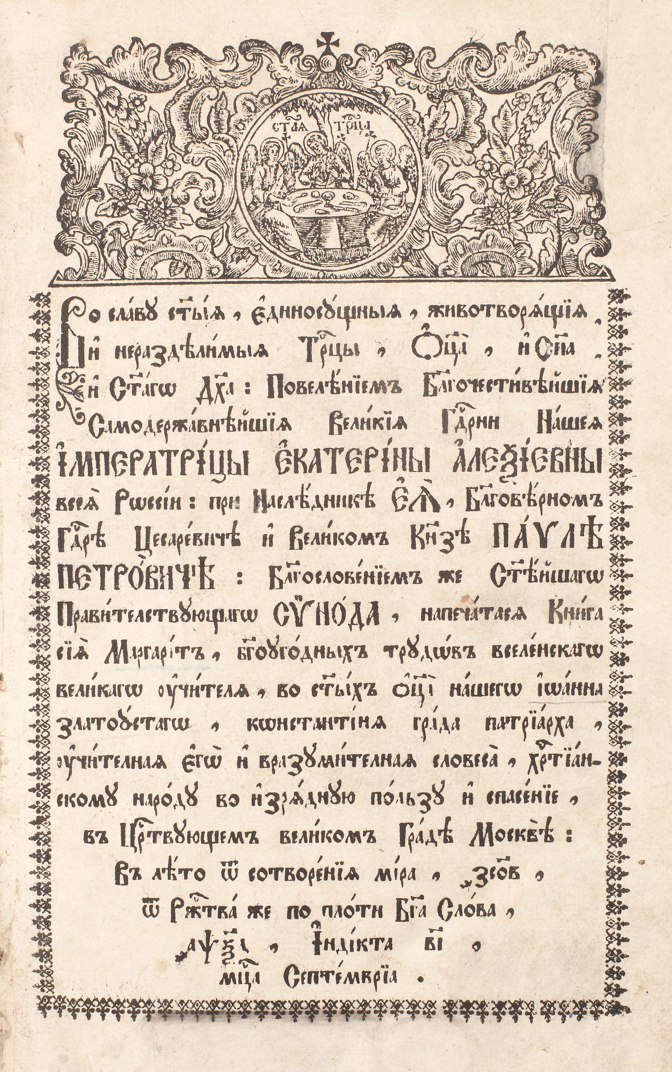 Apare în timpul domniei Ecaterinei cea Mare a Rusiei (Ecaterina a II-a). Volumul conţine scrieri dispuse în partide de text paginate separat. Pe foaia de titlu o frumoasă xilogravură cu Sf. Treime. Gravură în cupru a Patriarhului Ioan Zlatoust al Constantinopolului, semnată de artistul rus Vasilii Iconicov, 1758. Lucrare voluminoasă, tipar cu negru, legătură în piele, stare bună de conservare.