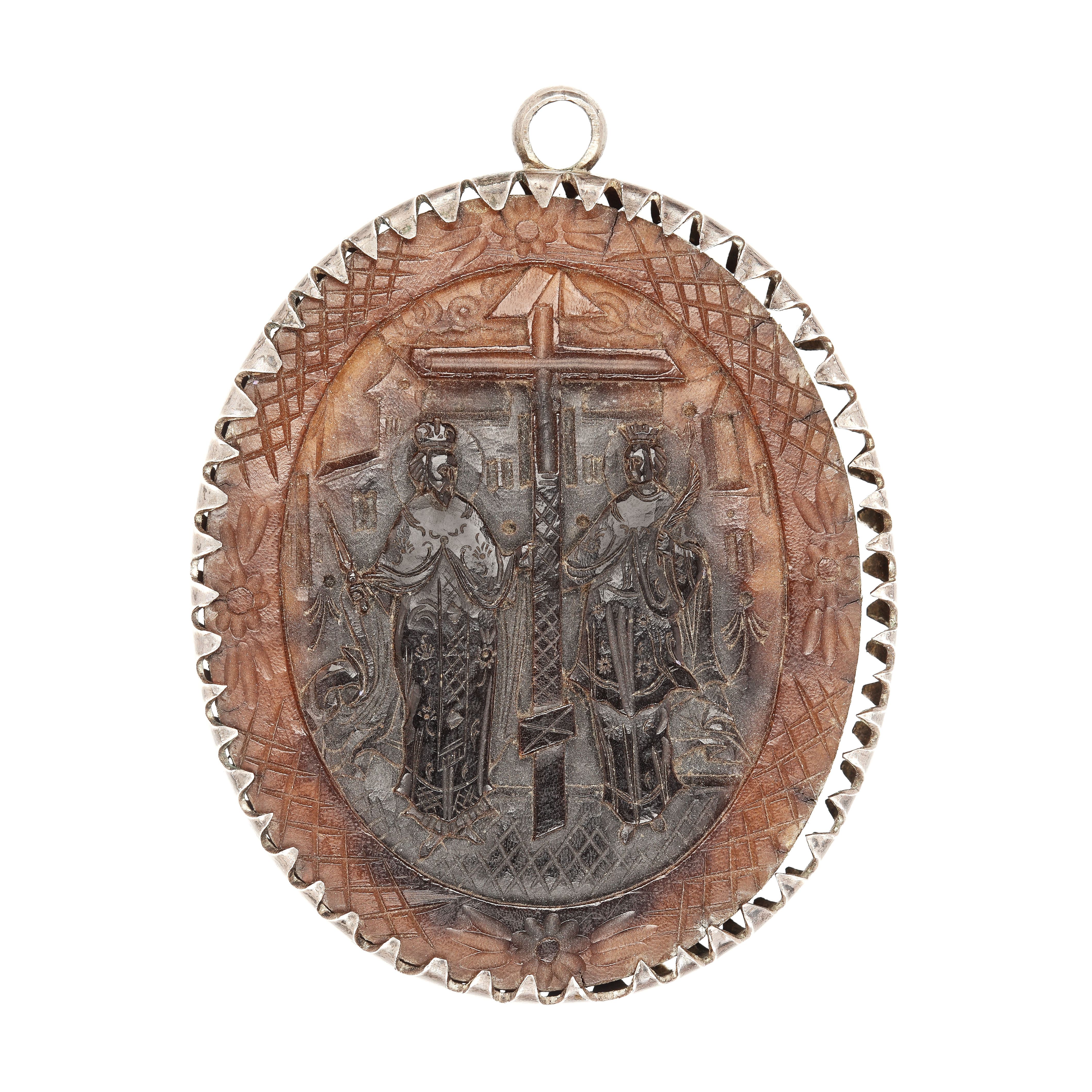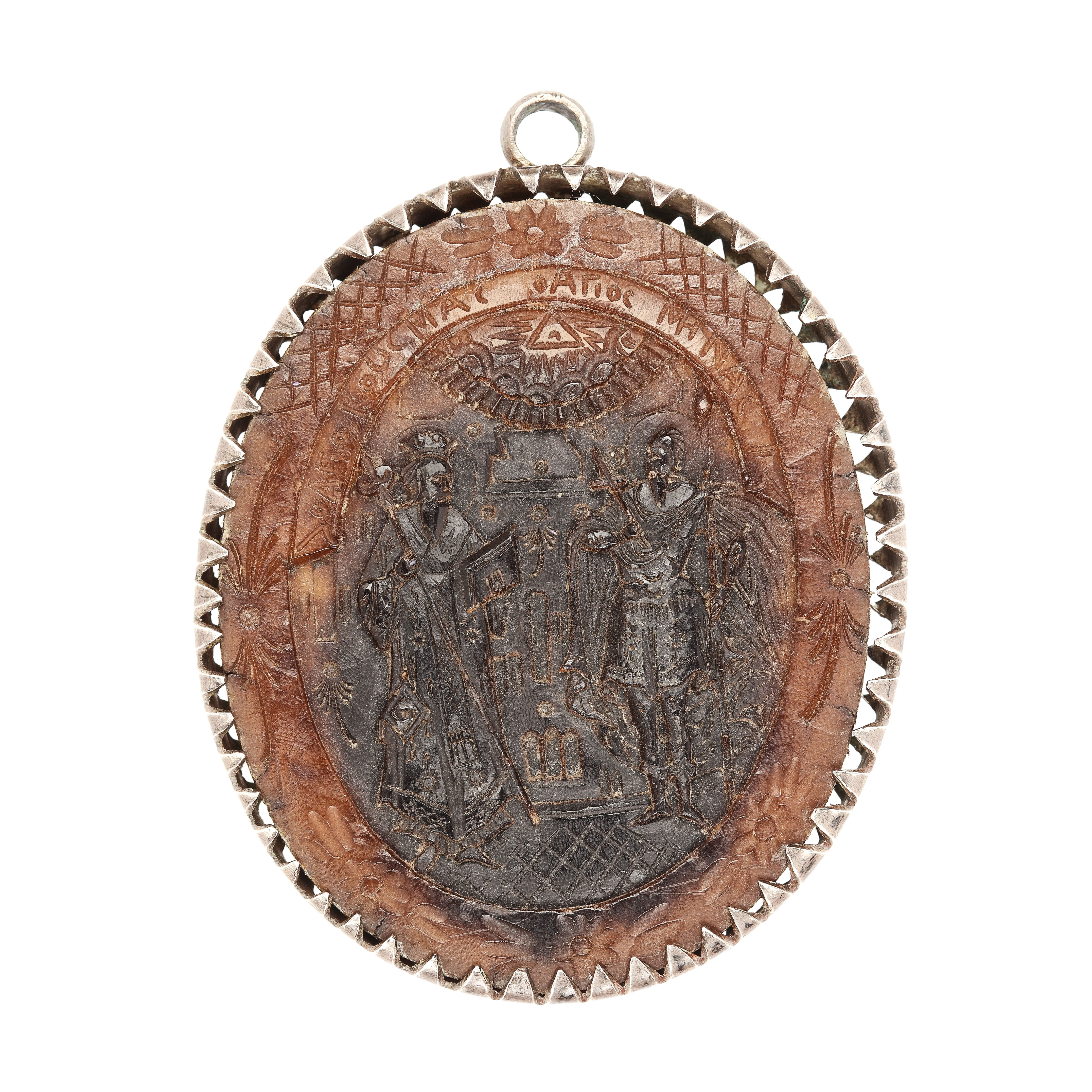155. Medalion-icoană grecească cu scenele Sfinții Împărați Constantin și Elena și Sfinții Cosma și Mina, sculptată în corn, în montură din argint, sec. XIX