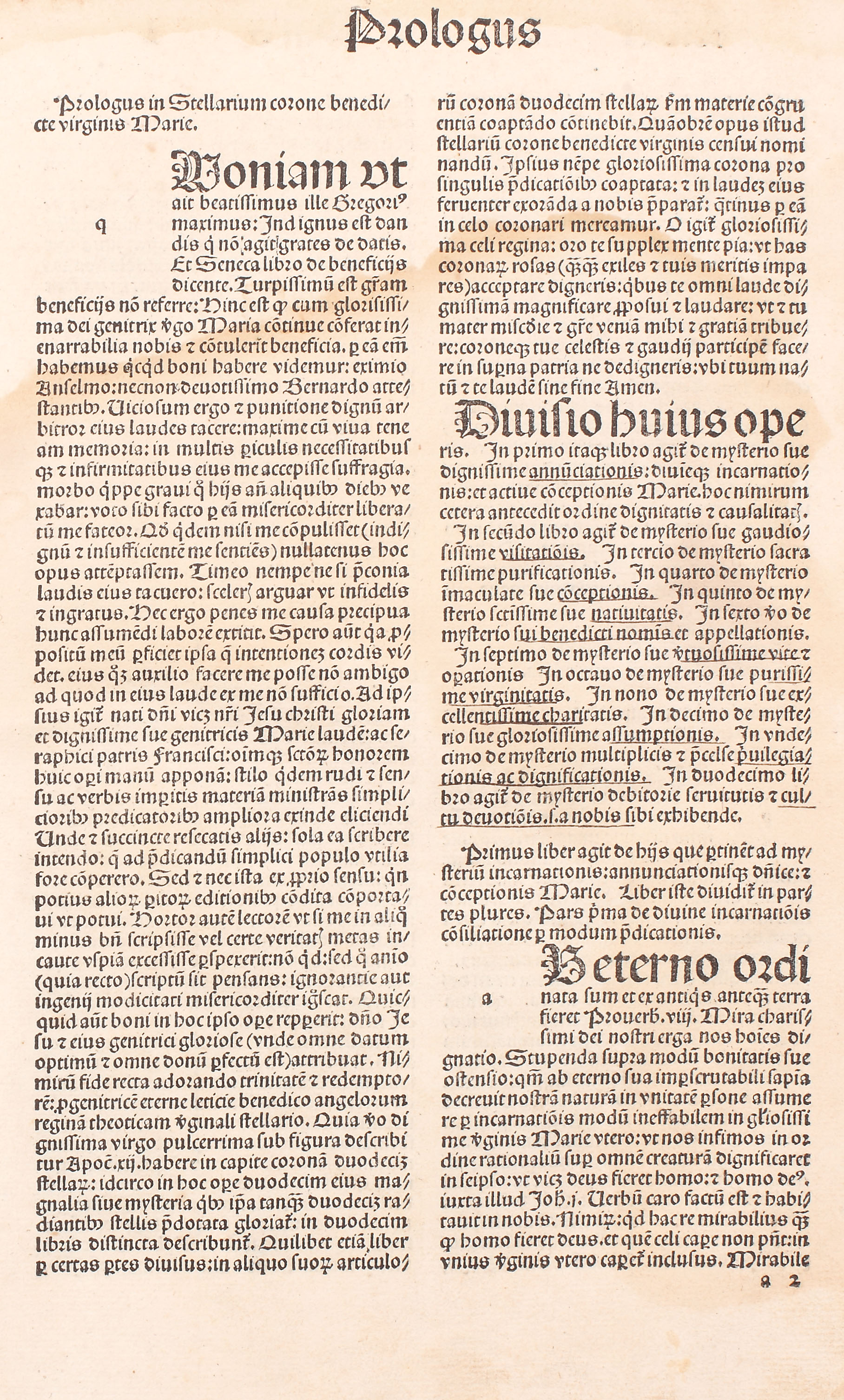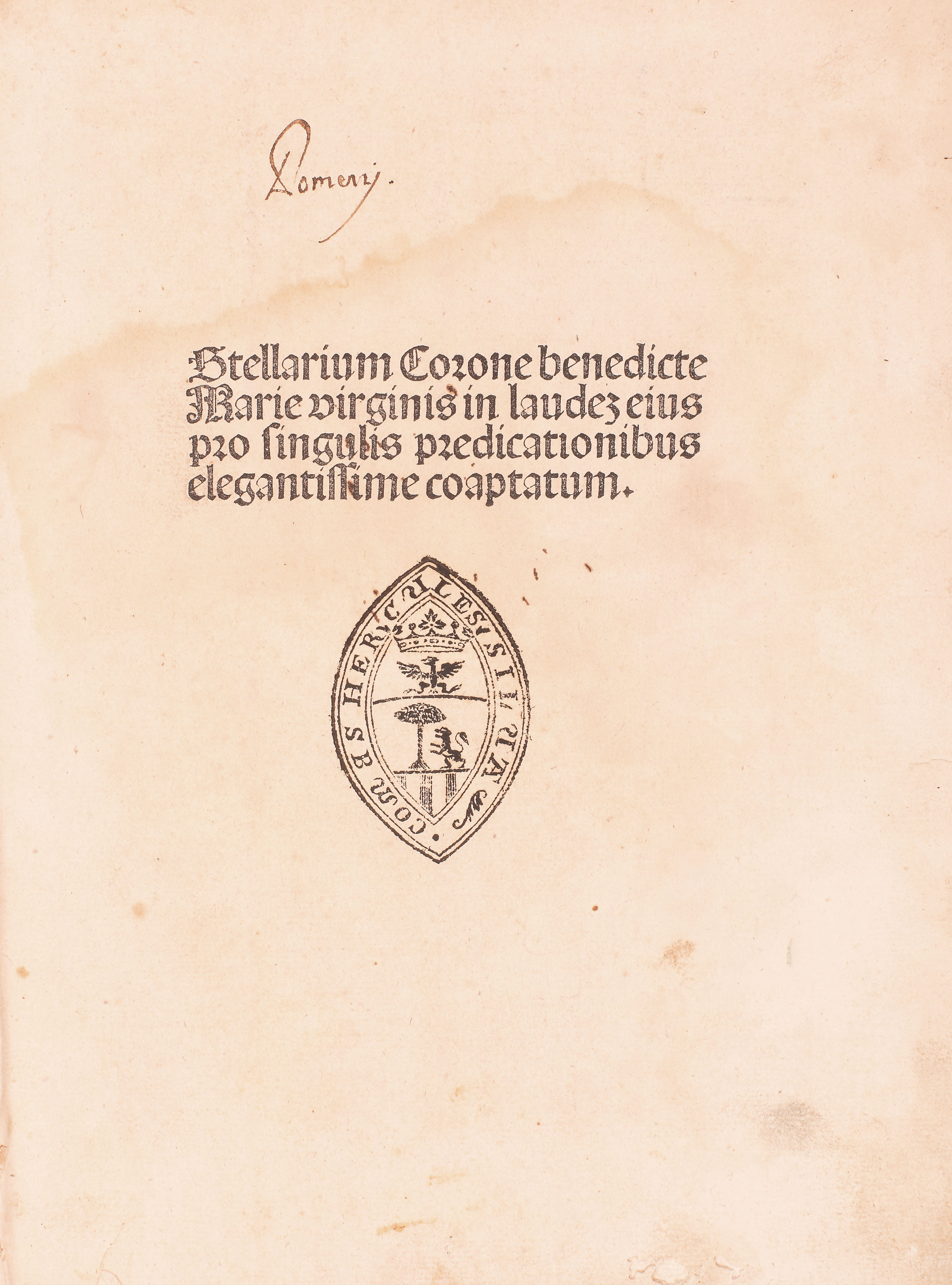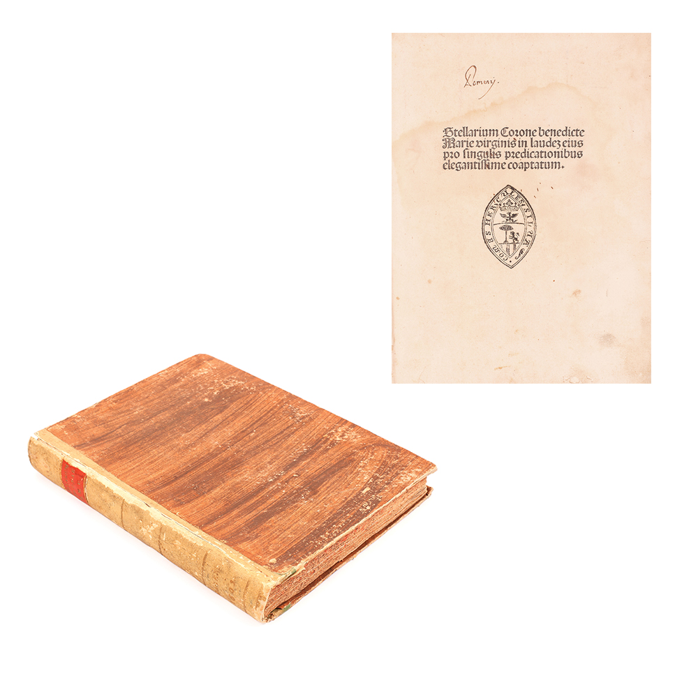 "Stellarium Corone Beate Virginis Mariae" este scrisă de teologul și filozoful catolic ungur Pelbartus Ladislau (1430-1504), născut la Timişoara (Themeswar), în regatul lui Matei Corvin, în semn de mulţumire că a scăpat în chip miraculos de ciumă în 1479-1480. Școlit la Cracovia, unde pe la 1463 a obținut licența în teologie, apare menționat în 1483 în Analele comunității franciscane de la mânăstirea Sf. Ioan din Buda (capitala lui Matei Corvin). La scurt timp, scrierile sale au intrat în atenția tipografilor europeni, prilejuind numeroase ediții. La finalul cărţii se află colofonul cu repere privitoare la editare și imprimare. Legătură recentă, din carton şi hârtie decorativă cu etichetă pe cotor conţinânt titlul. După 500 de ani cartea se află în stare bună de conservare.